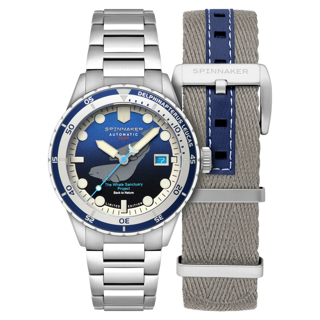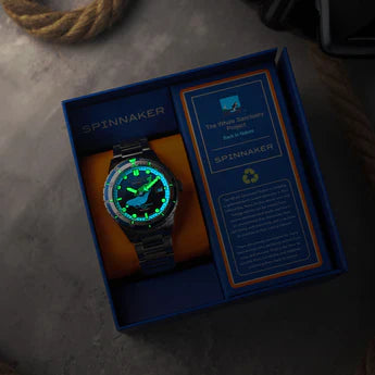 De Hass Automatic Whale Sanctuary Project Limited Edition is een eerbetoon aan de majestueuze bewoners van de oceanen, de walvissen, en belichaamt Spinnakers geest van het combineren van stijl met milieubewustzijn. Met deze gelimiteerde oplage van 450 stuks is elk horloge een eerbetoon aan zeedieren en levert het tegelijkertijd hoogwaardige prestaties.