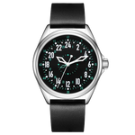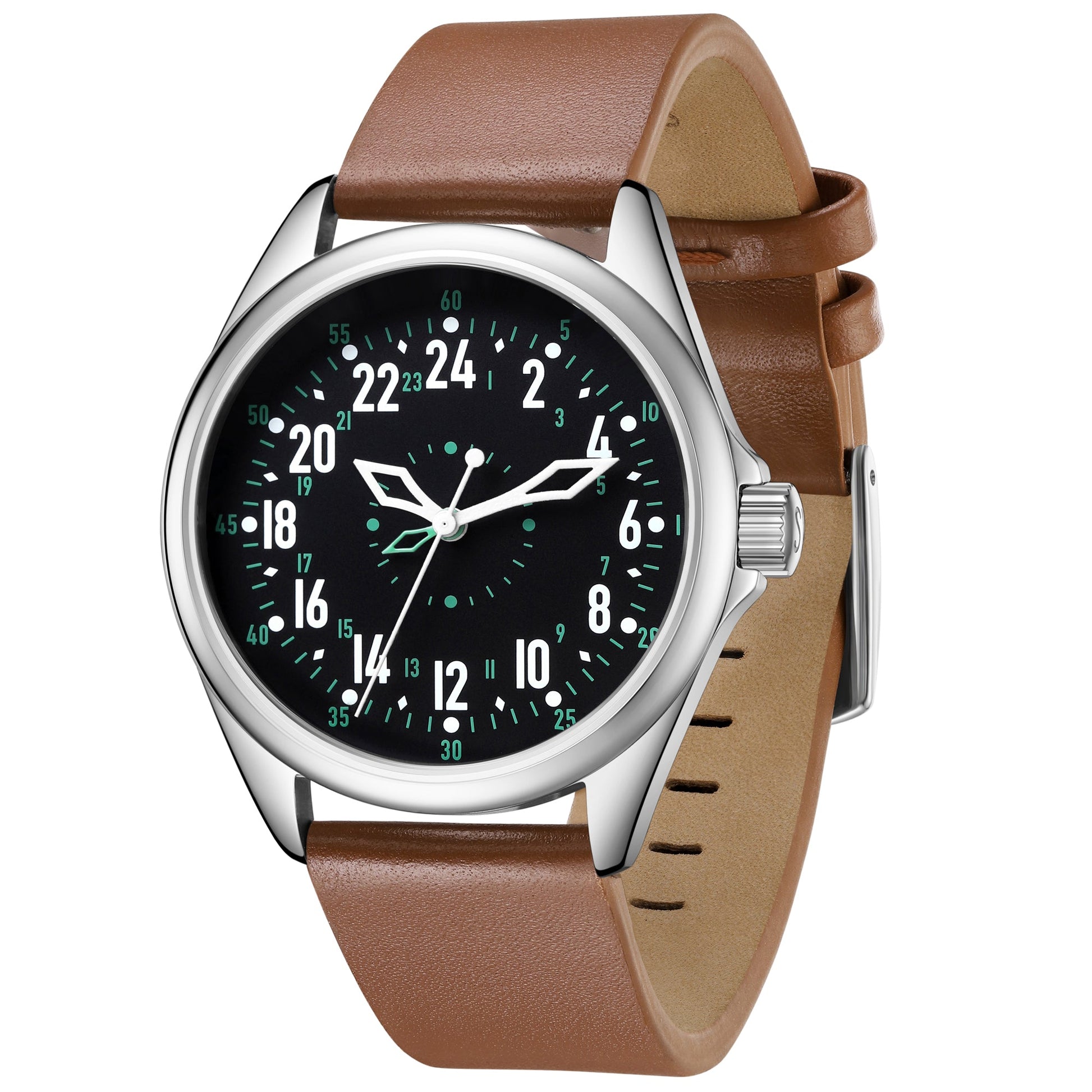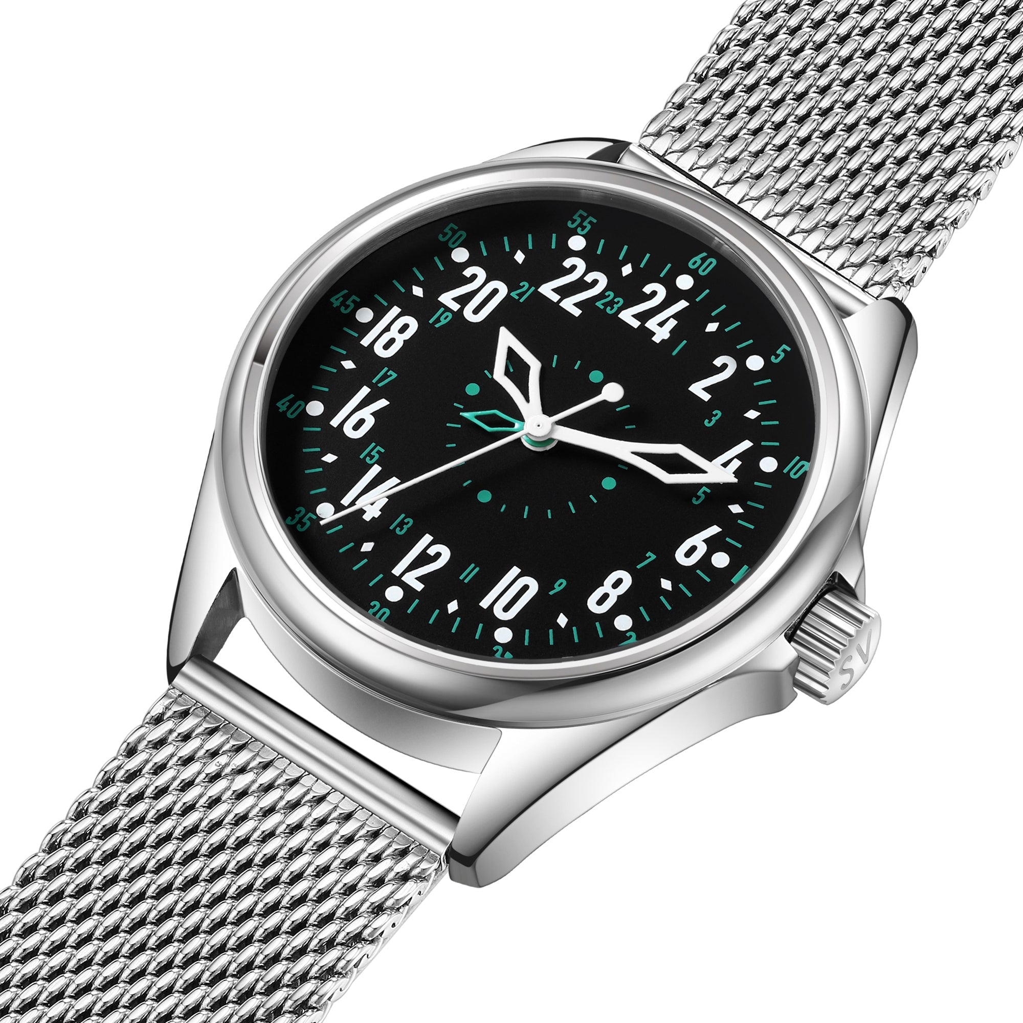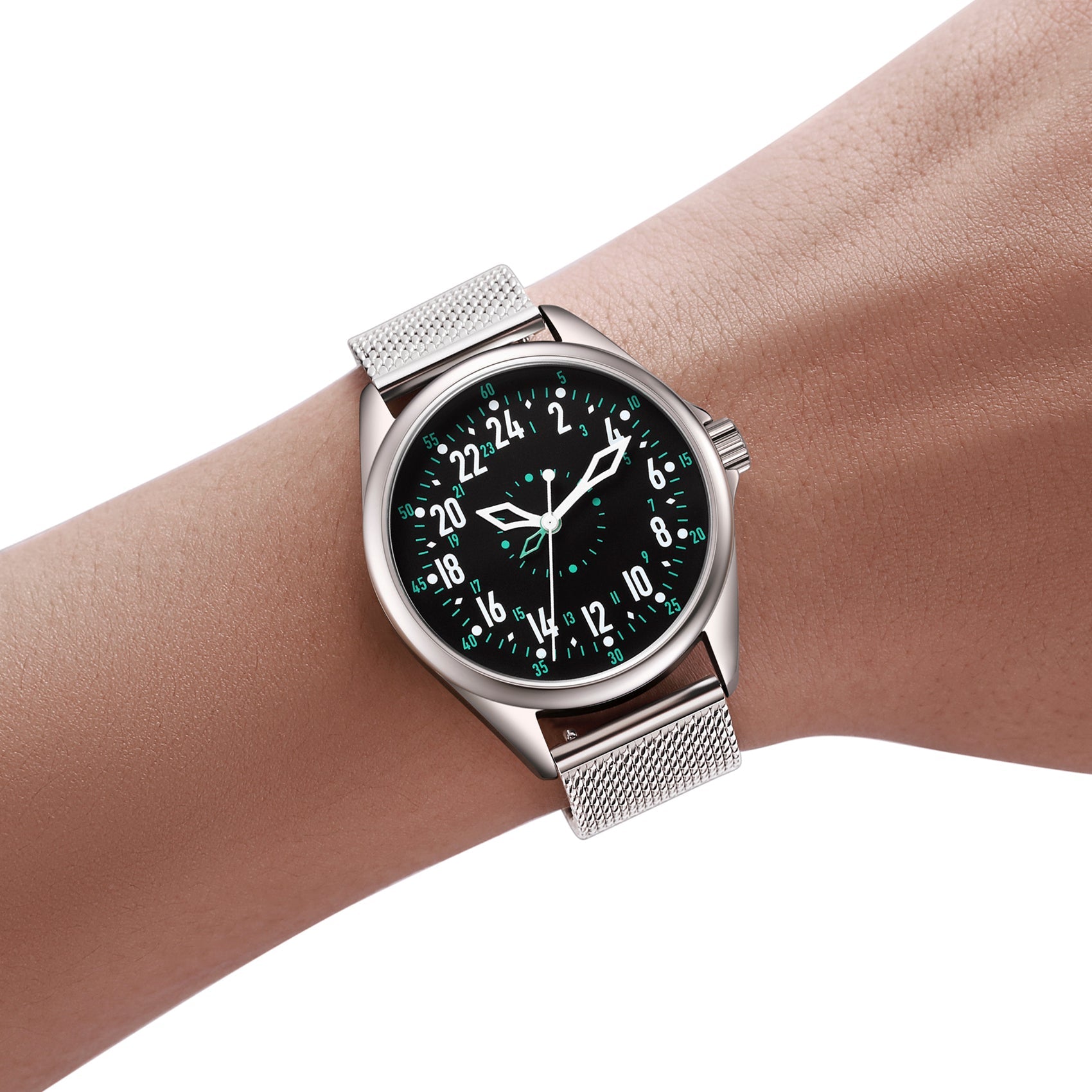 • Wijzerplaat : Zwart met witte cijfers (licht oplichtend) en groene indexen