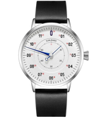 - Matte zilveren wijzerplaat met zwarte en rode cijfers.