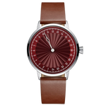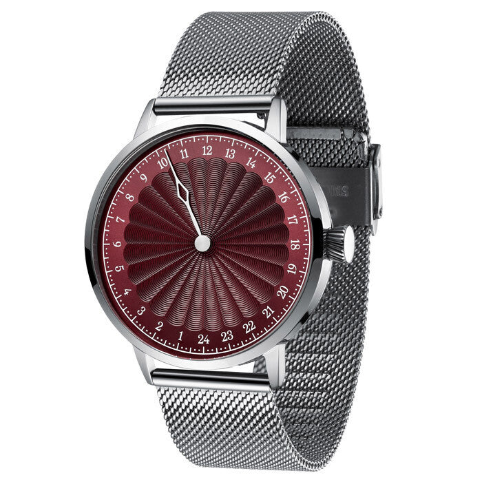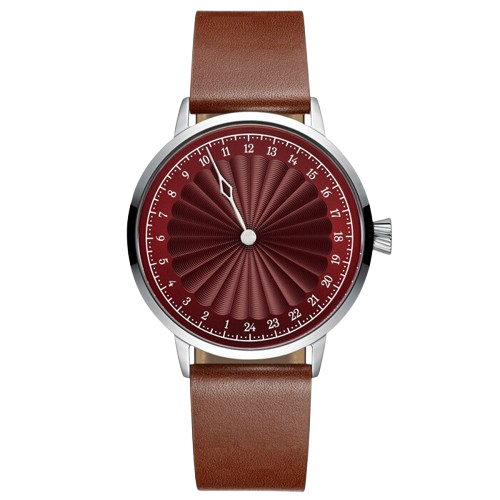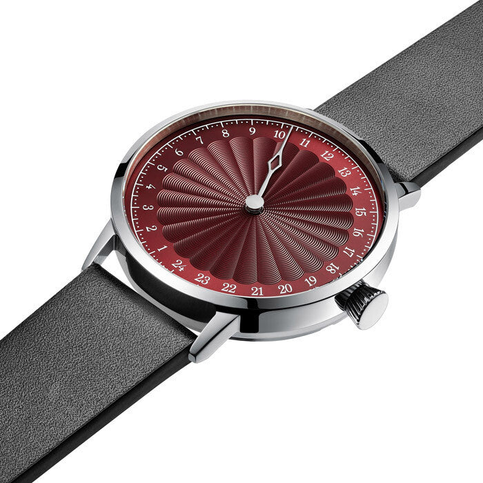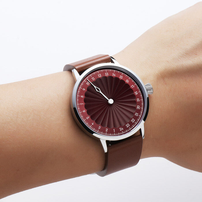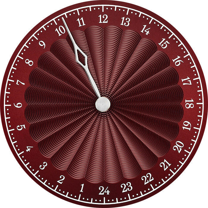 • Wijzerplaat : Donkerrode wijzerplaat met een patroon van 24 ingedrukte segmenten, die de belangrijkste momenten van de dag weerspiegelen.