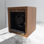 Een watchwinder is een apparaat dat is ontworpen om automatische horloges te laten lopen wanneer ze niet worden gedragen. Het simuleert polsbewegingen om ervoor te zorgen dat het horloge nauwkeurig de tijd aangeeft. Dit model heeft een natuurlijke houten afwerking en een zwarte binnenkant, wat zorgt voor een elegante en verfijnde esthetiek. De compacte kast is uitgerust met een discreet en stil draaimechanisme dat functionaliteit en verfijning combineert, ideaal voor verzamelaars en liefhebbers van luxe horloges.