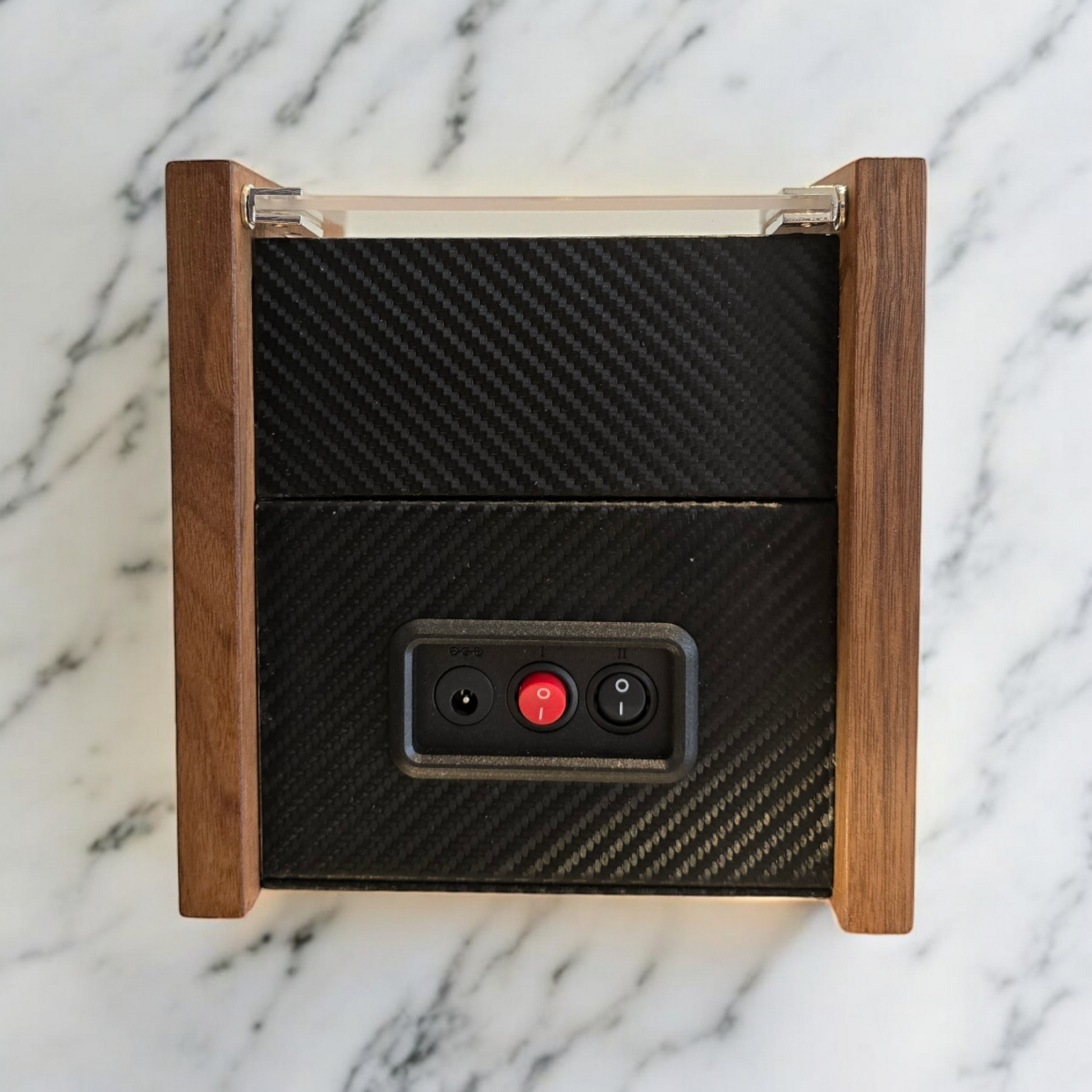 Een watchwinder is een apparaat dat is ontworpen om automatische horloges te laten lopen wanneer ze niet worden gedragen. Het simuleert polsbewegingen om ervoor te zorgen dat het horloge nauwkeurig de tijd aangeeft. Dit model heeft een natuurlijke houten afwerking met een koolstofvezel binnenkant, wat optimale bescherming en een eigentijdse stijl biedt. Het draaimechanisme is discreet en stil, perfect voor verzamelaars en horlogeliefhebbers, en combineert functionaliteit met moderne esthetiek.