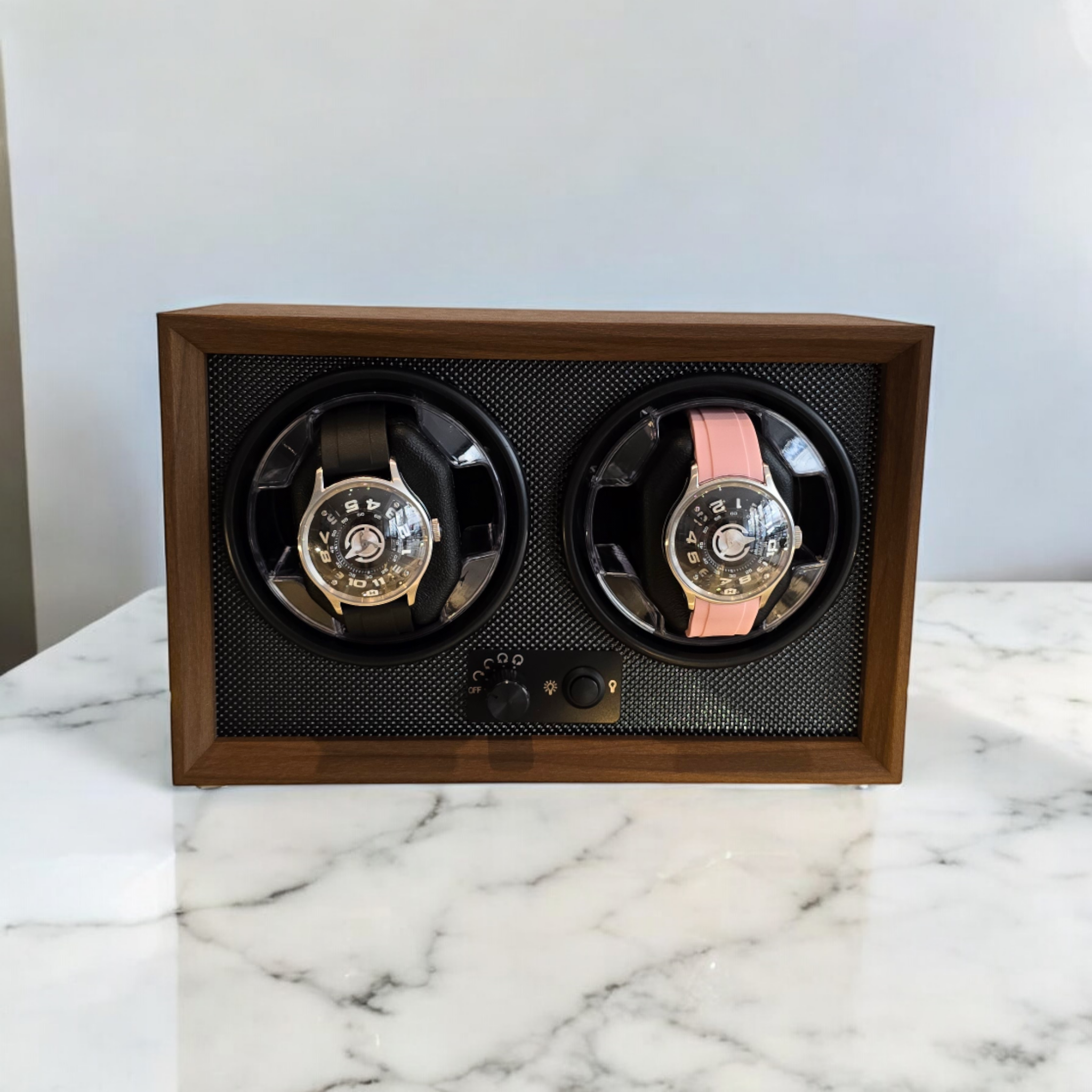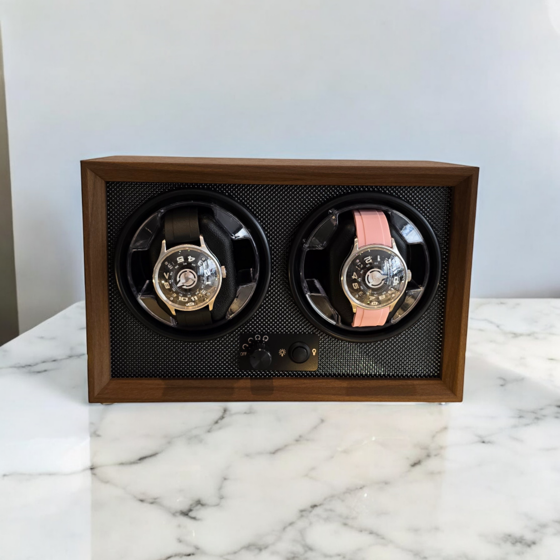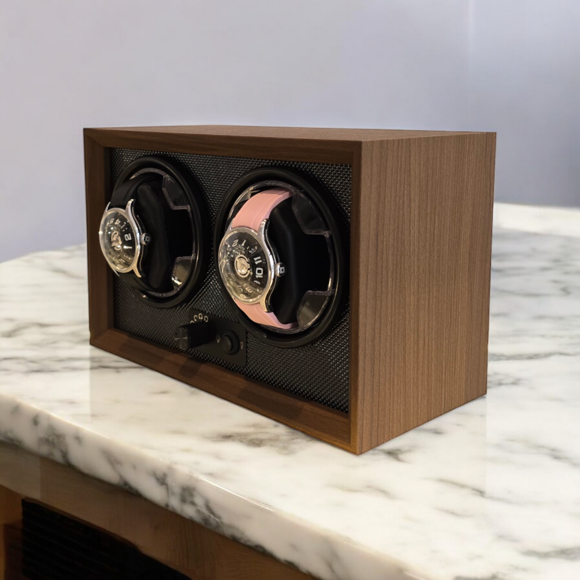 Een watchwinder is een apparaat dat is ontworpen om automatische horloges te laten lopen wanneer ze niet worden gedragen. Het simuleert polsbewegingen om ervoor te zorgen dat het horloge nauwkeurig de tijd aangeeft. Dit model heeft een elegant ontwerp met een natuurlijke houten afwerking en een getextureerde zwarte binnenkant, die elk horloge in de kijker zet. Beide compartimenten zijn uitgerust met discrete en stille draaimechanismen, die functionaliteit combineren met verfijnde esthetiek, perfect voor verzamelaars en horlogeliefhebbers.