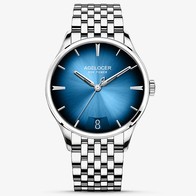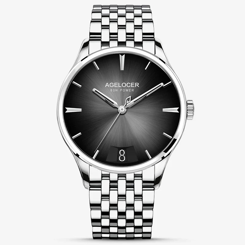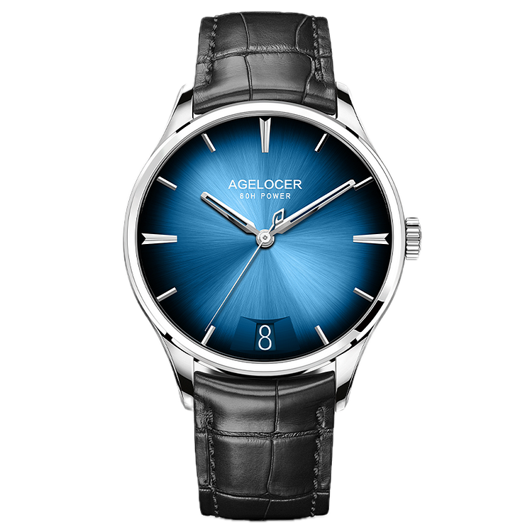 Onafhankelijk ontworpen en ontwikkelde uurwerken Het exclusieve mechanische uurwerk van AGELOCER horloges is automatisch, met 27 juwelen, een diameter van 31,9 mm, een dikte van 5,6 mm, een gangreserve van 80 uur en een trillingsfrequentie van 28.800 per uur.