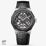 Het Agelocer Forêt Schwarzwald horloge belichaamt de kracht en sereniteit van het Zwarte Woud, met een skeletachtig ontwerp dat de precisie van het binnenwerk onthult. Uitgerust met een automatisch uurwerk met een indrukwekkende gangreserve van 80 uur, onderscheidt dit horloge zich door zijn technische verfijning en robuustheid. Krasbestendig saffierglas beschermt de fijn bewerkte wijzerplaat, terwijl de hoogwaardige rubberen band zorgt voor optimaal comfort en duurzaamheid. Met een gedurfde en eigentijdse stijl is de Forêt Schwarzwald van Agelocer ideaal voor horlogeliefhebbers die elegantie en prestaties zoeken in een uniek uurwerk.