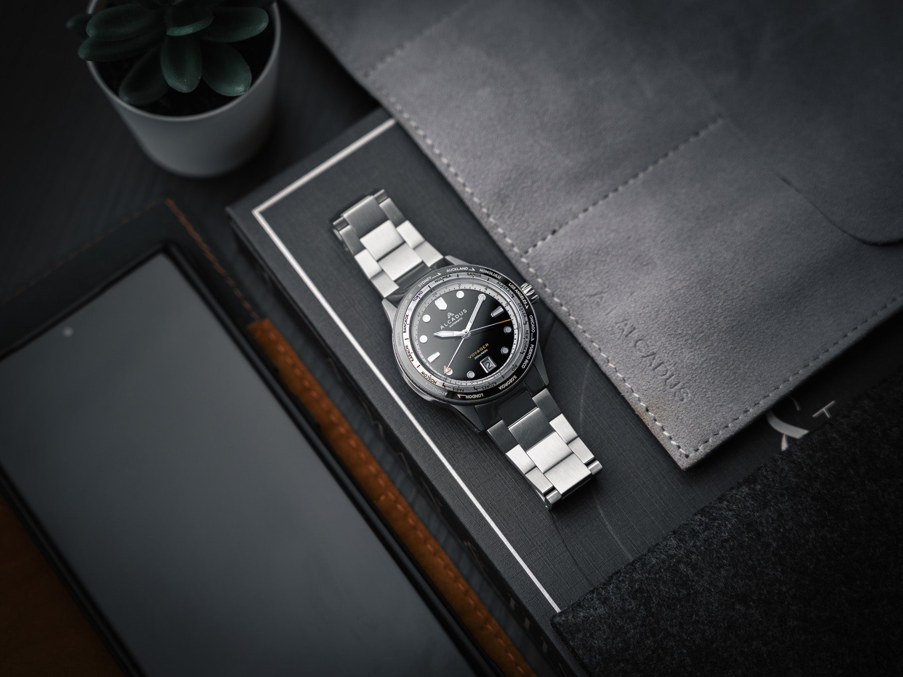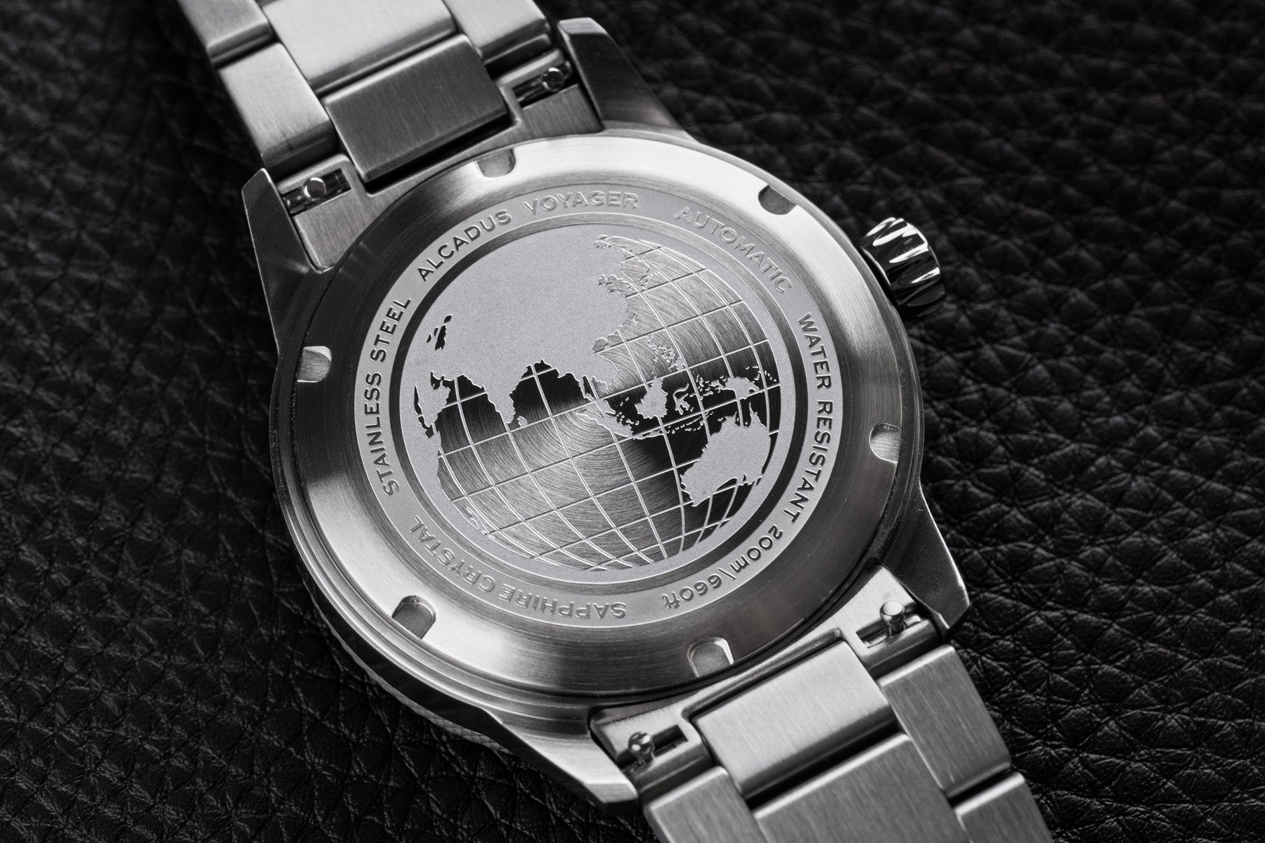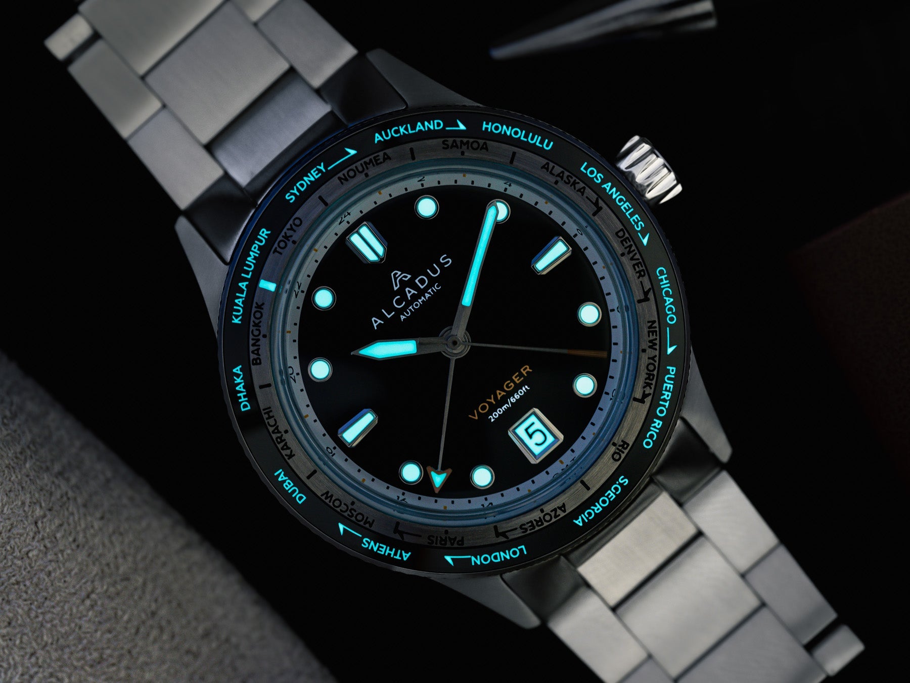 De Voyager Worldtimer GMT heeft een zorgvuldig vervaardigde bidirectionele bezel, ontworpen voor optimale functionaliteit en wereldwijd gebruik. Gegraveerd met 24 steden, die elk een andere tijdzone vertegenwoordigen. De zomertijd wordt ook meegerekend, met een handige pijl naast de stad om de aanpassing aan te geven. De bezel combineert twee verschillende materialen: de buitenste stadsring is gemaakt van keramiek, met precisie gegraveerd en gevuld met Super-LumiNova voor een uitstekende leesbaarheid bij weinig licht. De binnenste stadsring is gegraveerd in roestvrij staal, wat een contrast toevoegt aan het ontwerp. Op de locatie in Kuala Lumpur, waar Alcadus Watches met trots is gevestigd, markeert het lume-puntje de positie van de stad op de bezel, wat zowel een functioneel als symbolisch kenmerk is voor de drager.