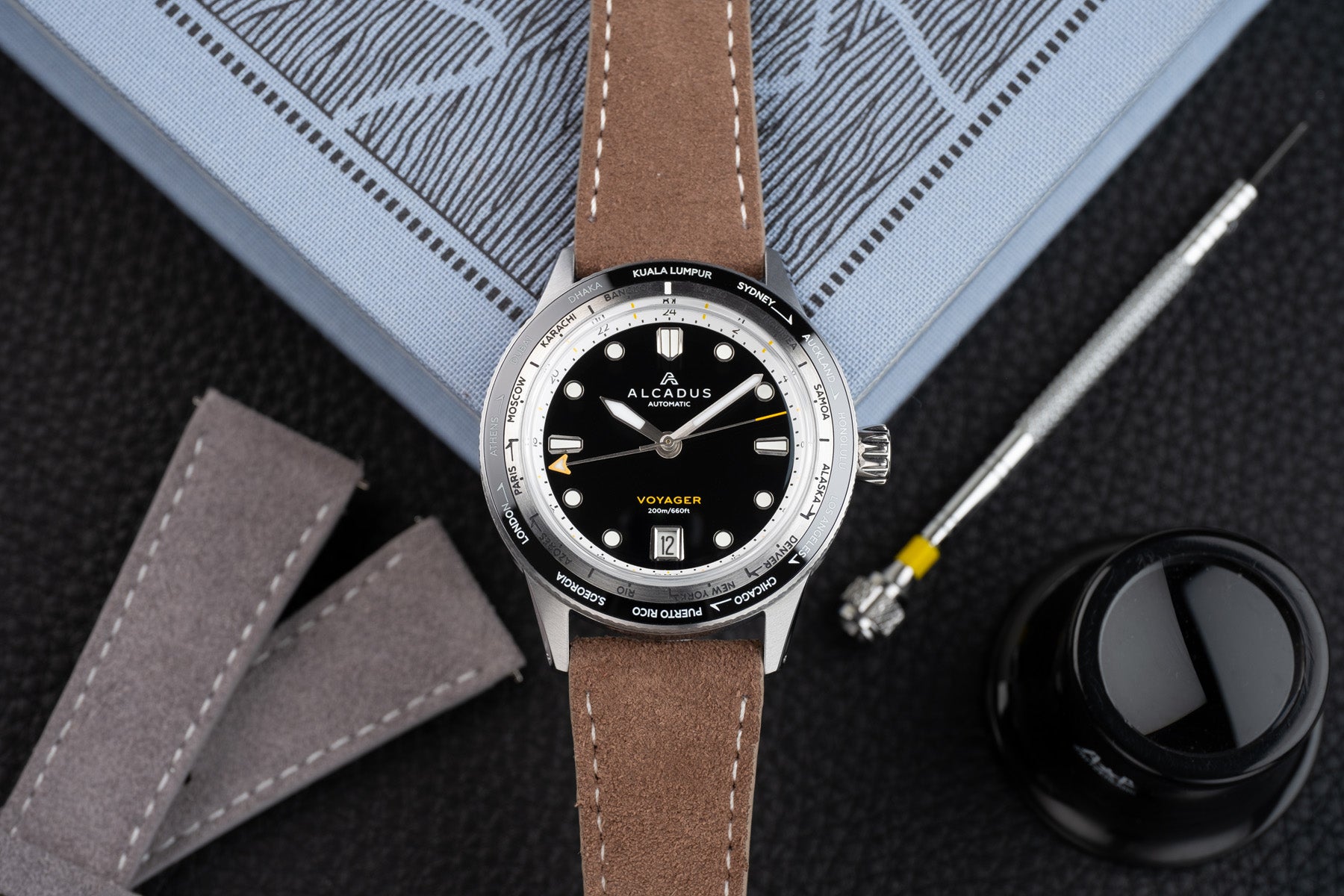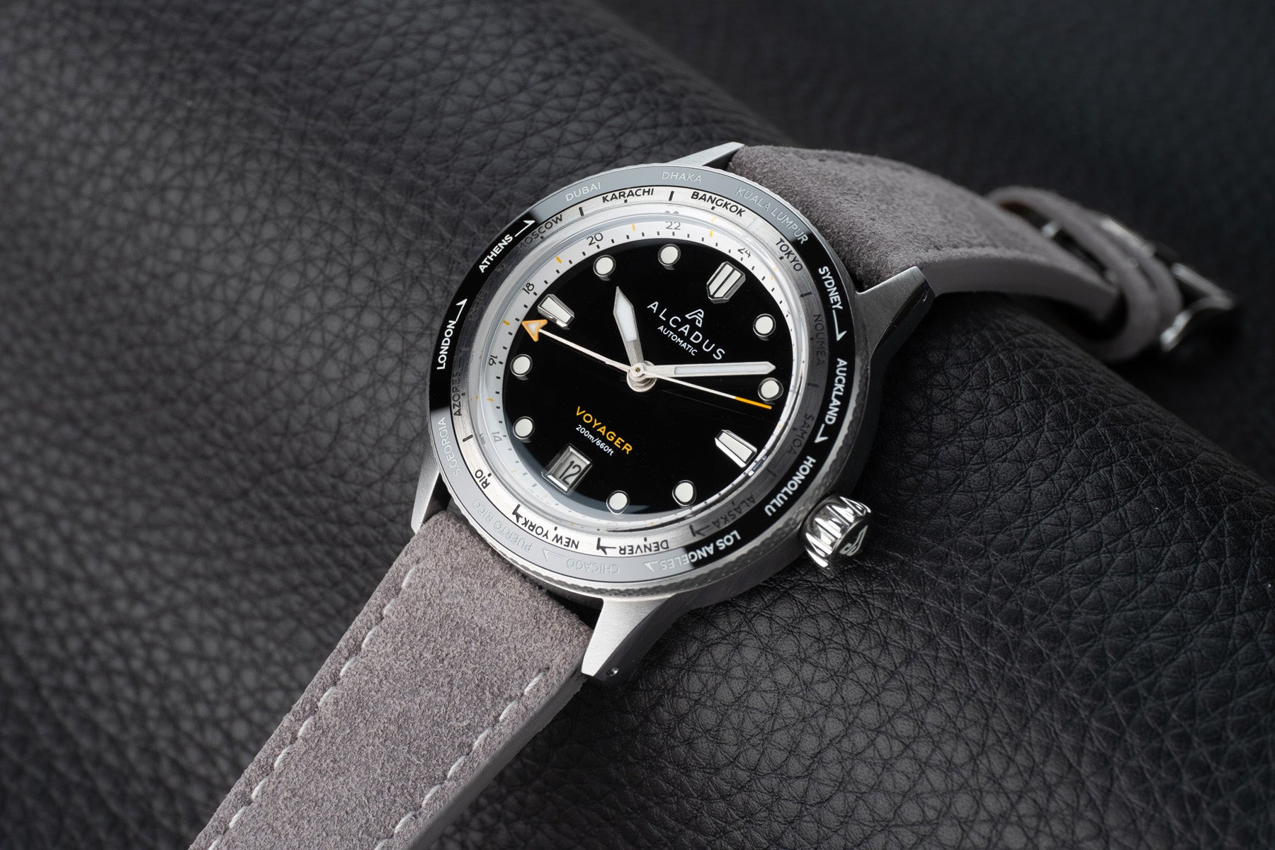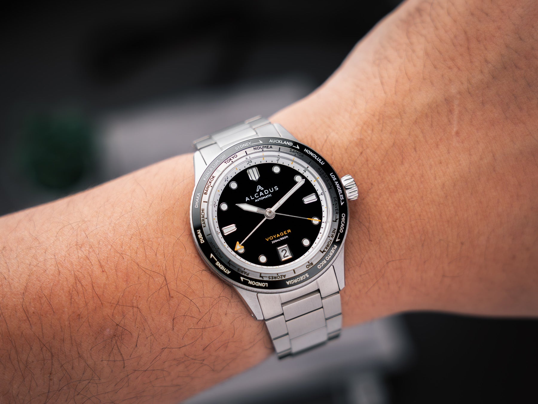 De Voyager Worldtimer GMT heeft een zorgvuldig vervaardigde bidirectionele bezel, ontworpen voor optimale functionaliteit en wereldwijd gebruik. Gegraveerd met 24 steden, die elk een andere tijdzone vertegenwoordigen. De zomertijd wordt ook meegerekend, met een handige pijl naast de stad om de aanpassing aan te geven. De bezel combineert twee verschillende materialen: de buitenste stadsring is gemaakt van keramiek, met precisie gegraveerd en gevuld met Super-LumiNova voor een uitstekende leesbaarheid bij weinig licht. De binnenste stadsring is gegraveerd in roestvrij staal, wat een contrast toevoegt aan het ontwerp. Op de locatie in Kuala Lumpur, waar Alcadus Watches met trots is gevestigd, markeert het lume-puntje de positie van de stad op de bezel, wat zowel een functioneel als symbolisch kenmerk is voor de drager.