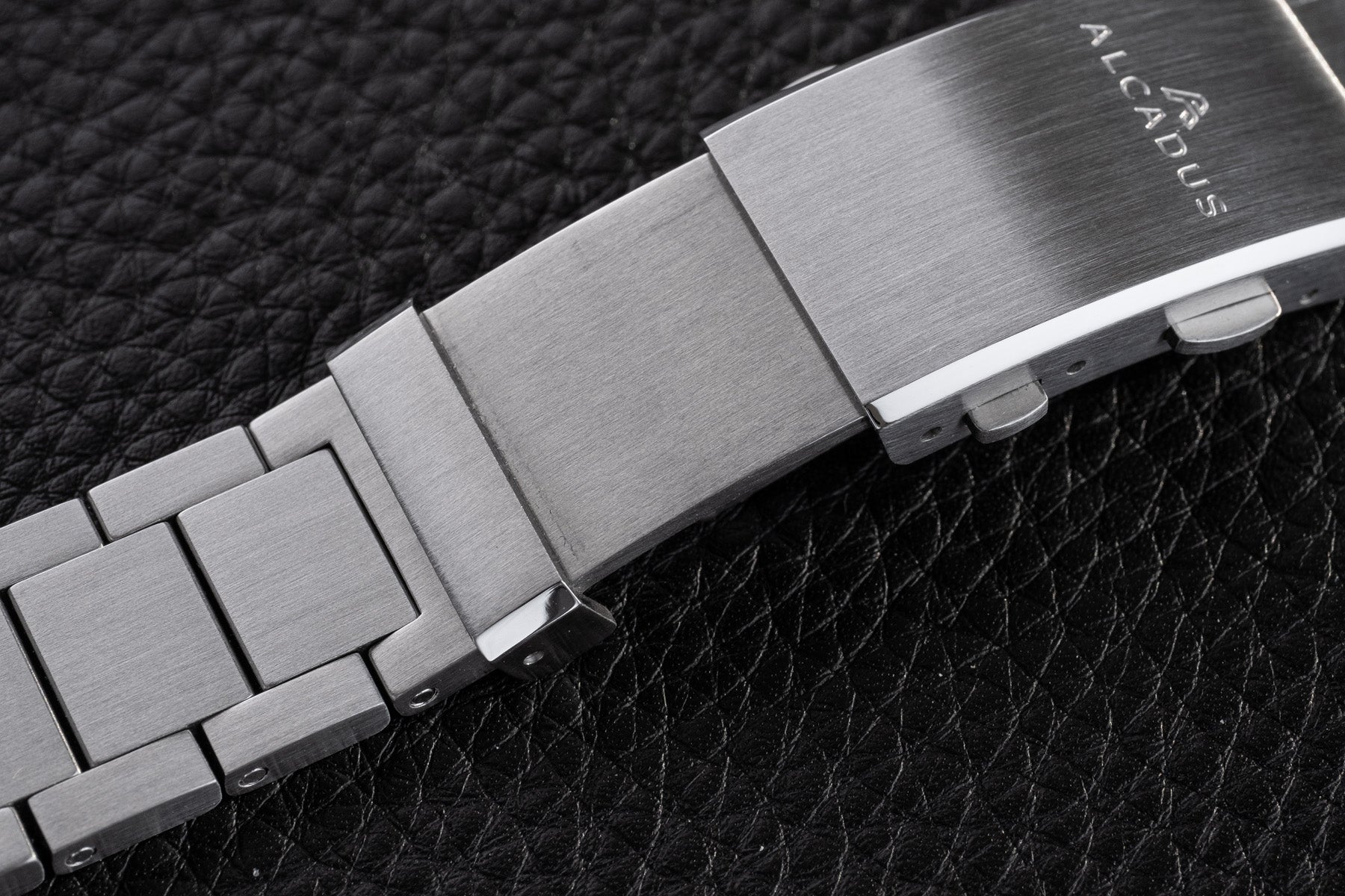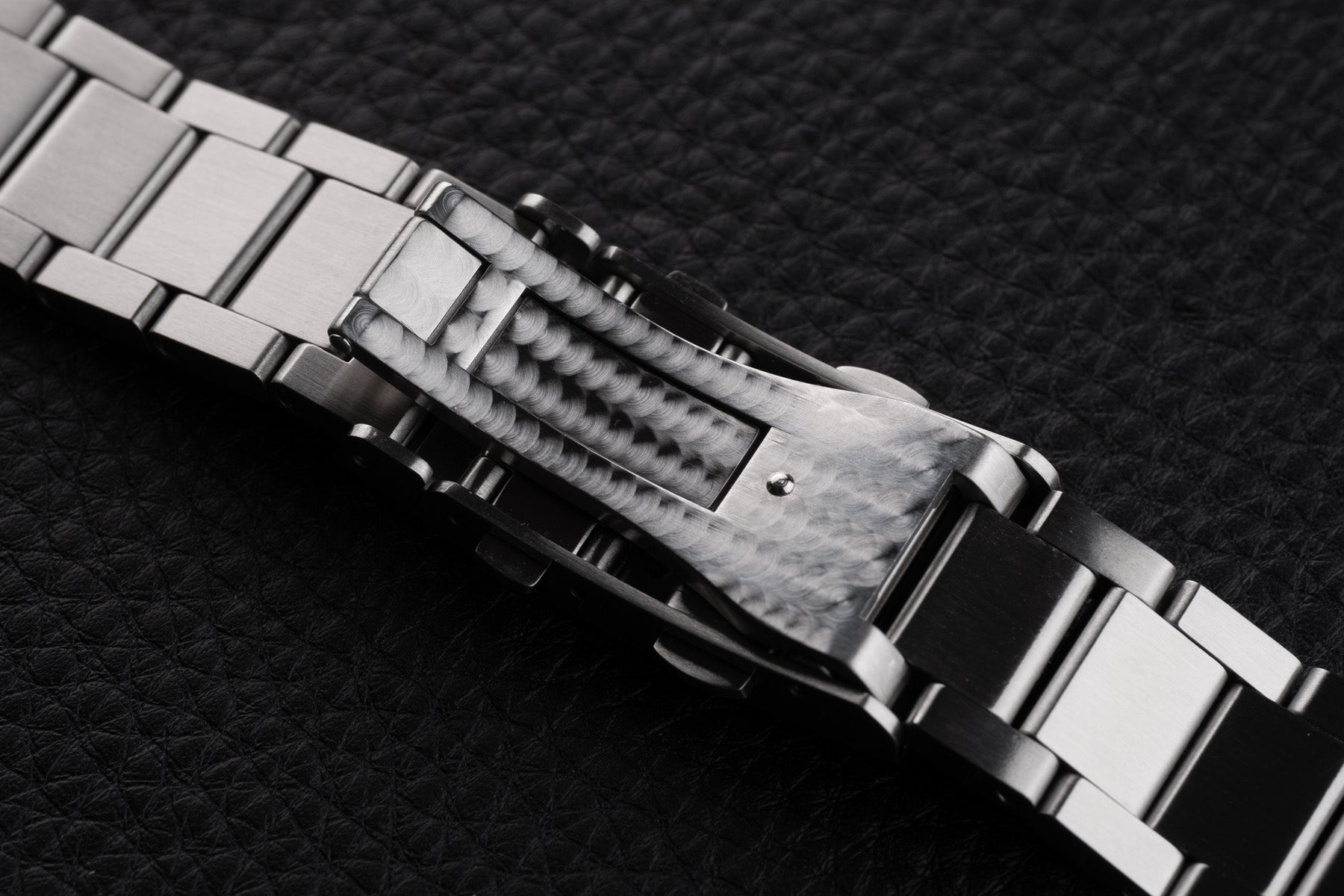 De onberispelijk vervaardigde band met platte schakels combineert verfijning en functionaliteit. De solide schakels en de snelspanveer maken het verwisselen van de band moeiteloos, wat zorgt voor een zorgeloze ervaring. Met een geleidelijke toeloop van 20 mm naar 16 mm straalt de band niet alleen een strakke esthetiek uit, maar biedt hij ook uitstekende articulatie en comfort. De verstelbare sluiting verhoogt het gemak nog verder en verbetert de algehele draagervaring, zodat u de pasvorm kunt personaliseren voor optimaal comfort.