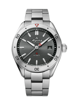 Alpiner 4 Automatic. Dit horloge heeft een gepolijste roestvrijstalen band met vouwsluiting en een zwarte wijzerplaat met lichtgevende indexen en wijzers, een datumvenster op 3 uur en een dagvenster op 9 uur.