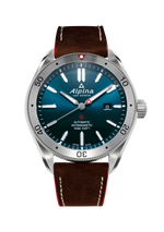 Alpiner 4 Automatic. Dit horloge heeft een gepolijste roestvrijstalen band met vouwsluiting en een zwarte wijzerplaat met lichtgevende indexen en wijzers, een datumvenster op 3 uur en een dagvenster op 9 uur.
