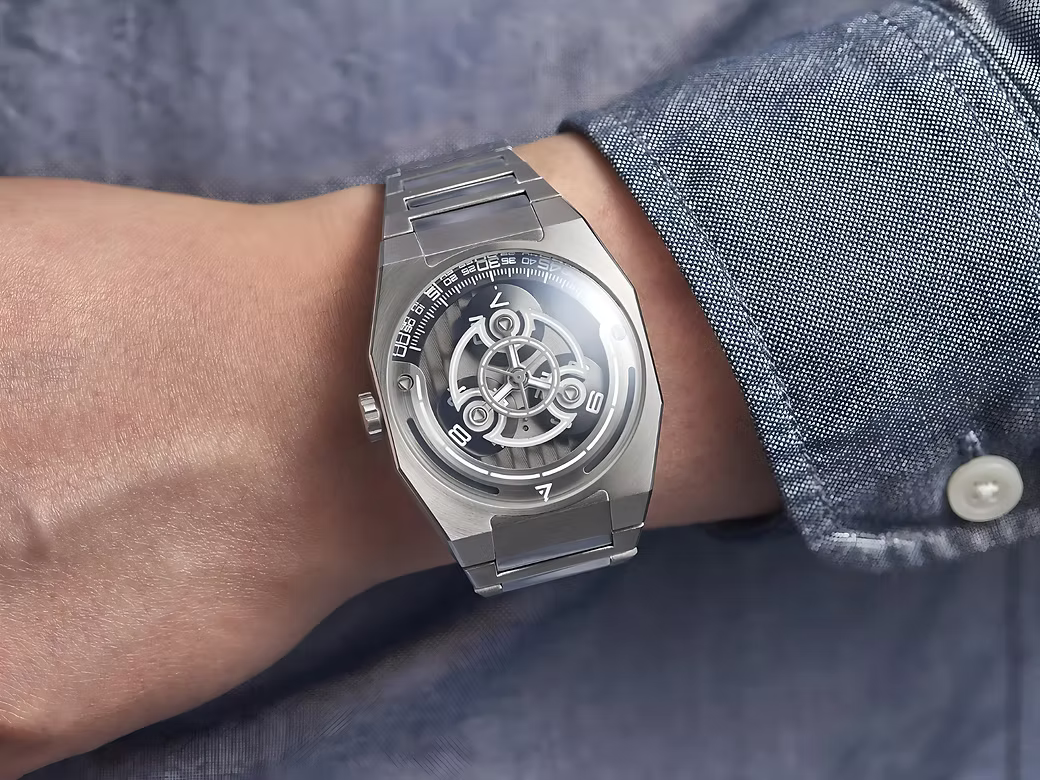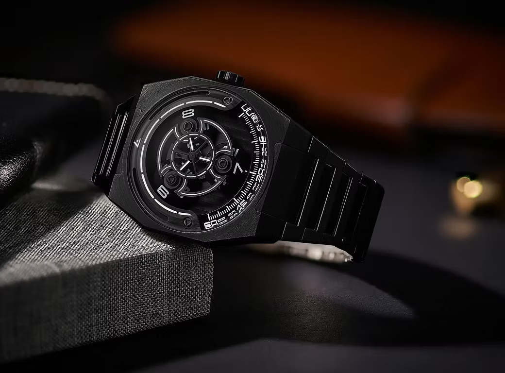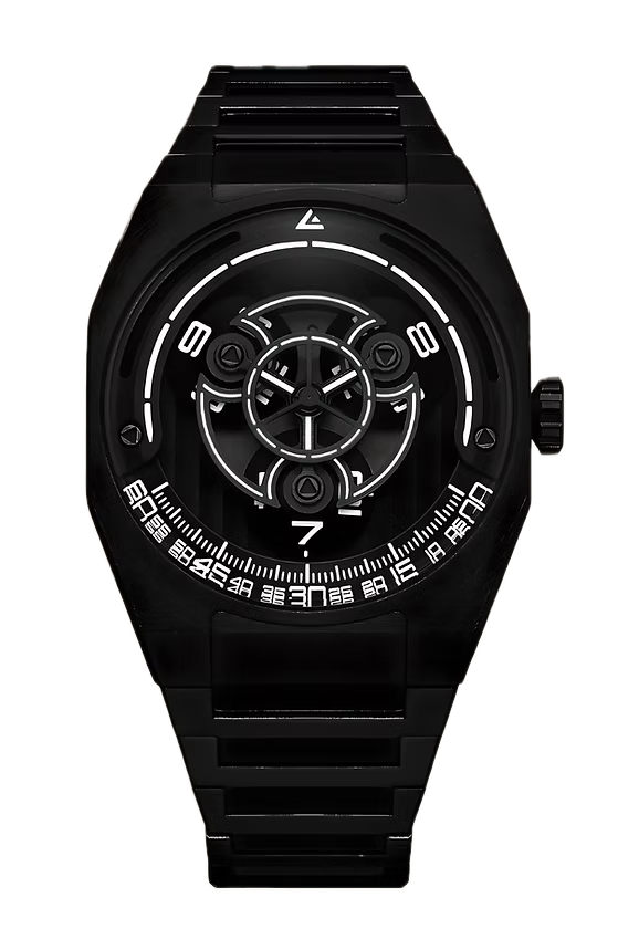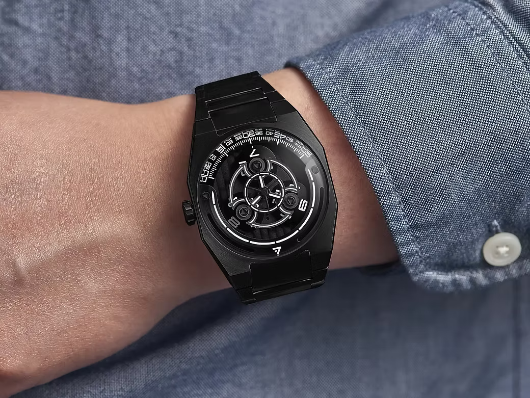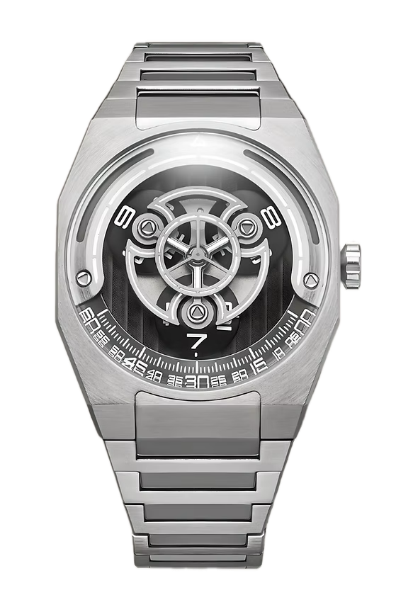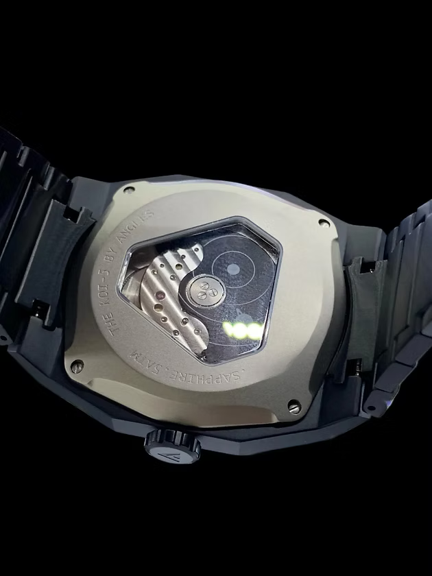 De Angles KOI-5 is een gelimiteerde, zwervende klok , geïnspireerd op het fascinerende KOI-5-sterrenstelsel in het sterrenbeeld Cygnus. Met drie roterende schijven imiteert dit automatische herenhorloge het hemelse ballet van de drie zonnen, een tijdsweergave die doet denken aan een kosmische dans.