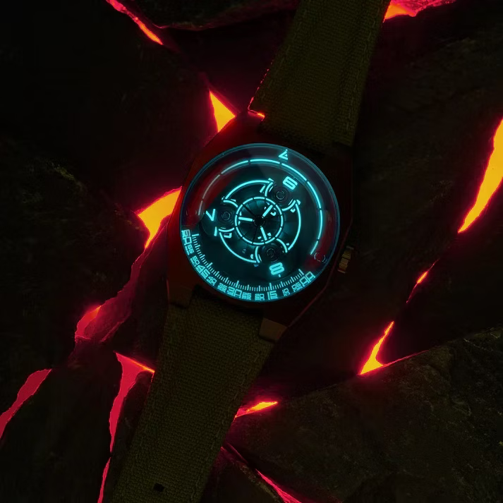 - Wijzerplaat: Geanodiseerde aluminium flens en schijven met een Côtes de Genève-motief. Cijfers, minuten en indexen bedekt met lume.
