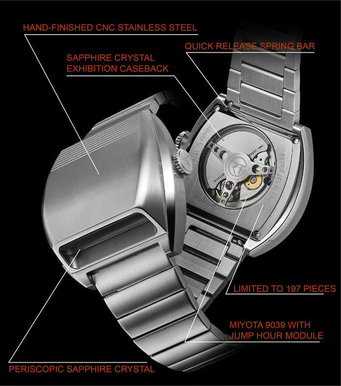 De kastvorm en het algehele ontwerp zijn geïnspireerd op een cruciale periode in de geschiedenis van de mechanische horlogemakerij. Halverwege de jaren 70 nam de digitale rage een hoge vlucht dankzij nauwkeurige, op batterijen werkende quartz-uurwerken. Veel horlogemakers gingen failliet door wat een van de grootste bedreigingen voor de hele mechanische horloge-industrie bleek te zijn. Sommige ontwerpers besloten complicaties aan te bieden met een digitale weergave van de tijd op de wijzerplaat, met een meer "digitale" weergave. Vooral springende uurschijven gaven een vergelijkbare indruk als de nieuwe led-horloges: na elke cyclus van 60 minuten "springt" de uurschijf naar het volgende cijfer. De Hudson Instalite, Richard Insantim, Cauny Digital Jumph Hour, Arsa Directime, Bali Enicar Jumphour, Bulova Automatic Jumphour N4, Basis Digital en Secura Equisit zijn allemaal voorbeelden van springende uurhorloges in een sportieve uitvoering.