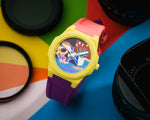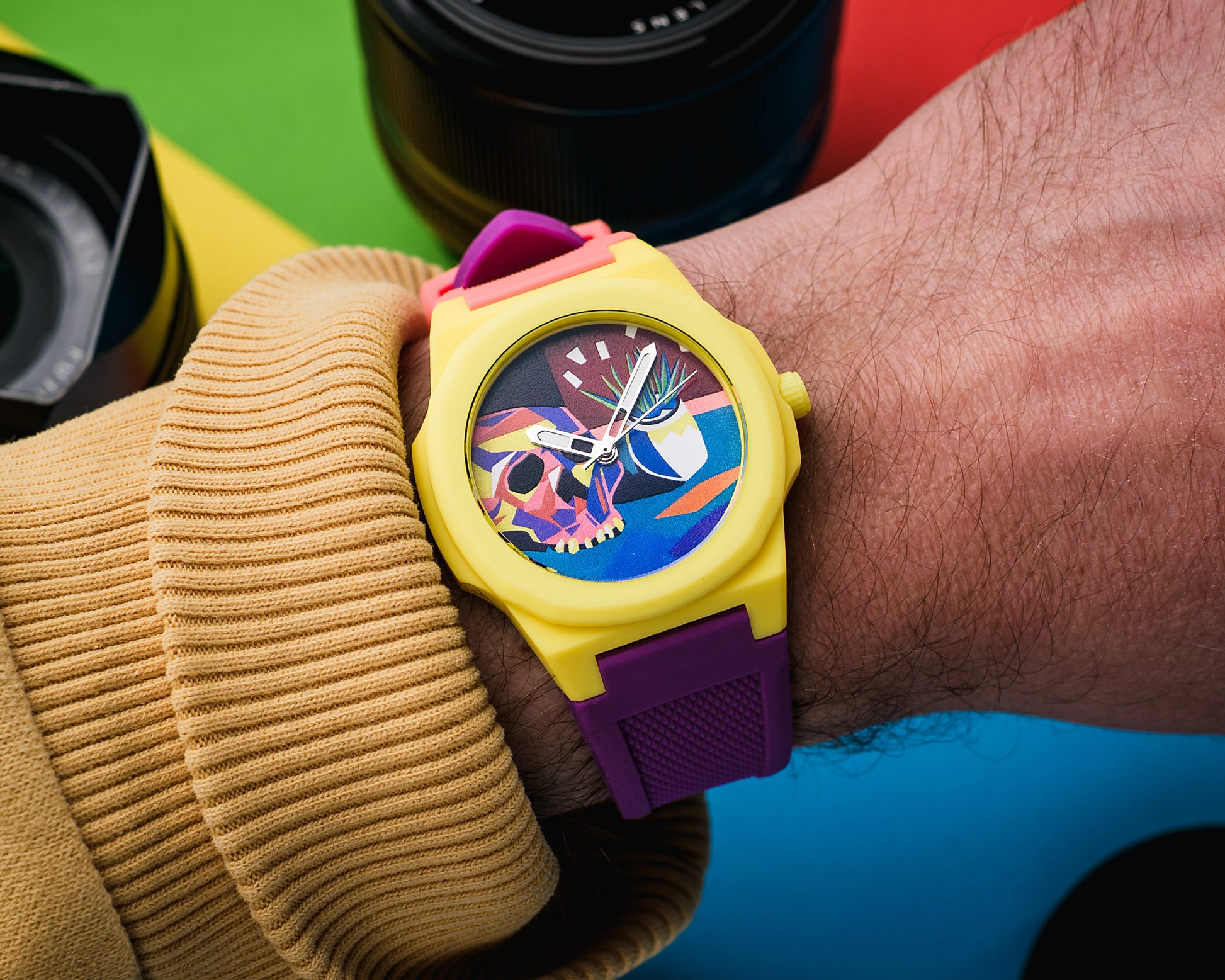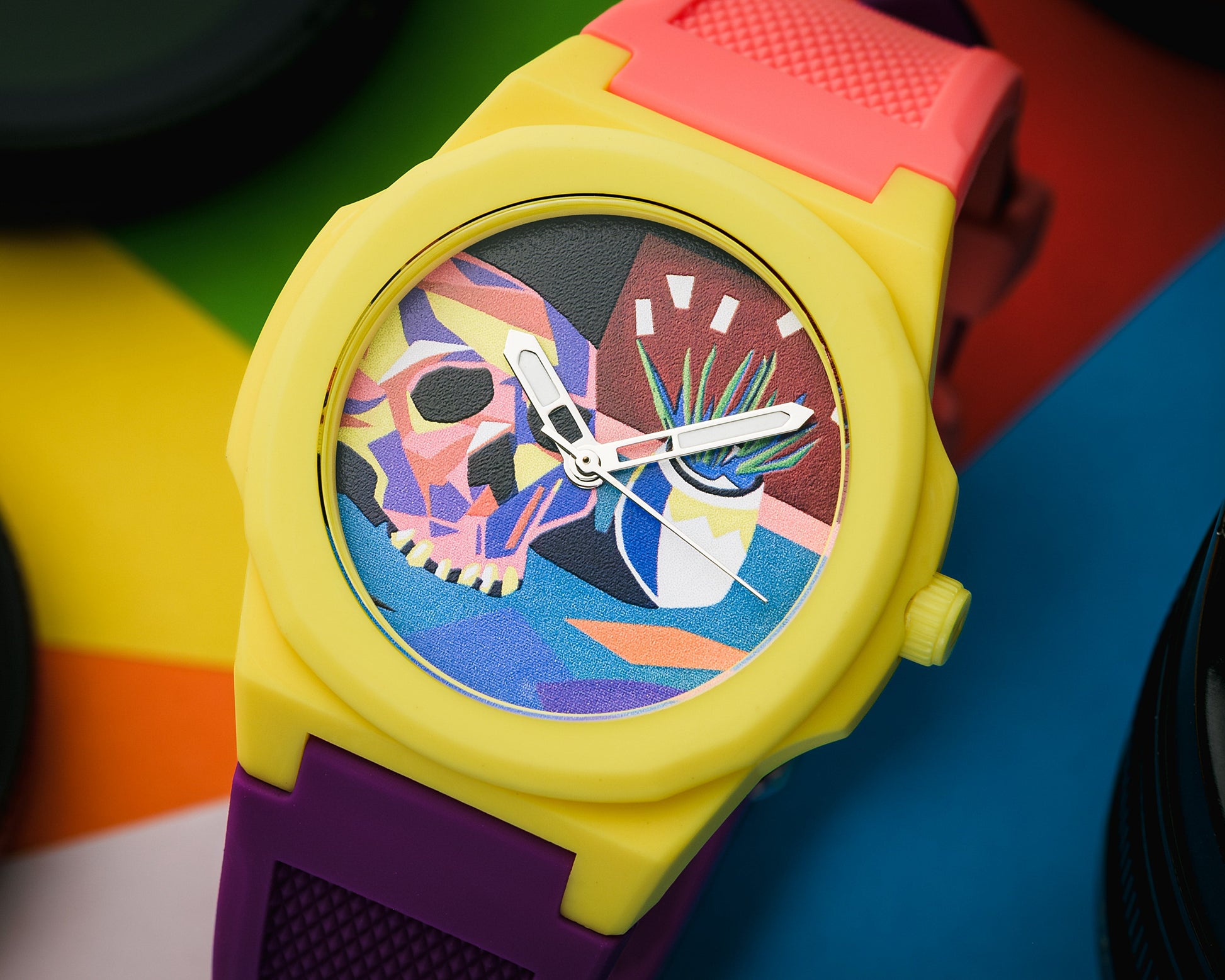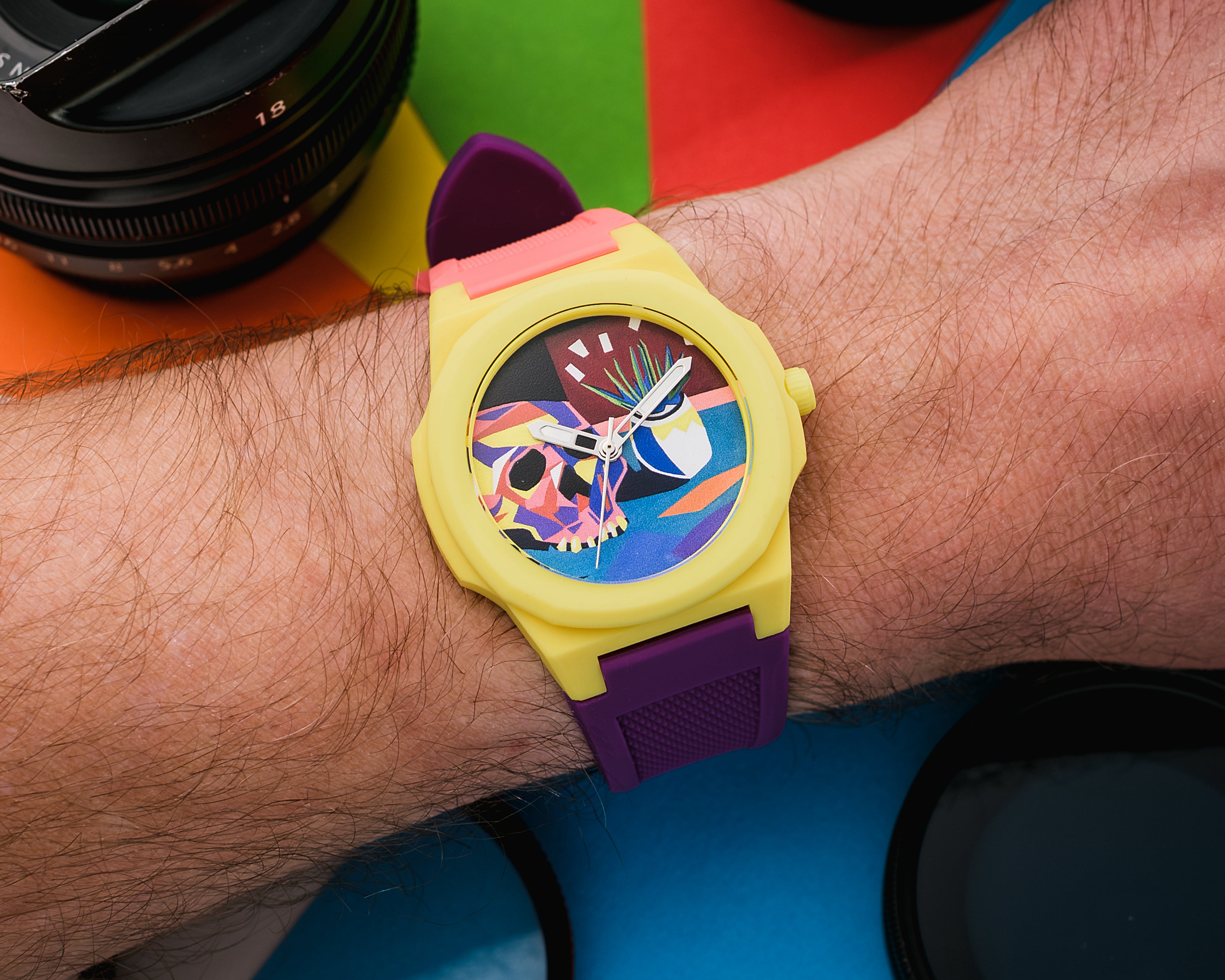Het Good Times-horloge verwerkt een deel van Christophers gelijknamige werk, een opvallend stilleven van een schedel en een plant, in de wijzerplaat. Trouw aan het kleurenpalet van het originele schilderij, heeft de band de iconische kleuren, wat een harmonieus samenspel tussen kunst en accessoire creëert.