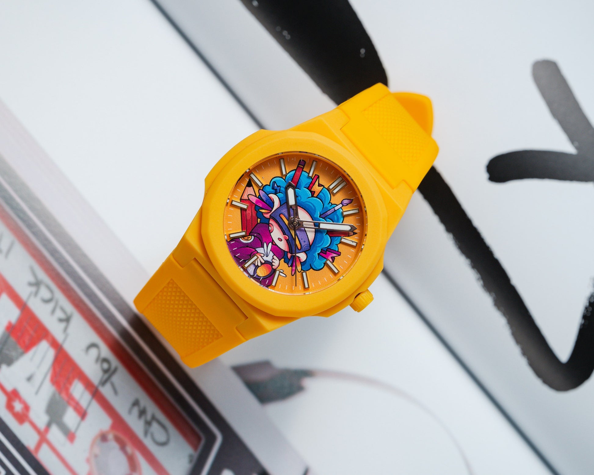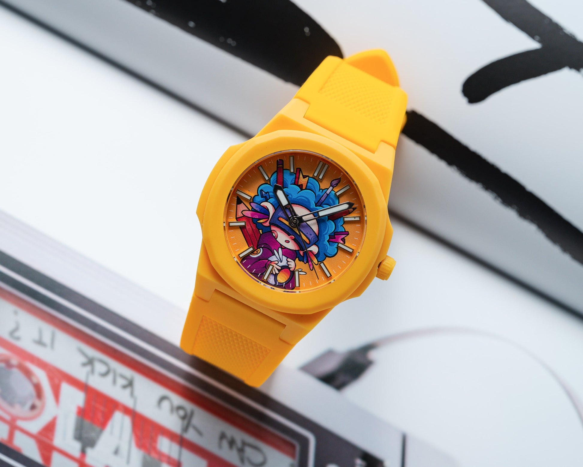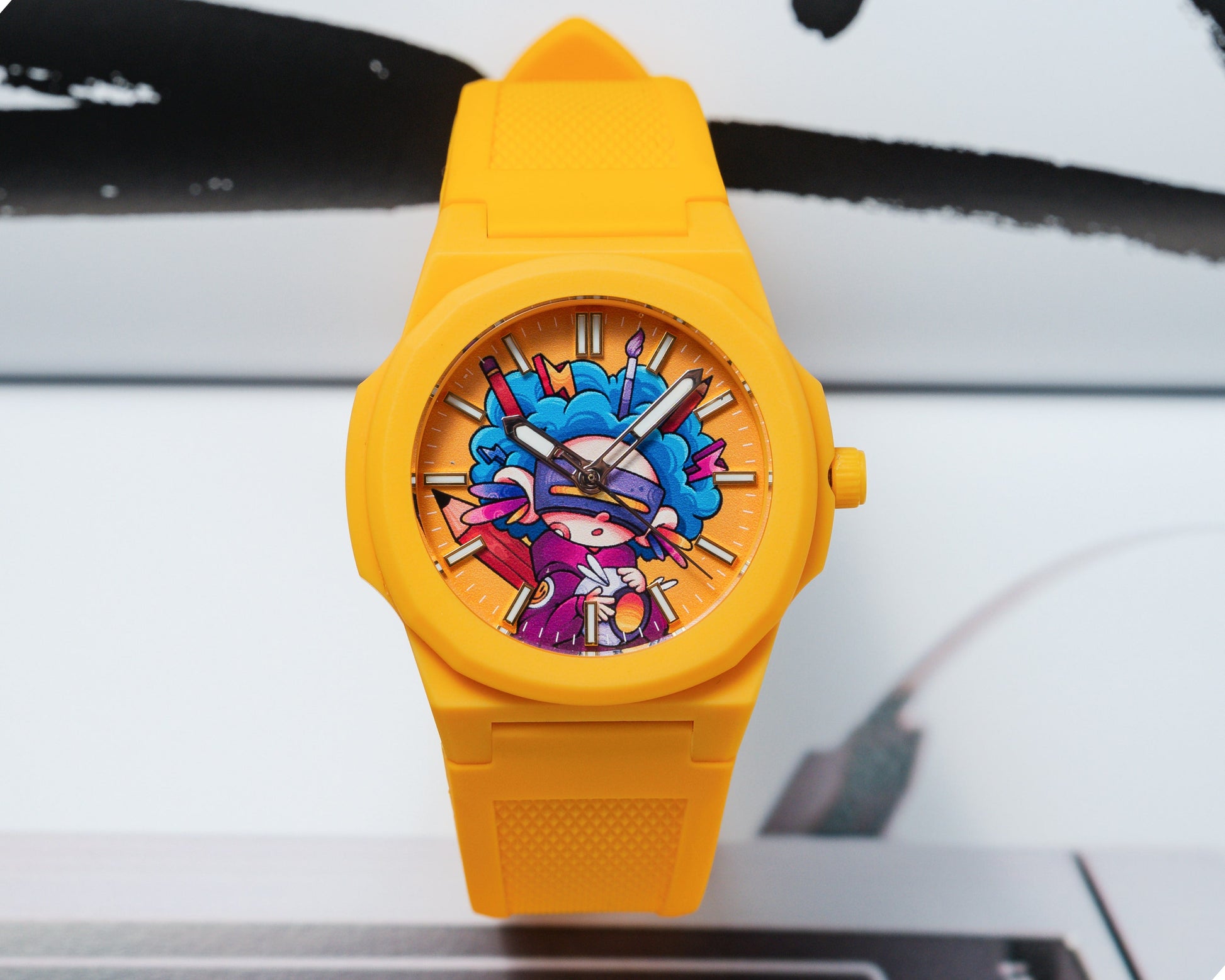 Jack AC Art tekent een eerste kleurrijke samenwerking met ANKA met een explosief horloge genaamd Electric Geisha. Tegen een feloranje achtergrond toont de wijzerplaat een hybride figuur: een neo-futuristische geisha omringd door grafische bliksem, ergens tussen Japanse traditie en wilde popcultuur.