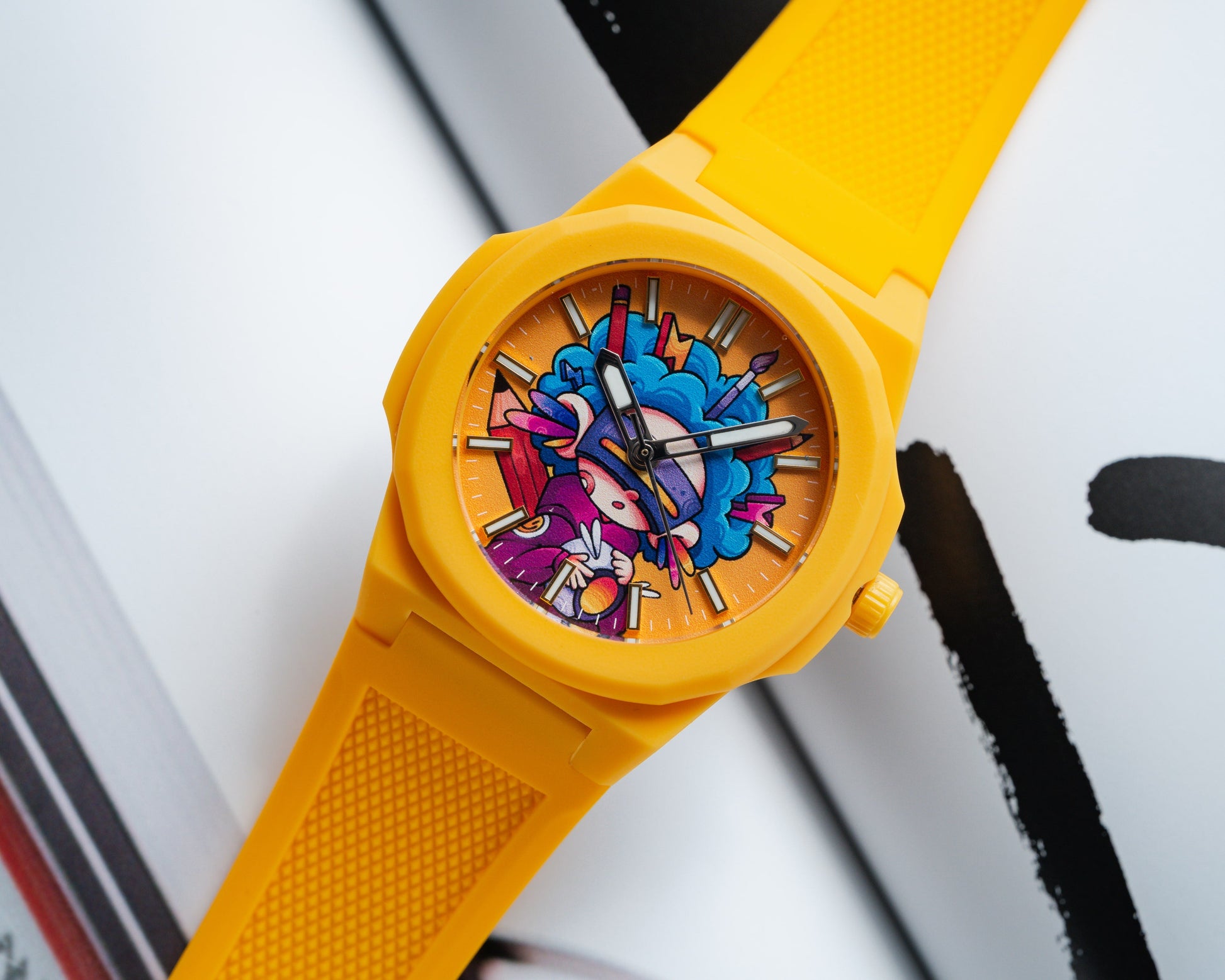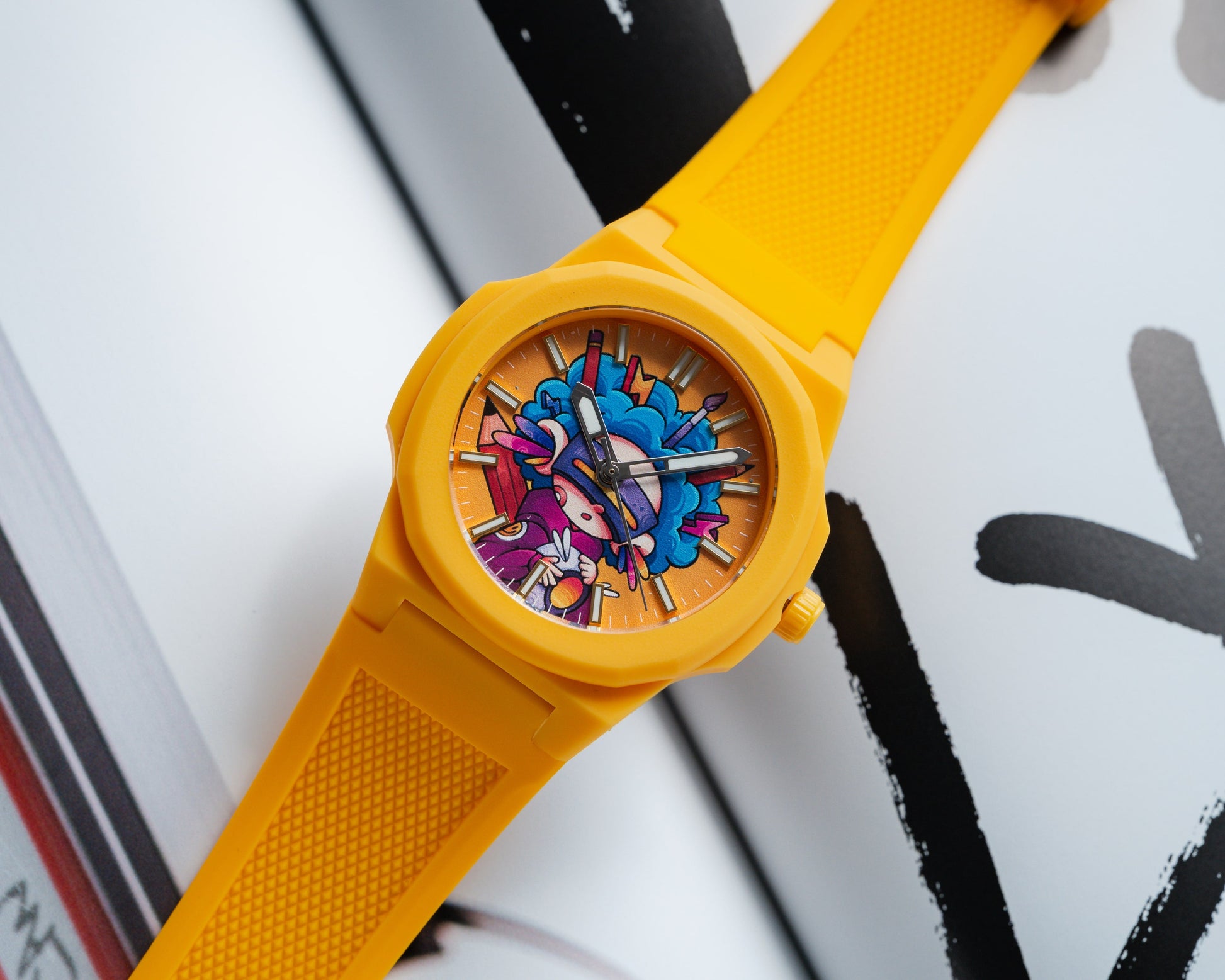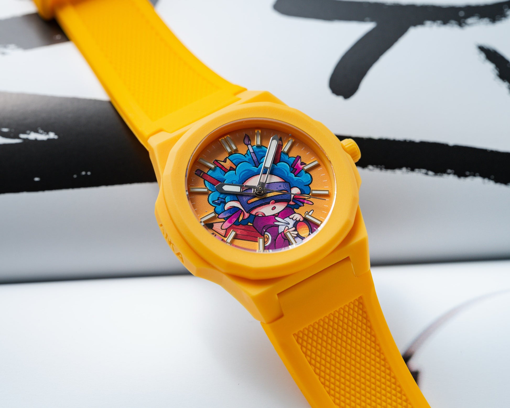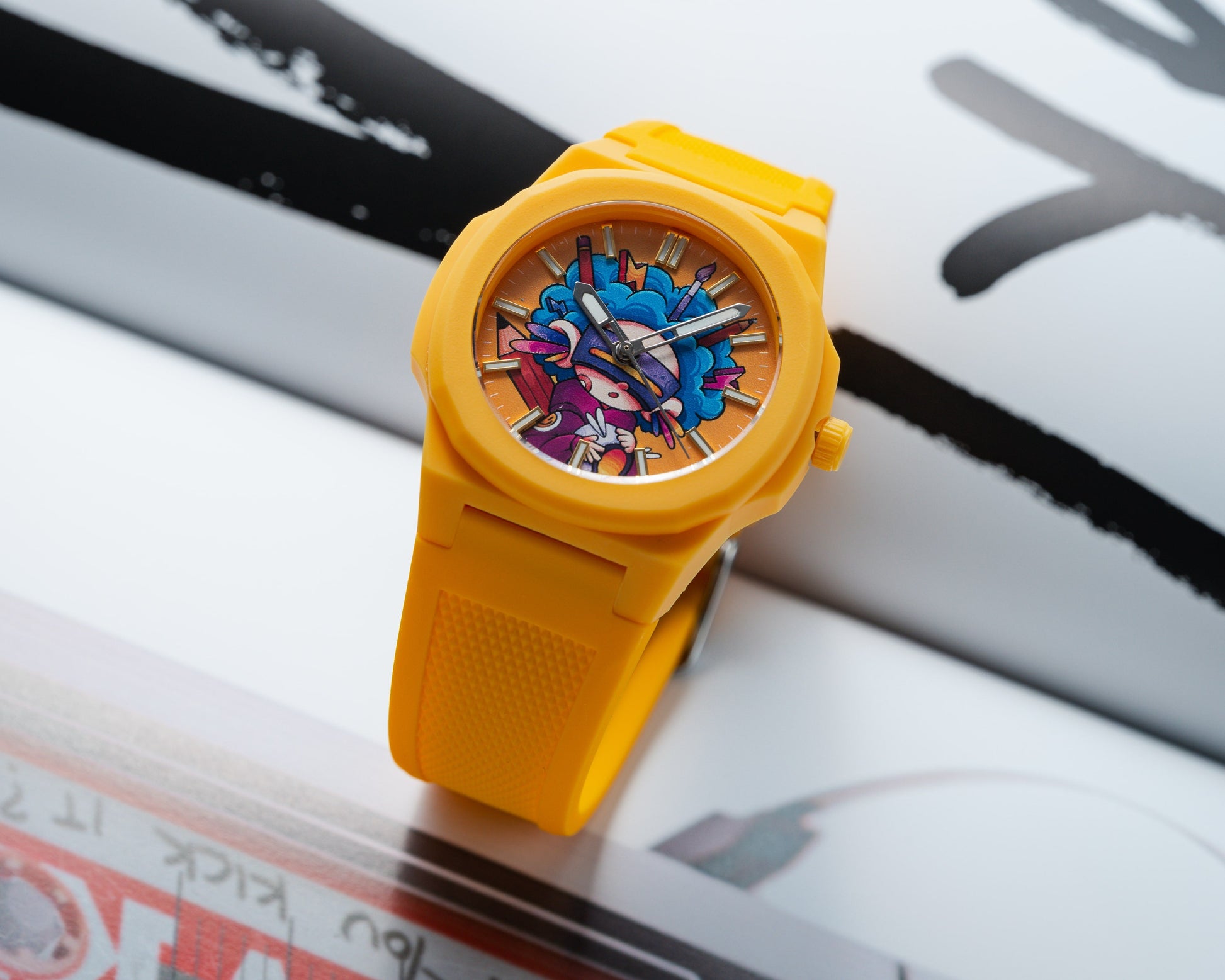 Jack AC Art tekent een eerste kleurrijke samenwerking met ANKA met een explosief horloge genaamd Electric Geisha. Tegen een feloranje achtergrond toont de wijzerplaat een hybride figuur: een neo-futuristische geisha omringd door grafische bliksem, ergens tussen Japanse traditie en wilde popcultuur.