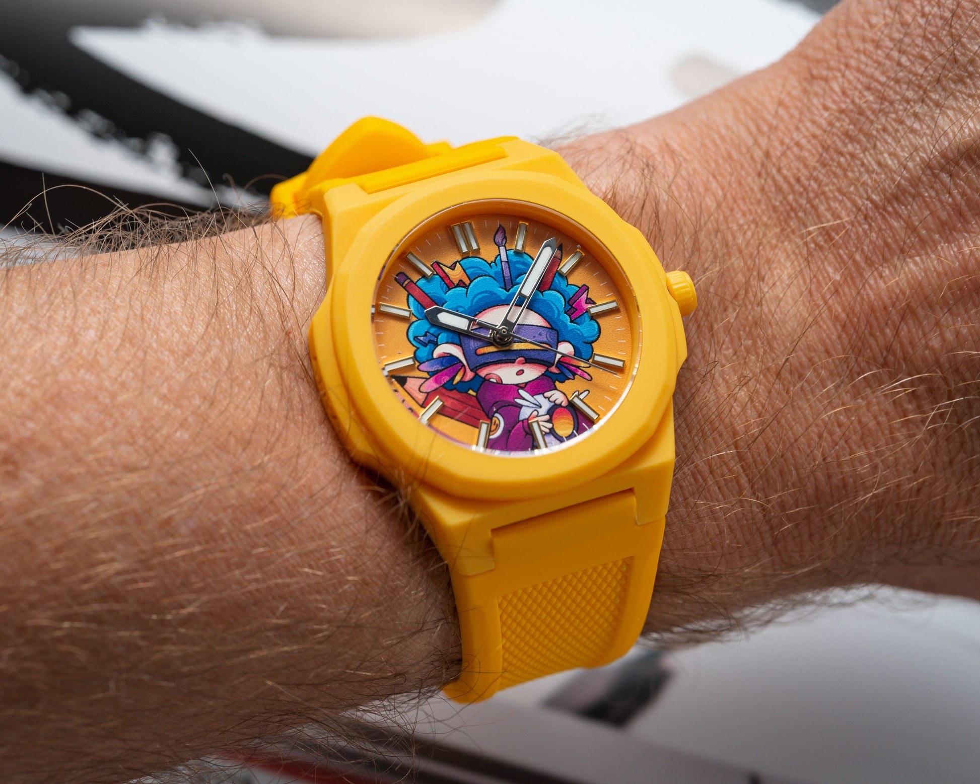 Een ware distillatie van Jack A.C. Art's universum, vol contrasten, visuele kracht en ongebreidelde verbeelding, dit horloge wordt een karakteristiek stuk, even eigenzinnig als stijlvol. De felgele kast en bijpassende band zetten de toon: deze editie zal niet onopgemerkt blijven.