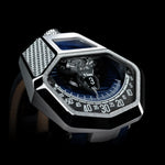 De gehele kast is gemaakt van 316L-staal en versierd met een geweven Genève-patroon op het oppervlak en een koolstofvezelpaneel met een badge eronder. De kast vereist 300 ton zware machines om hem geleidelijk te transformeren met behulp van meerdere zwaartekrachtpersen. Pas daarna ondergaat hij 50 verschillende afwerkings- en polijstprocessen om zijn perfecte vorm te bereiken.