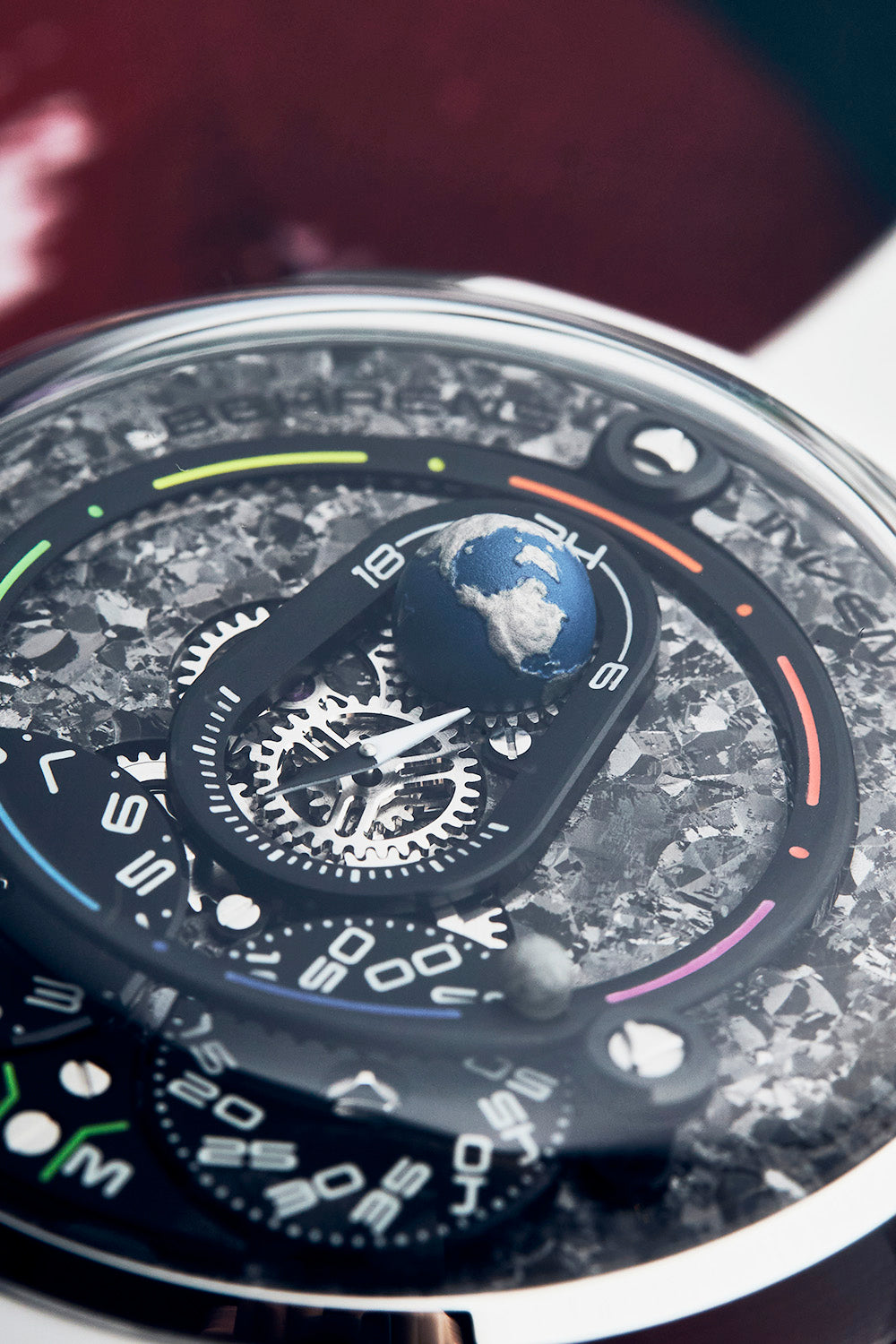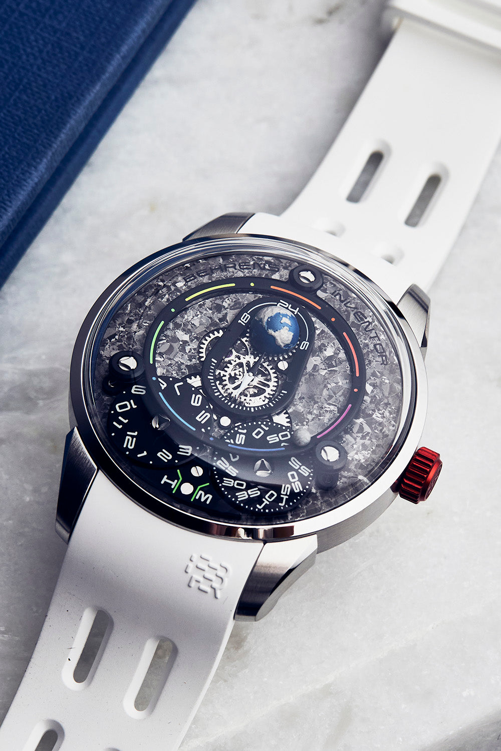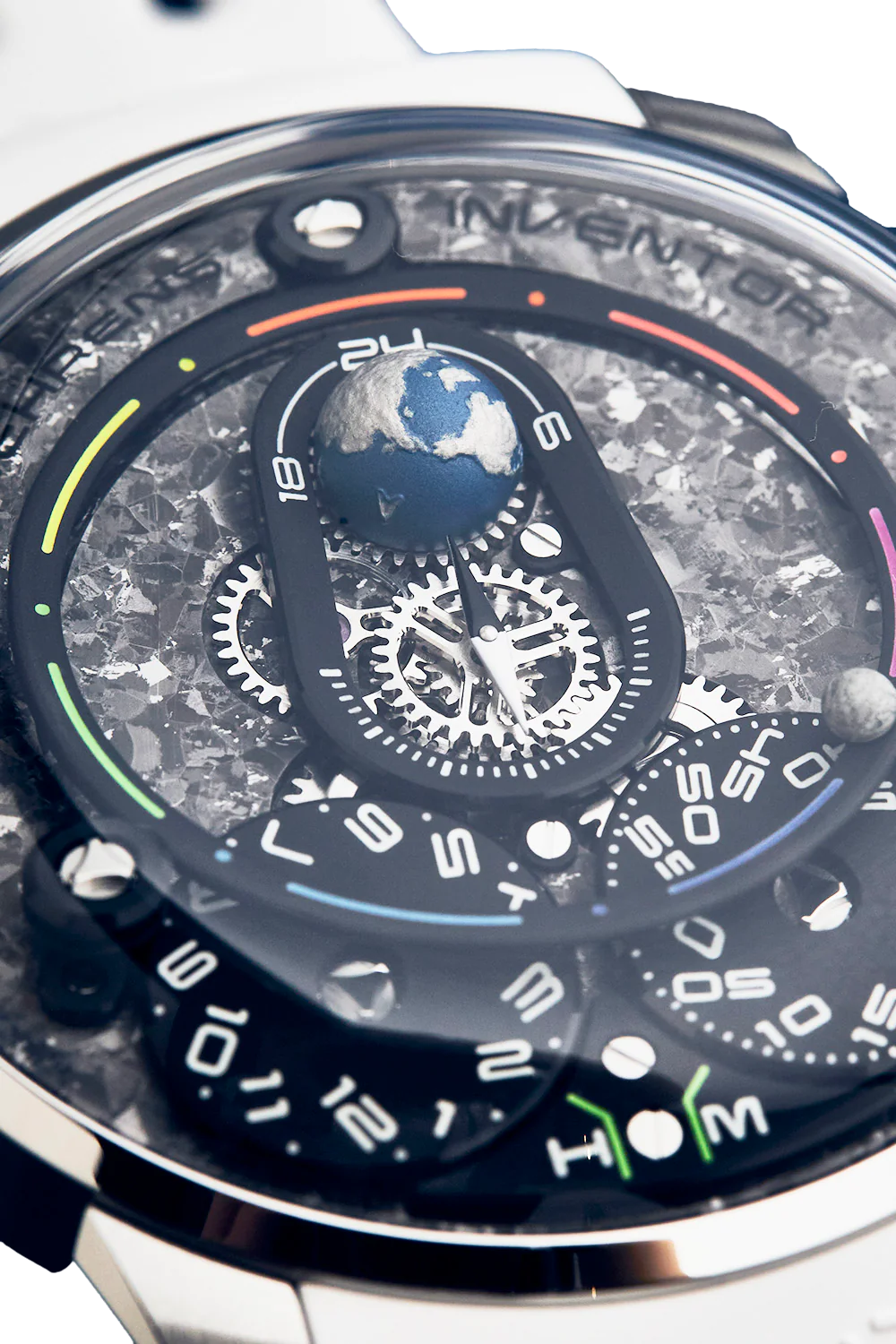 Het horloge is uitgerust met een automatisch uurwerk van Zwitserse makelij, ETA Cal.2824, met een tijdweergave die is geïnspireerd op de baan tussen de aarde en de maan. Om 12:00 uur draait een wereldbol, die de aarde voorstelt, elke 24 uur om de dag-nachtcyclus aan te geven, terwijl de maan in een cyclus van 28 dagen om de aarde draait, wat een fascinerend en realistisch 3D-beeld van de ruimte oplevert.