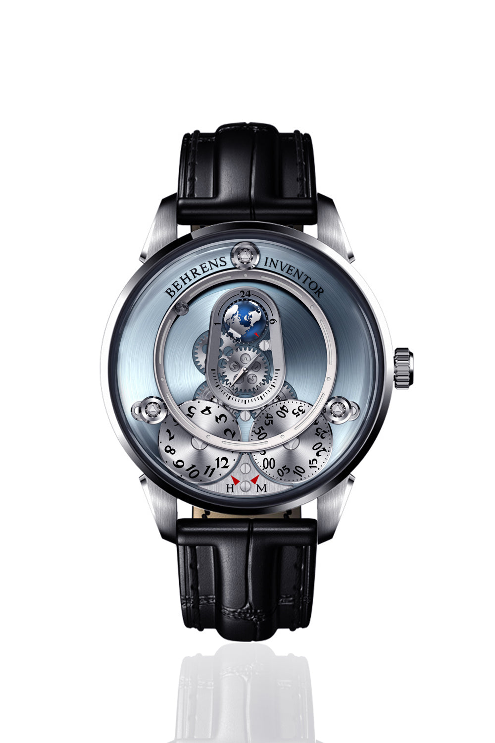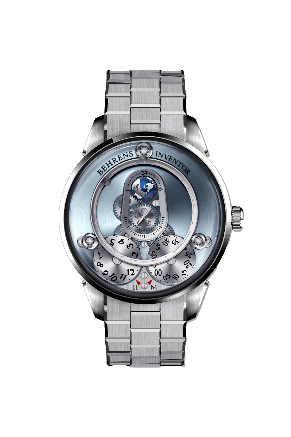 De uren en minuten worden weergegeven door twee metalen schijven die niet in het midden van het horloge zitten, op 7:00 en 5:00, terwijl een tweepuntige wijzer de seconden in het midden van de wijzerplaat aangeeft. De hemelsblauwe achtergrond van de wijzerplaat roept de onmetelijkheid van de ruimte op en geeft dit uitzonderlijke exemplaar een esthetische touch.