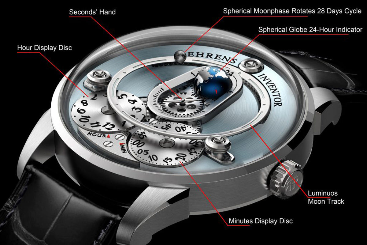 Op de wijzerplaat draait een bolvormige globe, die de aarde voorstelt, elke 24 uur rond op de 12:00-positie, en dient als dag-nachtindicator. Daarnaast draait een kleine globe, die de maan voorstelt, in een cyclus van 28 dagen rond de aarde, wat de beweging van de maan nauwkeurig weergeeft.