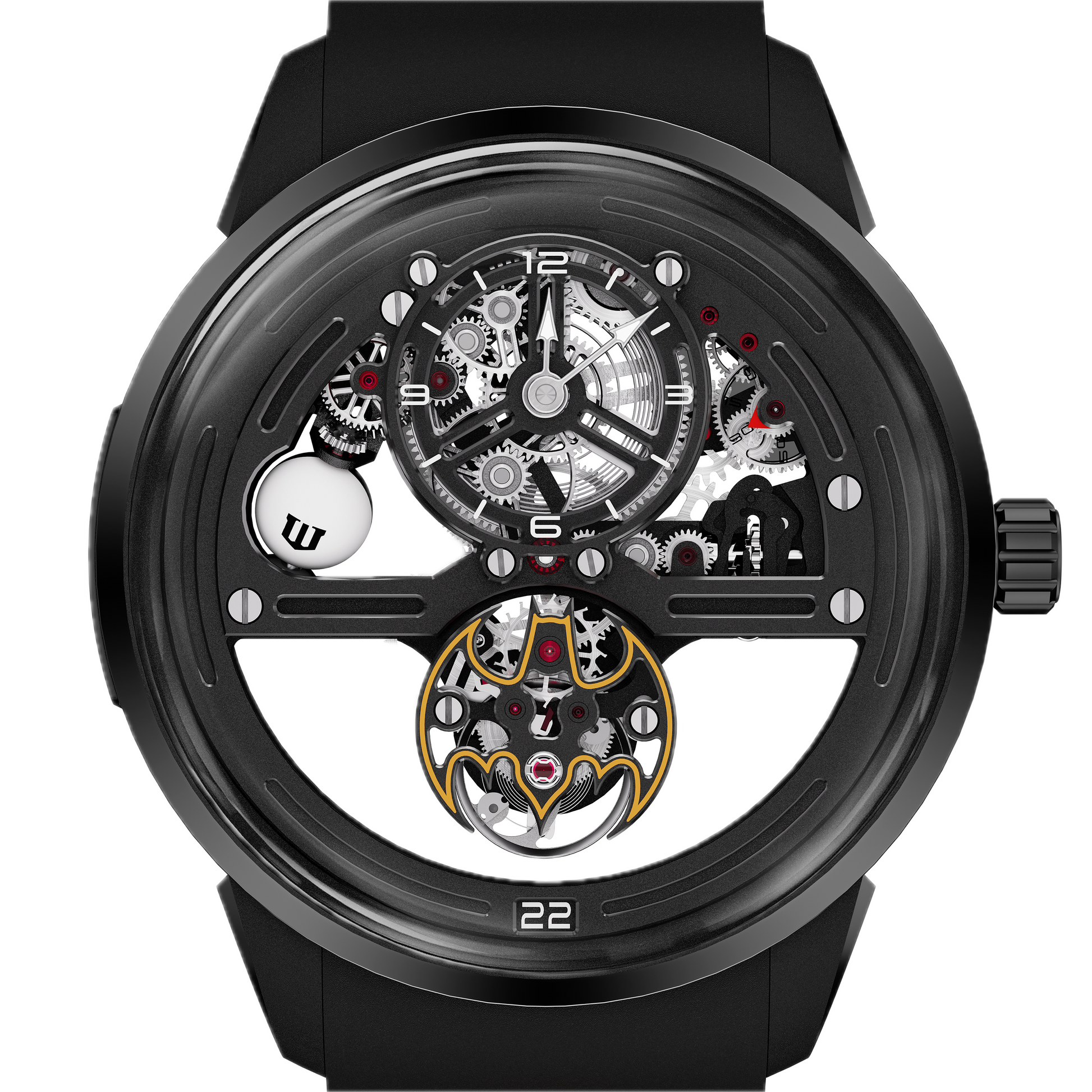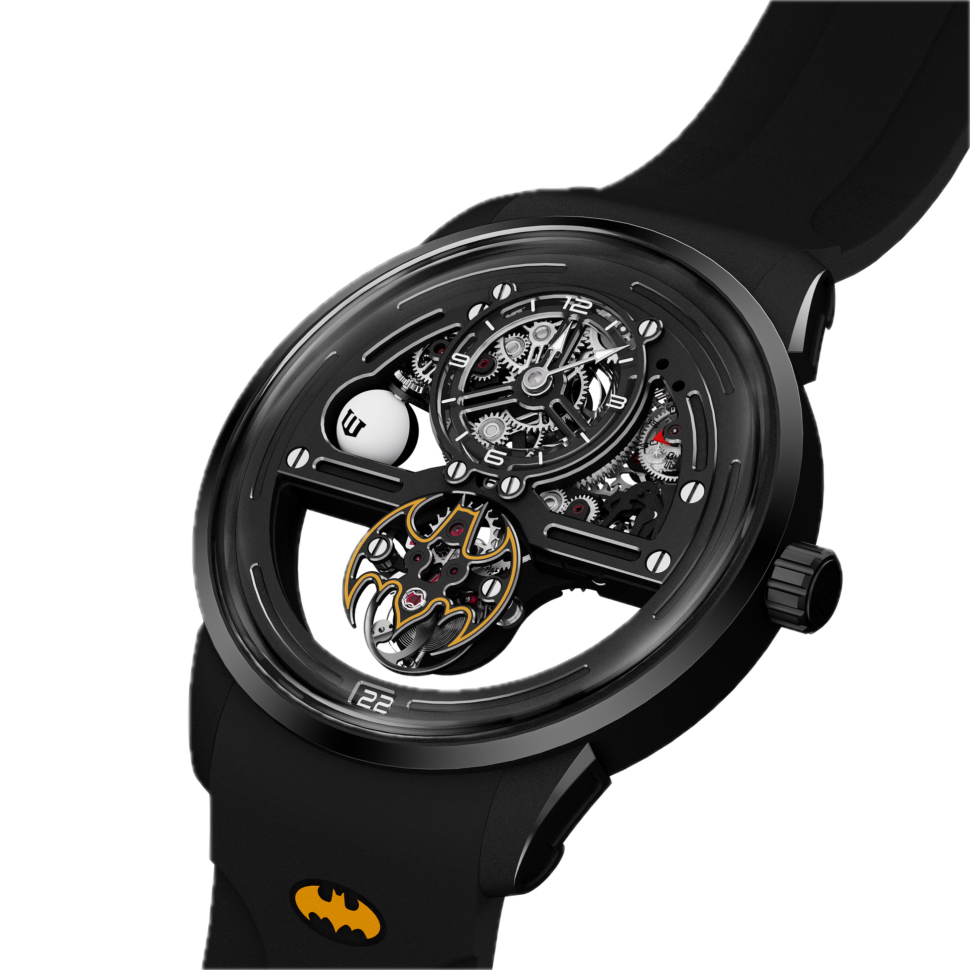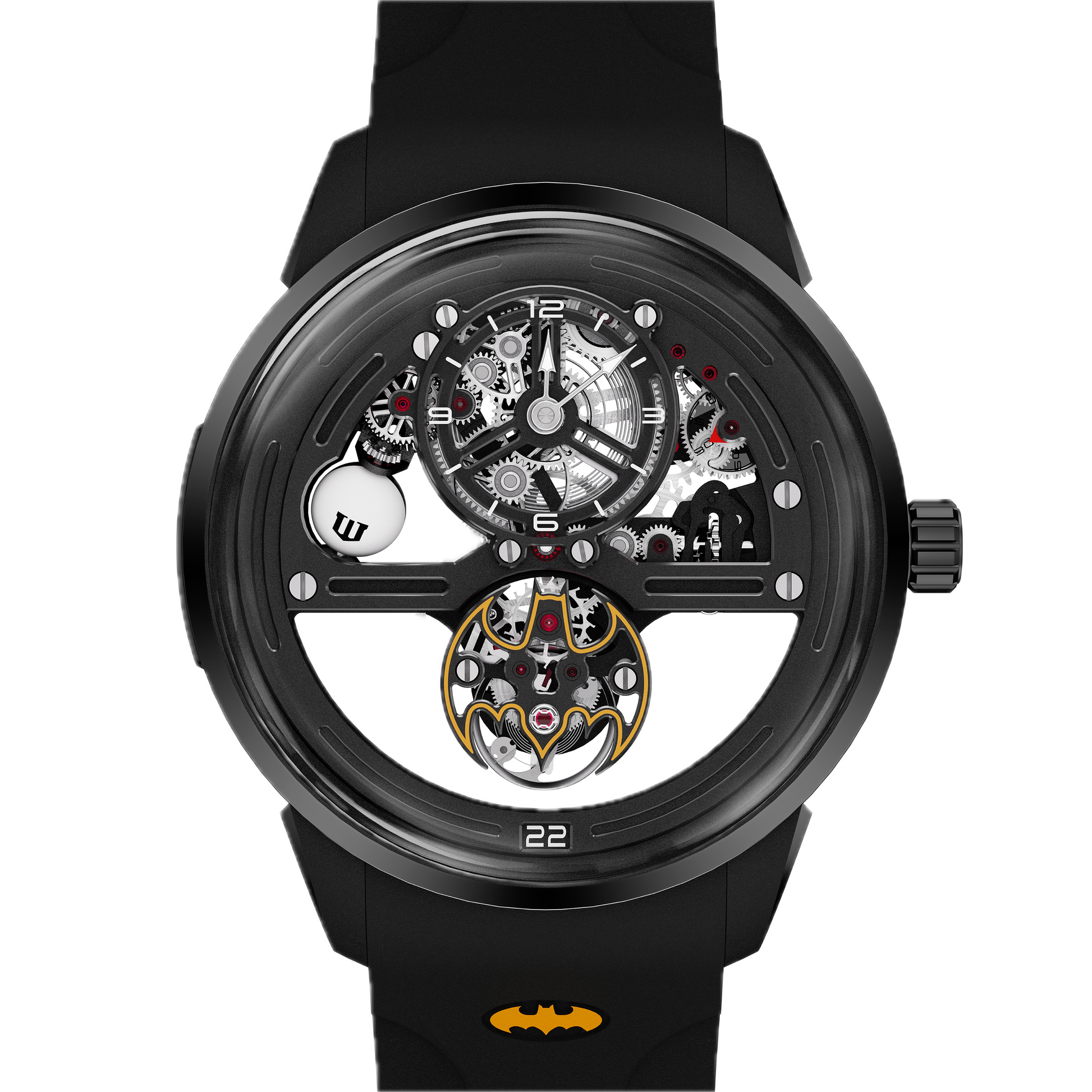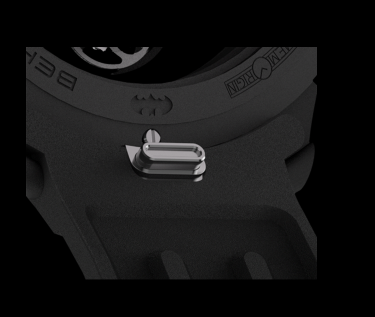 De ronde kast is zwart gecoat, passend bij het Batman-thema, met saffierkristallen aan de boven- en onderkant, waardoor het uurwerk zichtbaar is. De kastaanzetten zijn opengewerkt voor een vleugje oppervlaktecoating.
