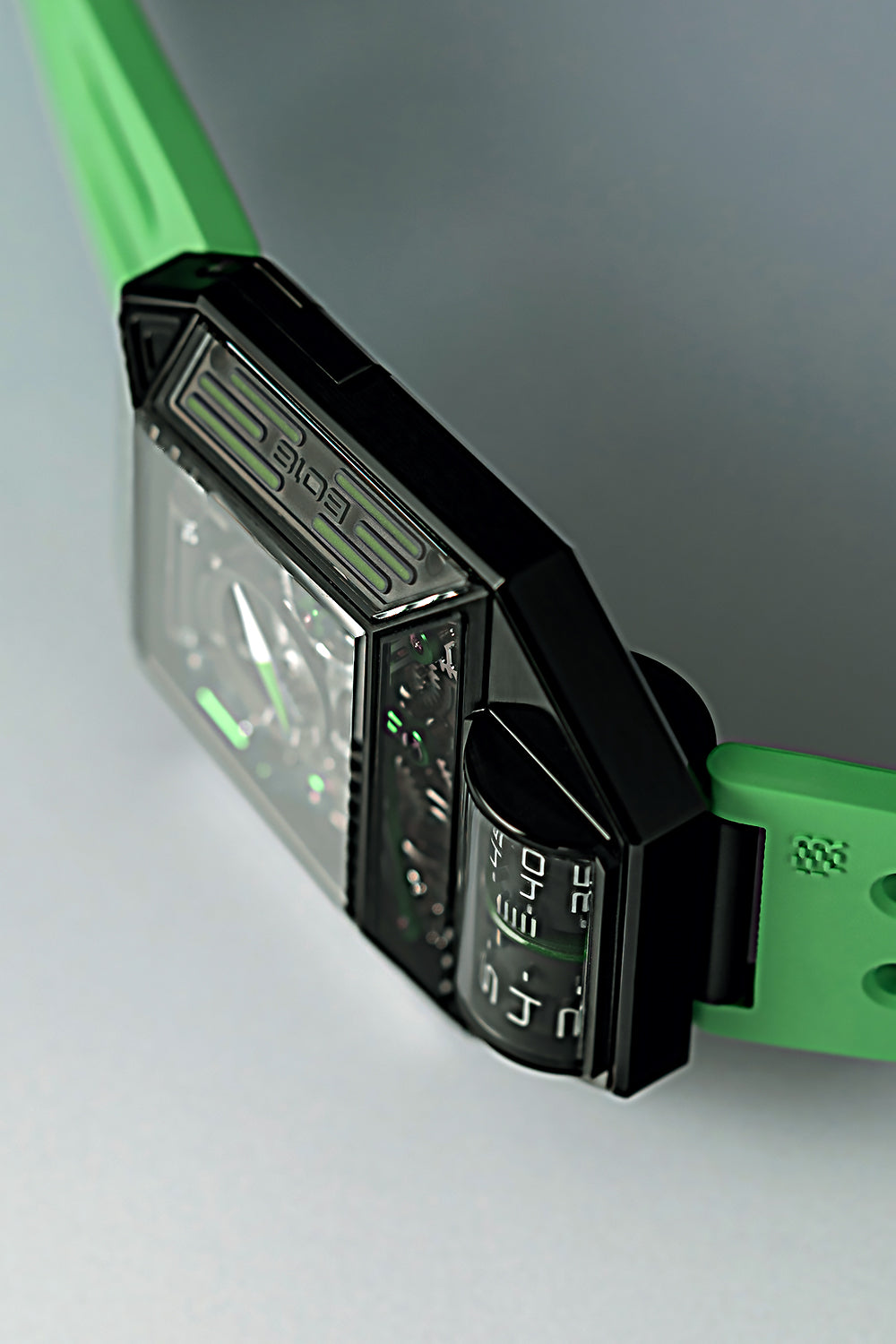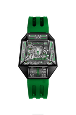 BEHRENS x WOS (Watches Of Switzerland) Limited edition (60 stuks) voor hun 60-jarig jubileum (2024) Orion One Automatic polshorloge met roltijdweergave (uren en minuten). Dit horloge wordt geleverd met een groene rubberen band en een zwarte rubberen band met een snelontgrendelingssysteem voor eenvoudig verwisselen van de band.