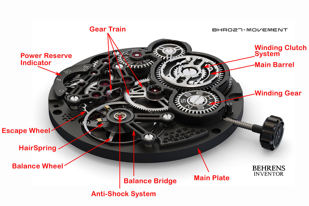 Kaliber: BEHRENS BM01 handopwindbaar, in eigen huis ontworpen, 2,5 Hz / 18.000 trillingen per uur