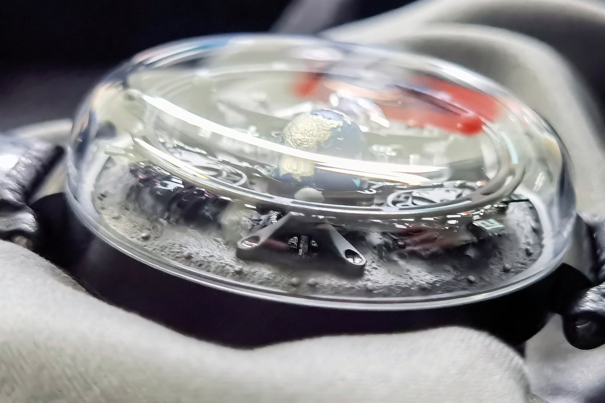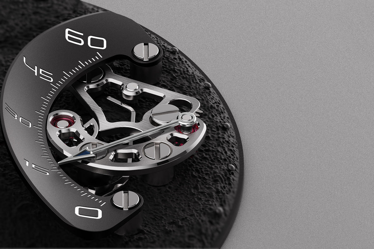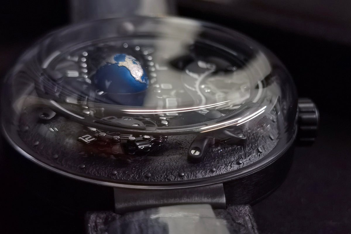Wijzerplaat geïnspireerd op het oppervlak van de maan, zwarte kleur
