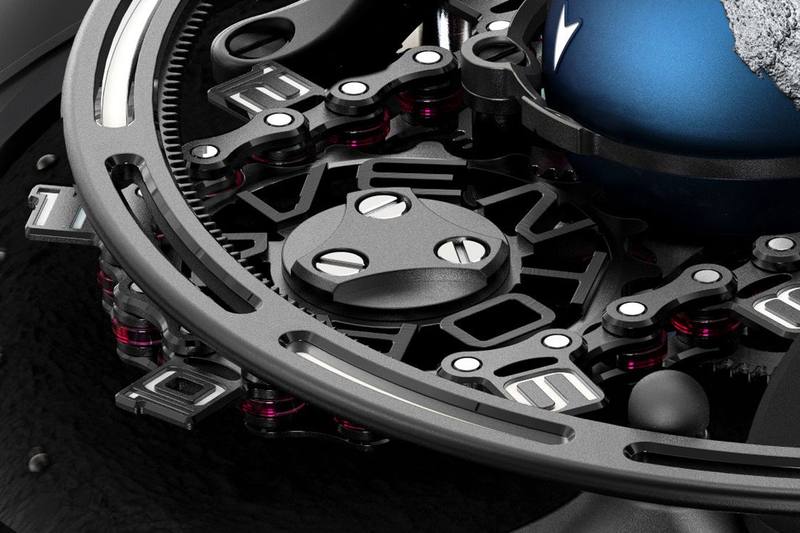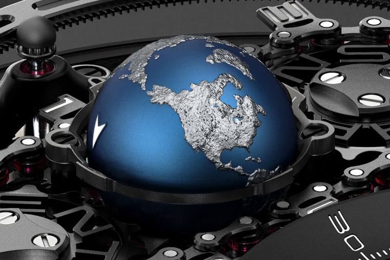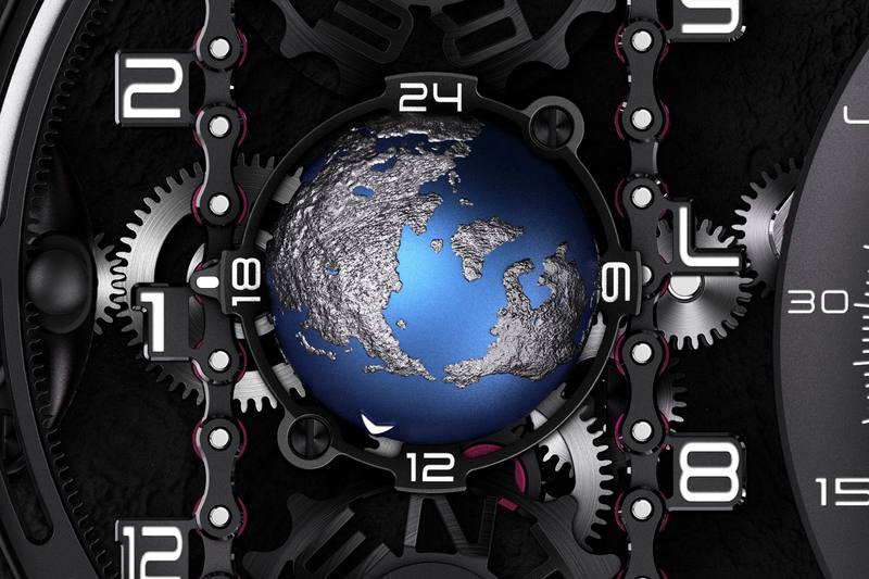 De ronde, zwart gecoate titanium kast van 43 mm herbergt een wijzerplaat geïnspireerd op het maanoppervlak, zichtbaar door een gewelfd saffierglas. Het robijnrode kettingsysteem minimaliseert wrijving voor een efficiënte krachtoverbrenging en levert uitzonderlijke precisie. De ketting bestaat uit robijnrode schakels, aangedreven door skeletachtige radertjes, voor een optimale aflezing van de uren. De Perigee is bovendien voorzien van een in het kaliber geïntegreerde gangreserve-indicator, voor een langdurige betrouwbaarheid.