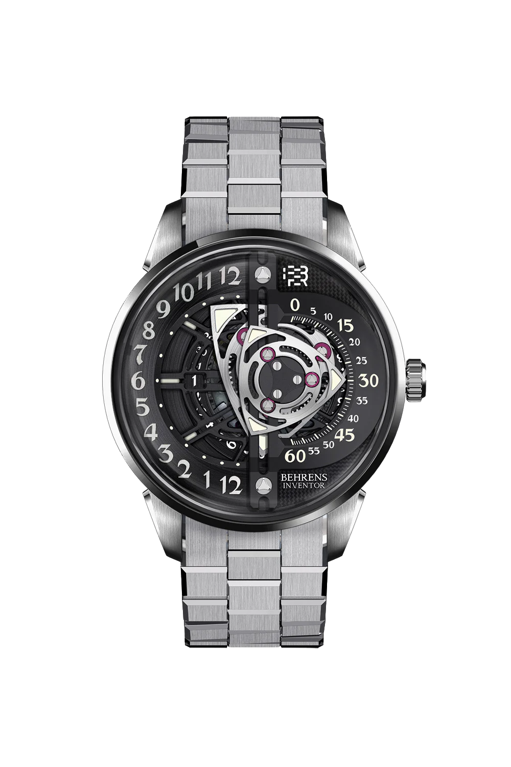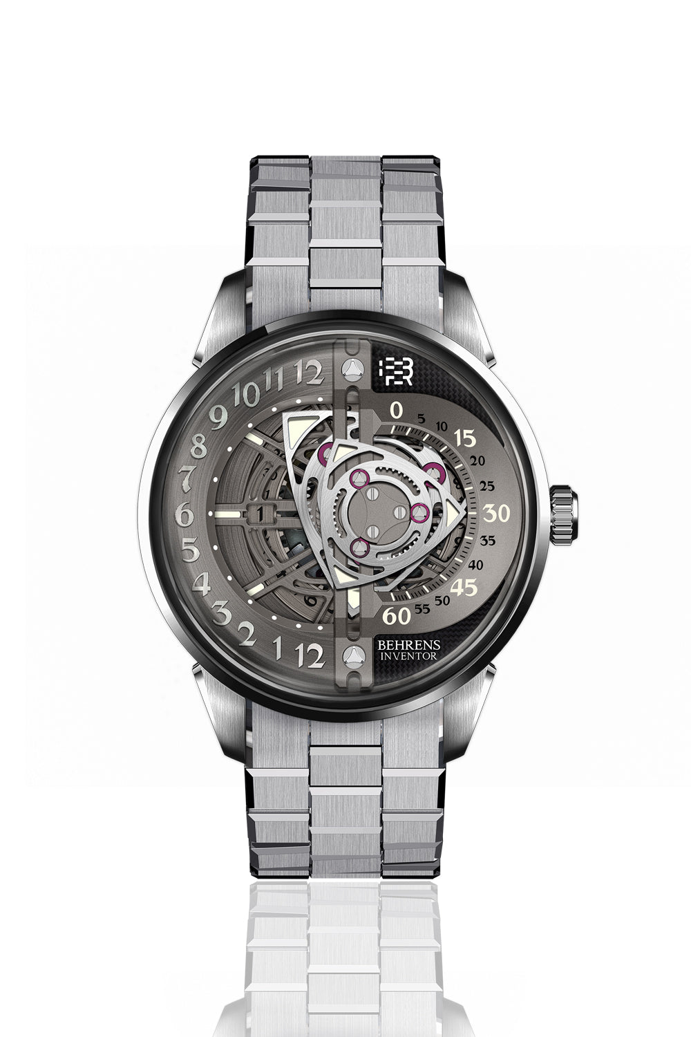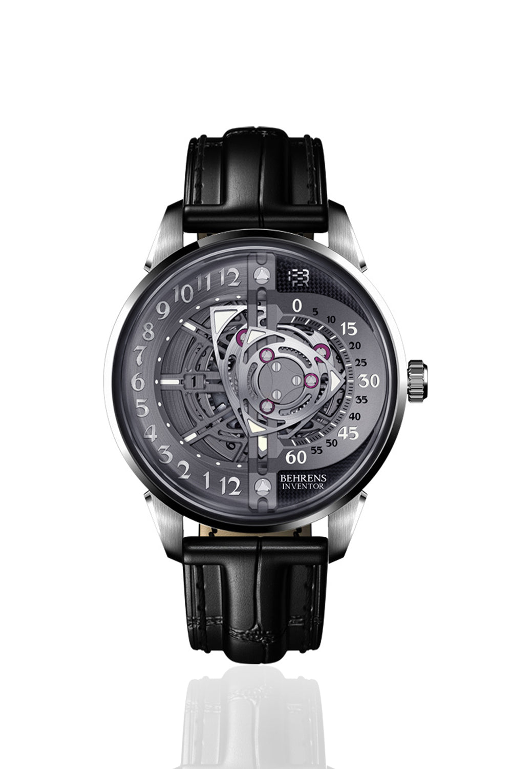 De wijzerplaat van de Behrens Rotary onderscheidt zich door zijn fascinerende design, waarbij de uren en minuten worden aangegeven door een set roterende schijven die ronddraaien om de tijd aan te geven. Dit ingenieuze mechanisme, zichtbaar door het antireflecterende saffierglas, creëert een dynamische en elegante visuele ervaring. De complexe kastconstructie benadrukt de hoogwaardige afwerking van dit uitzonderlijke horloge.