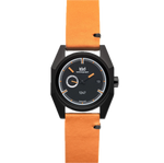 Het diepzwarte geborstelde oppervlak accentueert de karakteristieke kast en onderstreept het architectonische karakter. De combinatie van de "MITTERNACHT" kastkleur met het feloranje bandje onderstreept het opvallende design en het horloge wordt een symbool van de voortdurende verandering tussen dag en nacht.