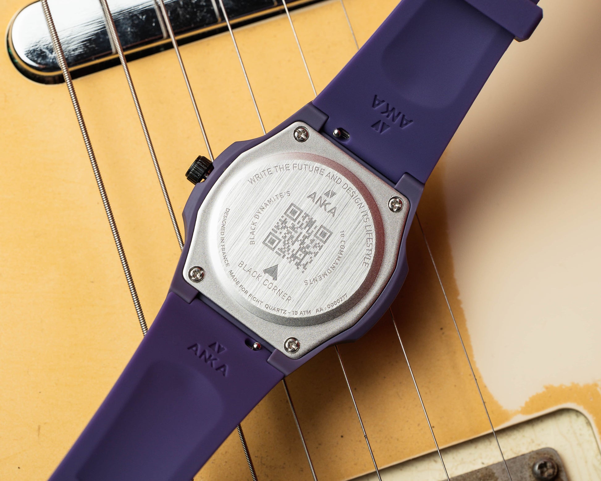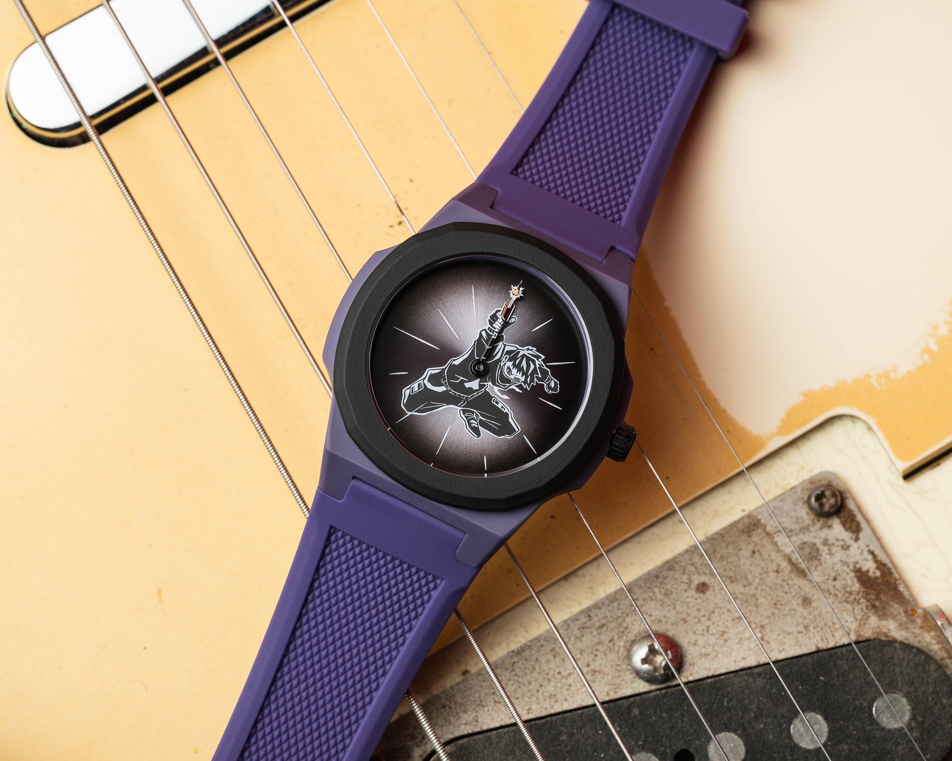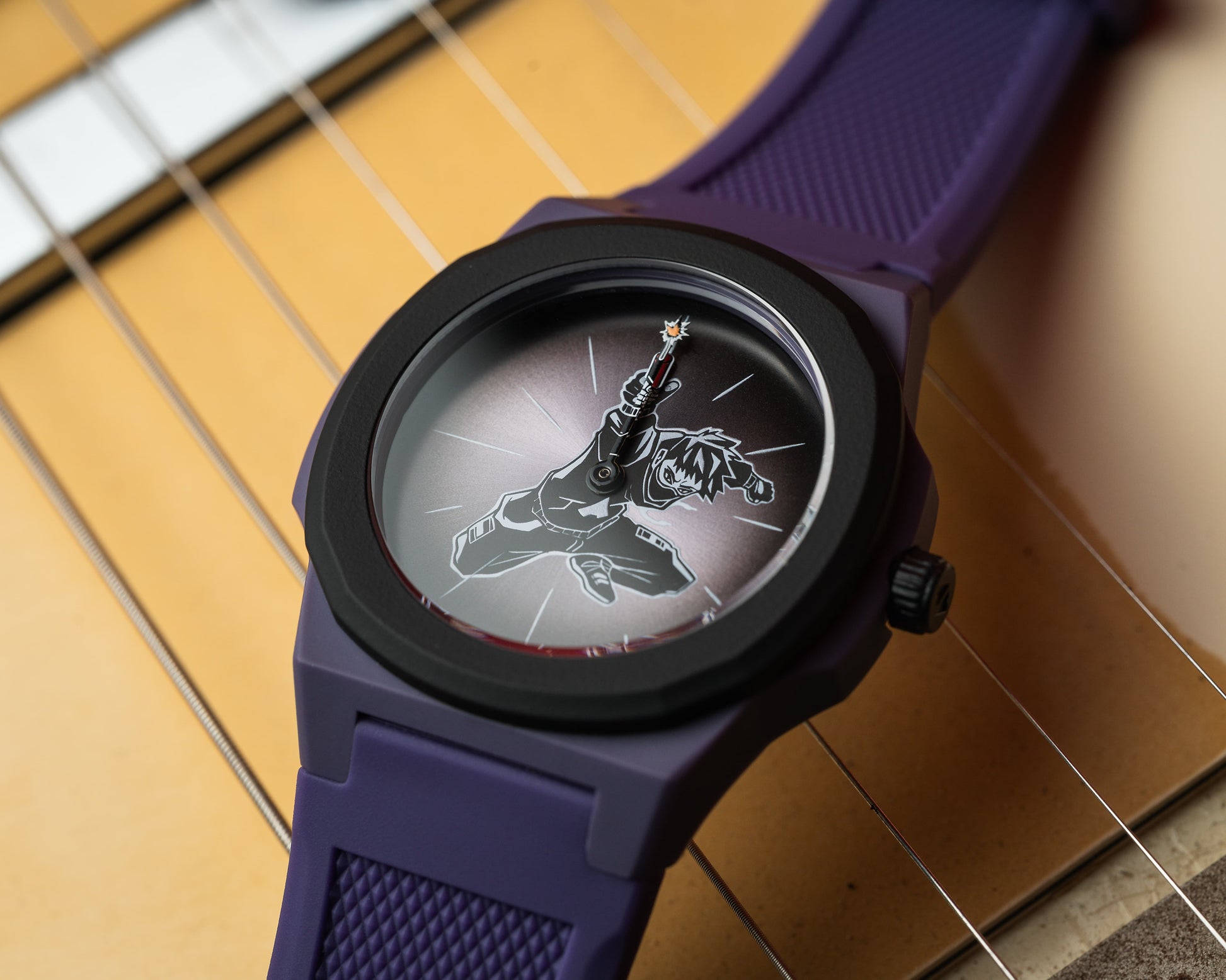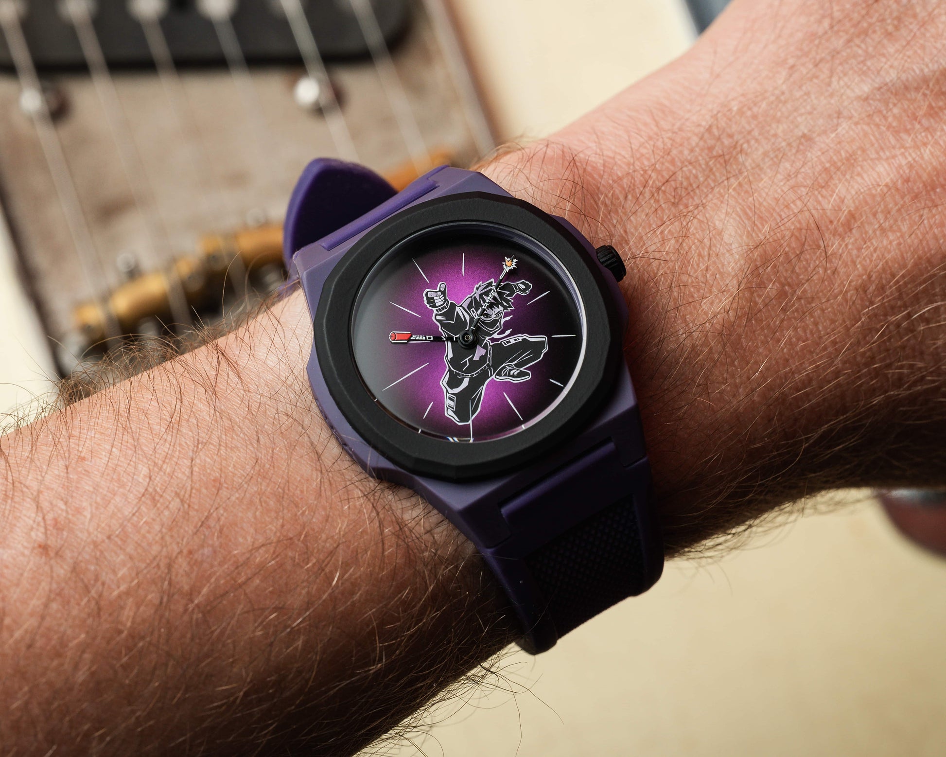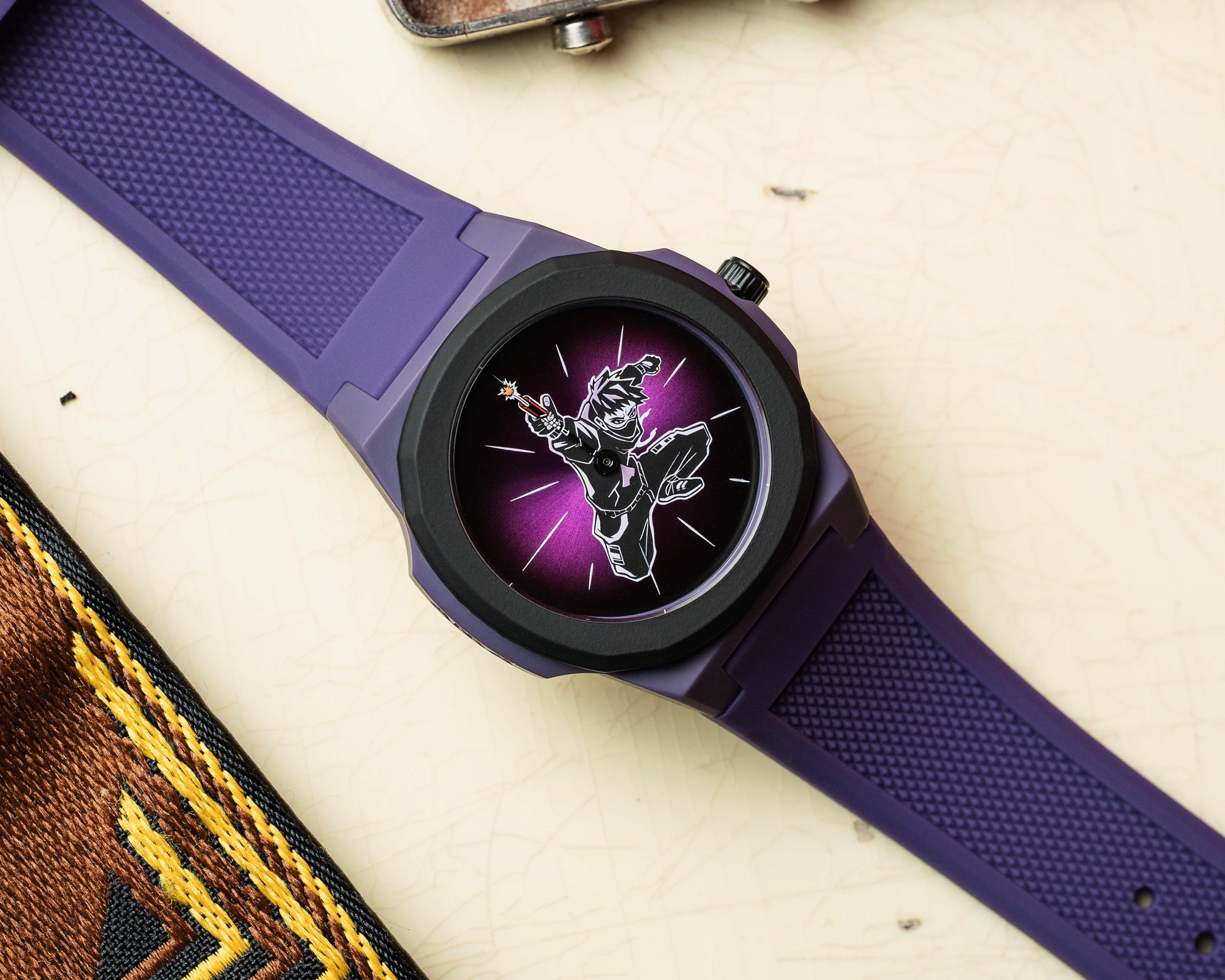 Als deze horlogecreatie zijn designinspiratie en grafische bron haalt uit het "Black Corner Cinematic Universe", dan zijn de Black Dynamite-vormgeving in het midden van de wijzerplaat, de antracietkleurige bezel eromheen en de paarse kleur van de kast en de band in het DNA van het label ook een vriendelijke ode aan een andere superheld, uit het MCU, deze. En een ondeugende knipoog naar een horloge-icoon dat deze superheld een paar jaar geleden in de schijnwerpers zette. Horlogeliefhebbers en -verzamelaars hebben al begrepen op wie onze subversieve, creatieve knipoog is gericht...