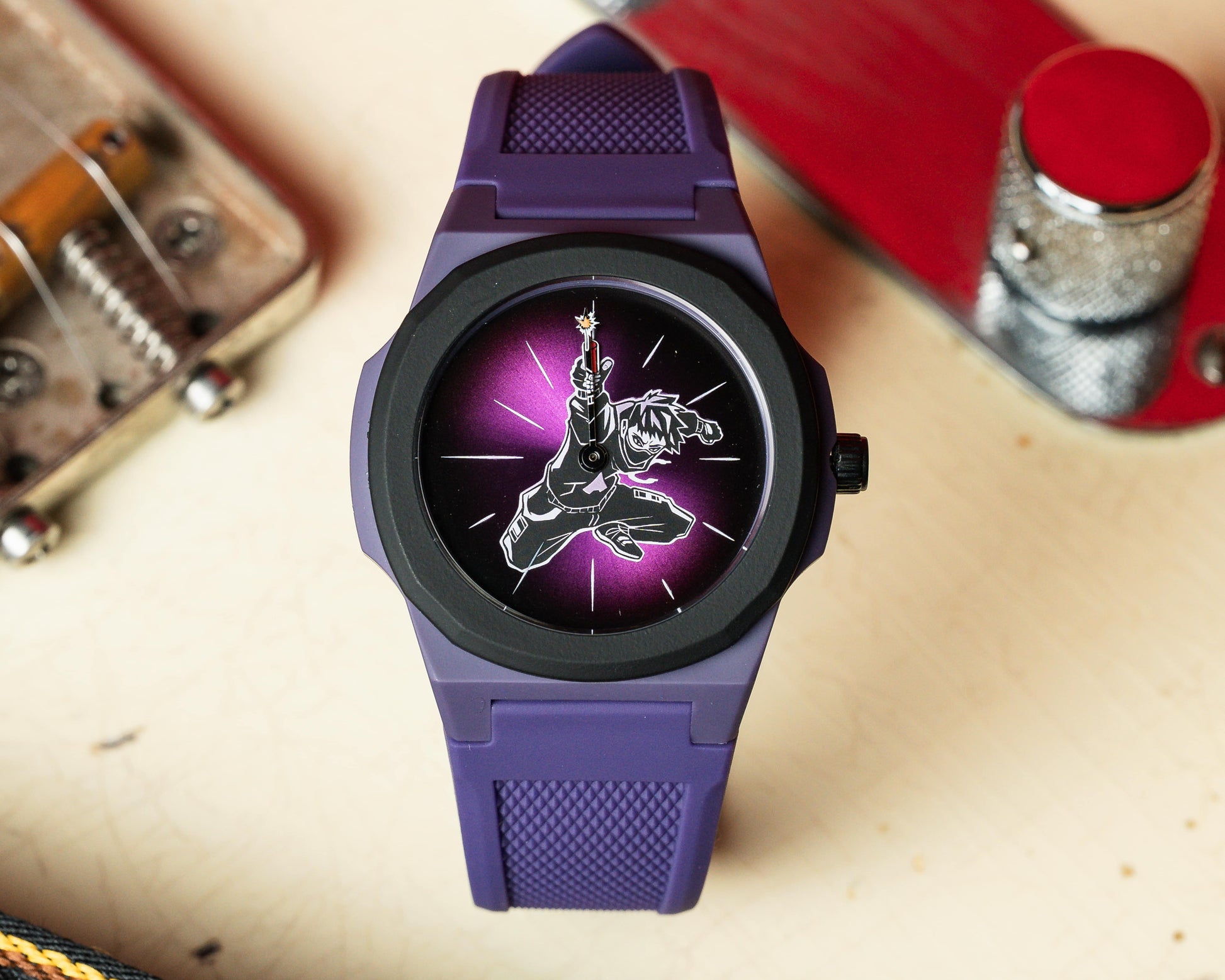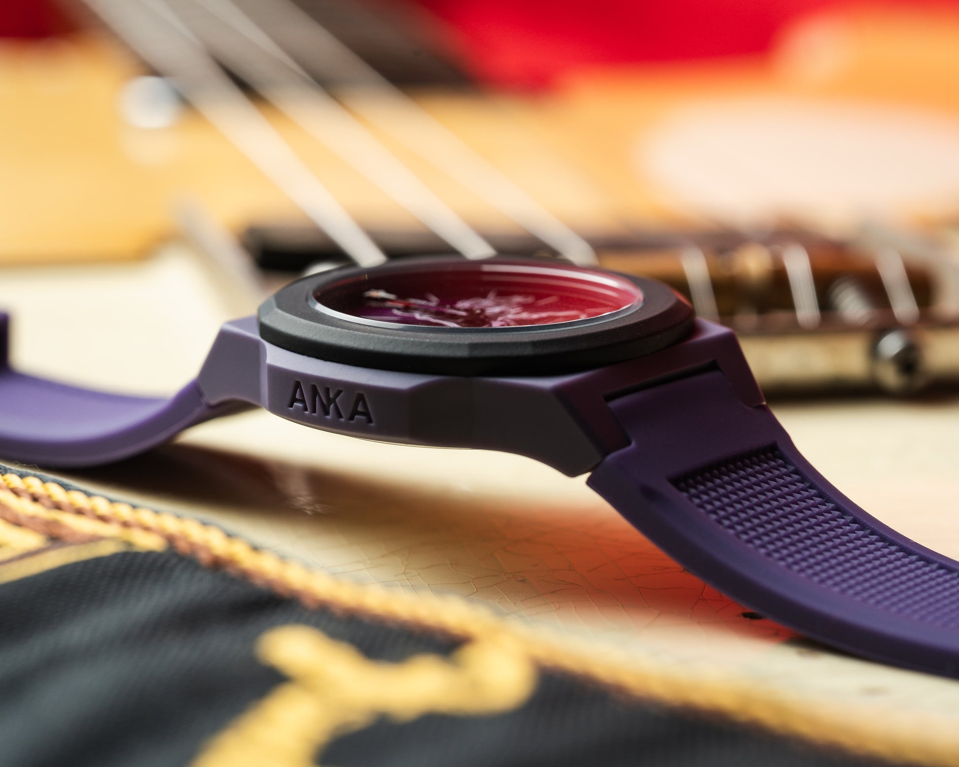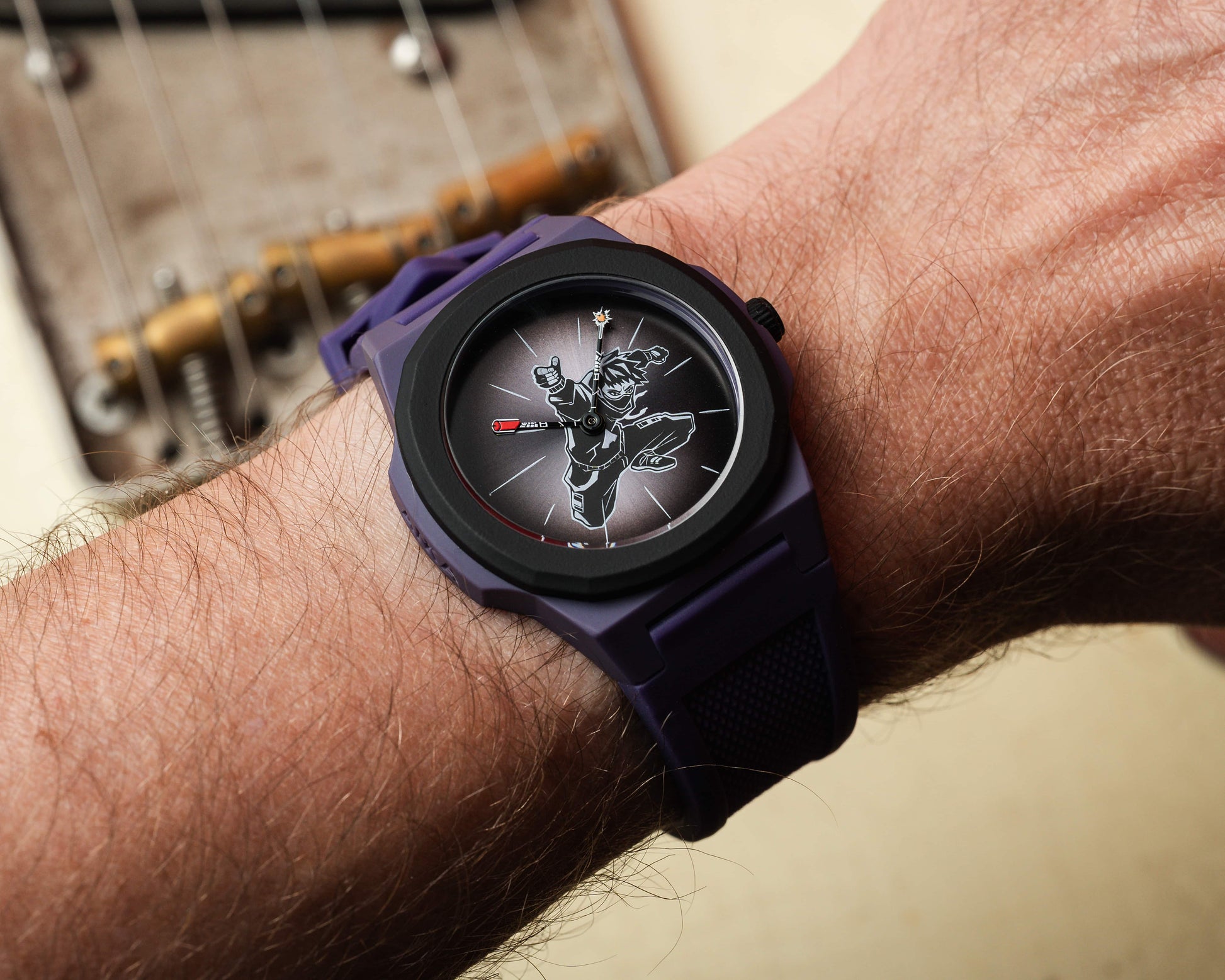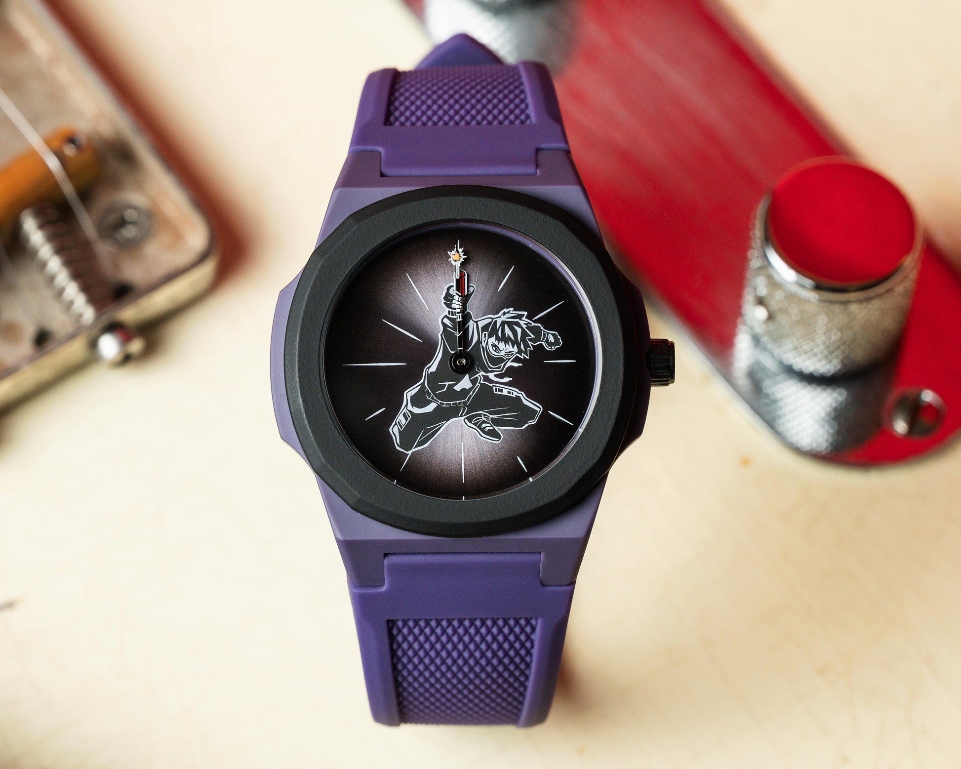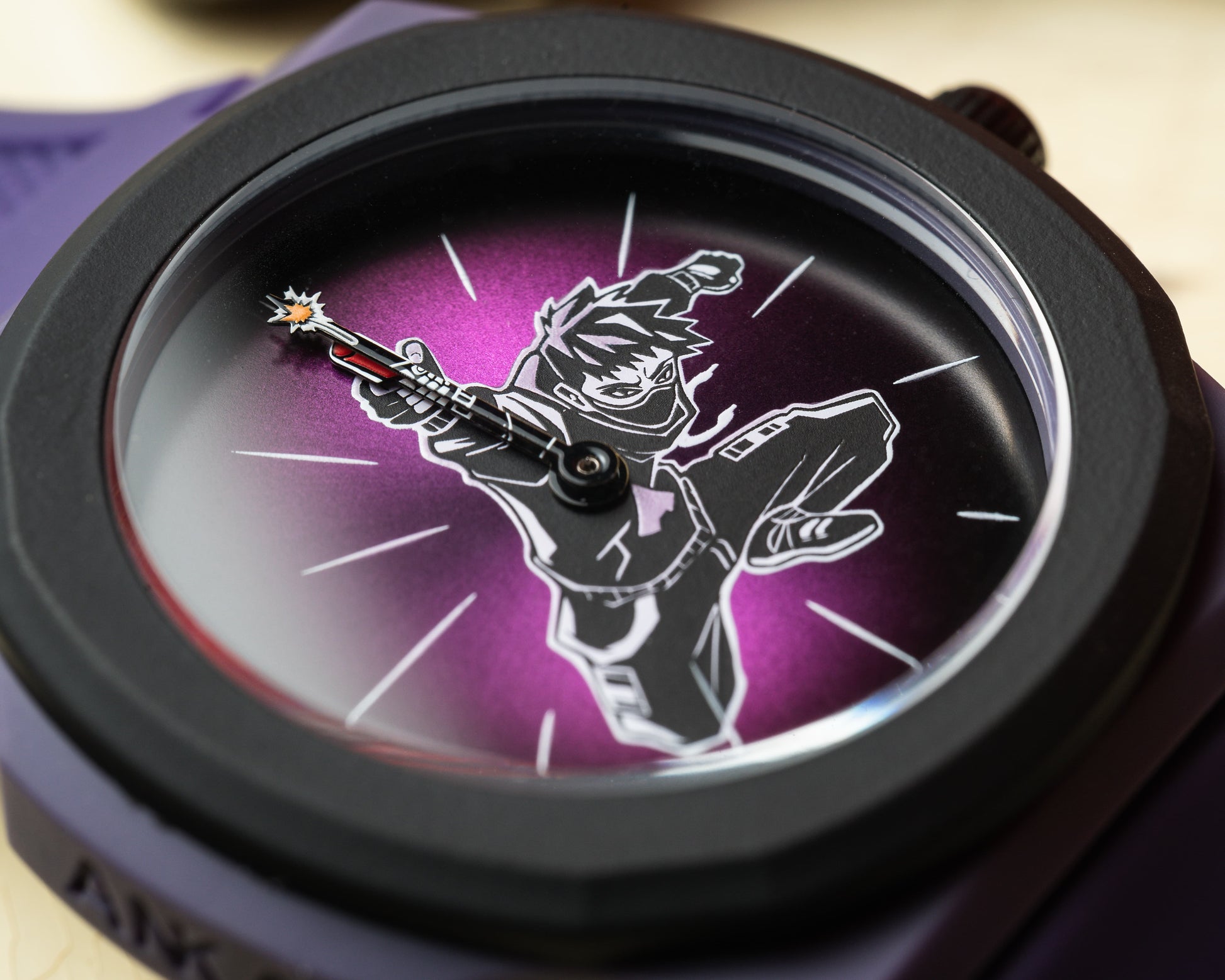 Als deze horlogecreatie zijn designinspiratie en grafische bron haalt uit het "Black Corner Cinematic Universe", dan zijn de Black Dynamite-vormgeving in het midden van de wijzerplaat, de antracietkleurige bezel eromheen en de paarse kleur van de kast en de band in het DNA van het label ook een vriendelijke ode aan een andere superheld, uit het MCU, deze. En een ondeugende knipoog naar een horloge-icoon dat deze superheld een paar jaar geleden in de schijnwerpers zette. Horlogeliefhebbers en -verzamelaars hebben al begrepen op wie onze subversieve, creatieve knipoog is gericht...
