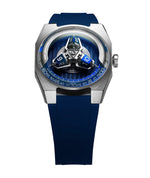 Armen van roestvrij staal 316L, geanodiseerde aluminium roterende uurschijf en wijzerplaat met Genève-patroon, Super-Luminova™ gecoate cijfers op de halfronde minutenbalk en roterende uurschijf