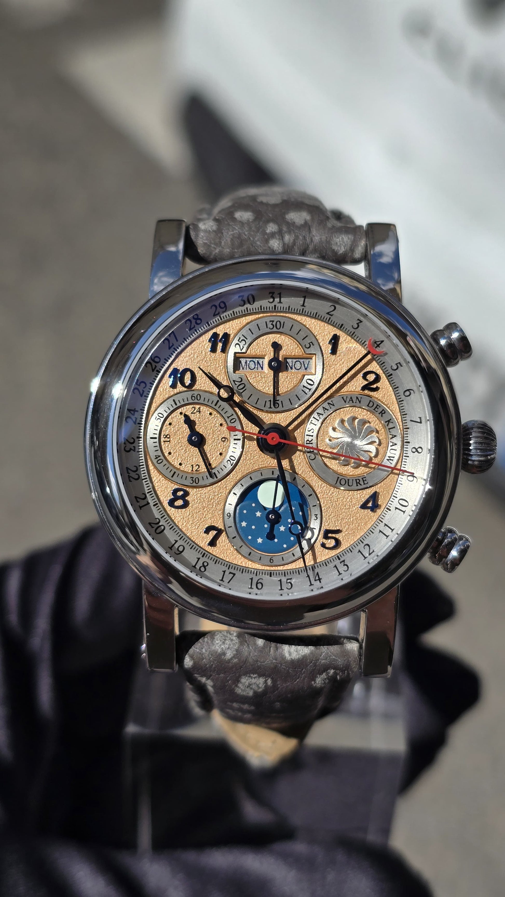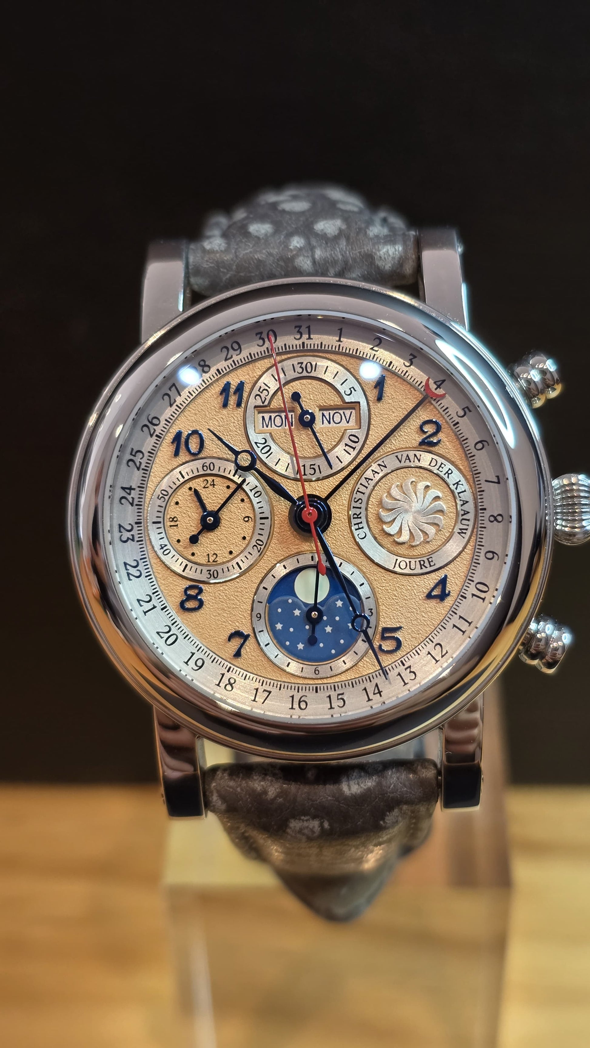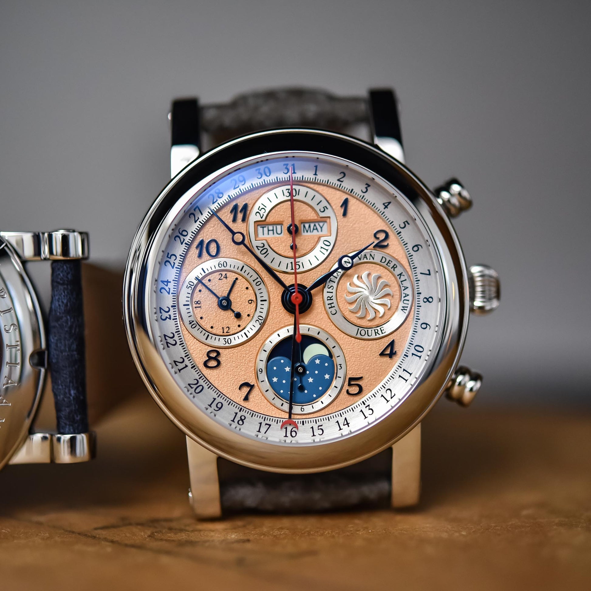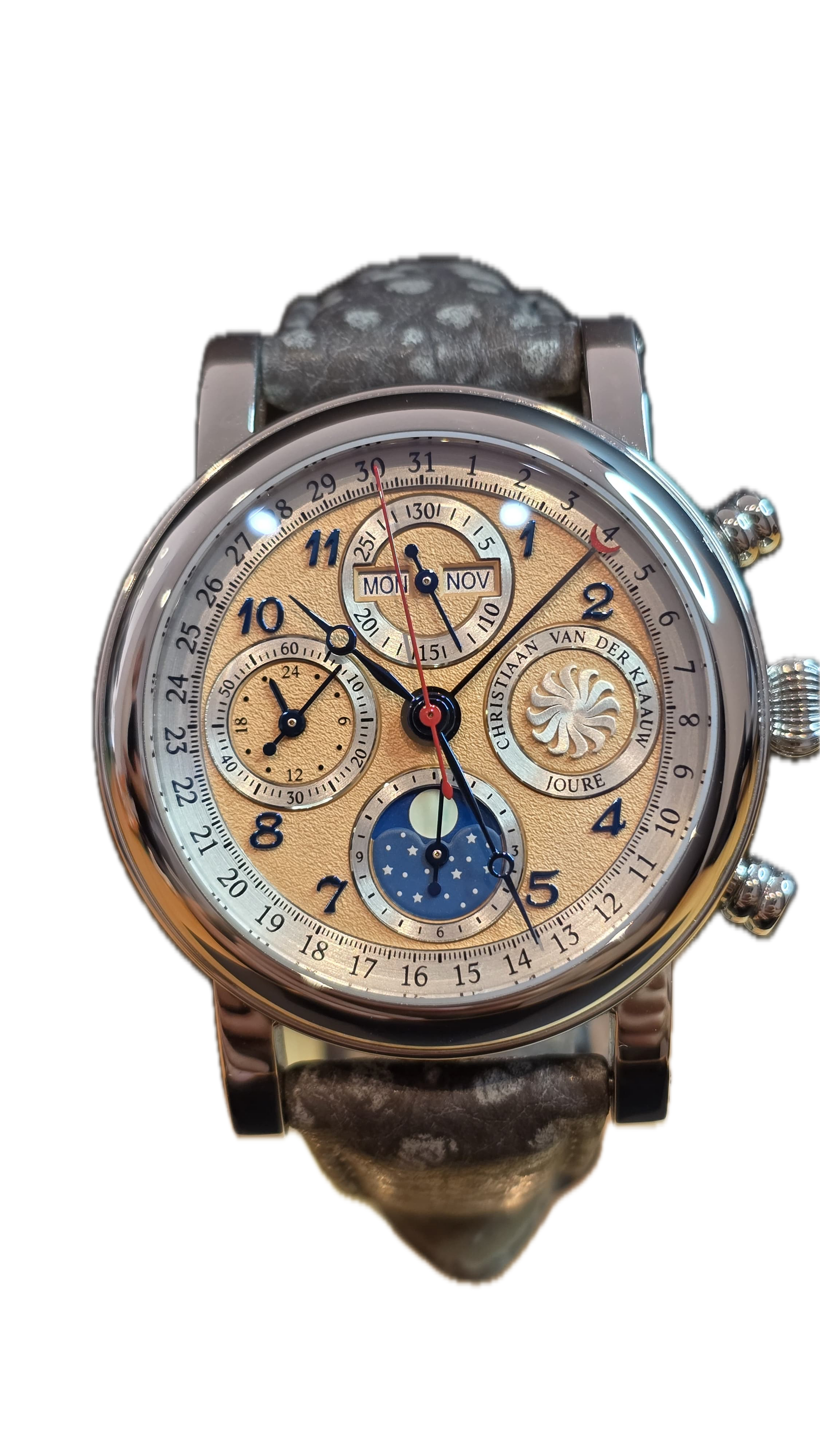 Uurwerk: kaliber CVDK7758 (Valjoux-basis) – automatische nokkenas-chronograaf met kalender en maanfasen – 25 juwelen – 28.800 trillingen/uur – gangreserve van 48 uur – rotor geguillocheerd en gegraveerd door Jochen Benzinger – functies: uren, minuten, kleine secondewijzer, volledige kalender met datum met de hand, dag van de week en maand, dag/nacht-indicator, maanfase, chronograaf met 30-minuten- en 12-uurstellers