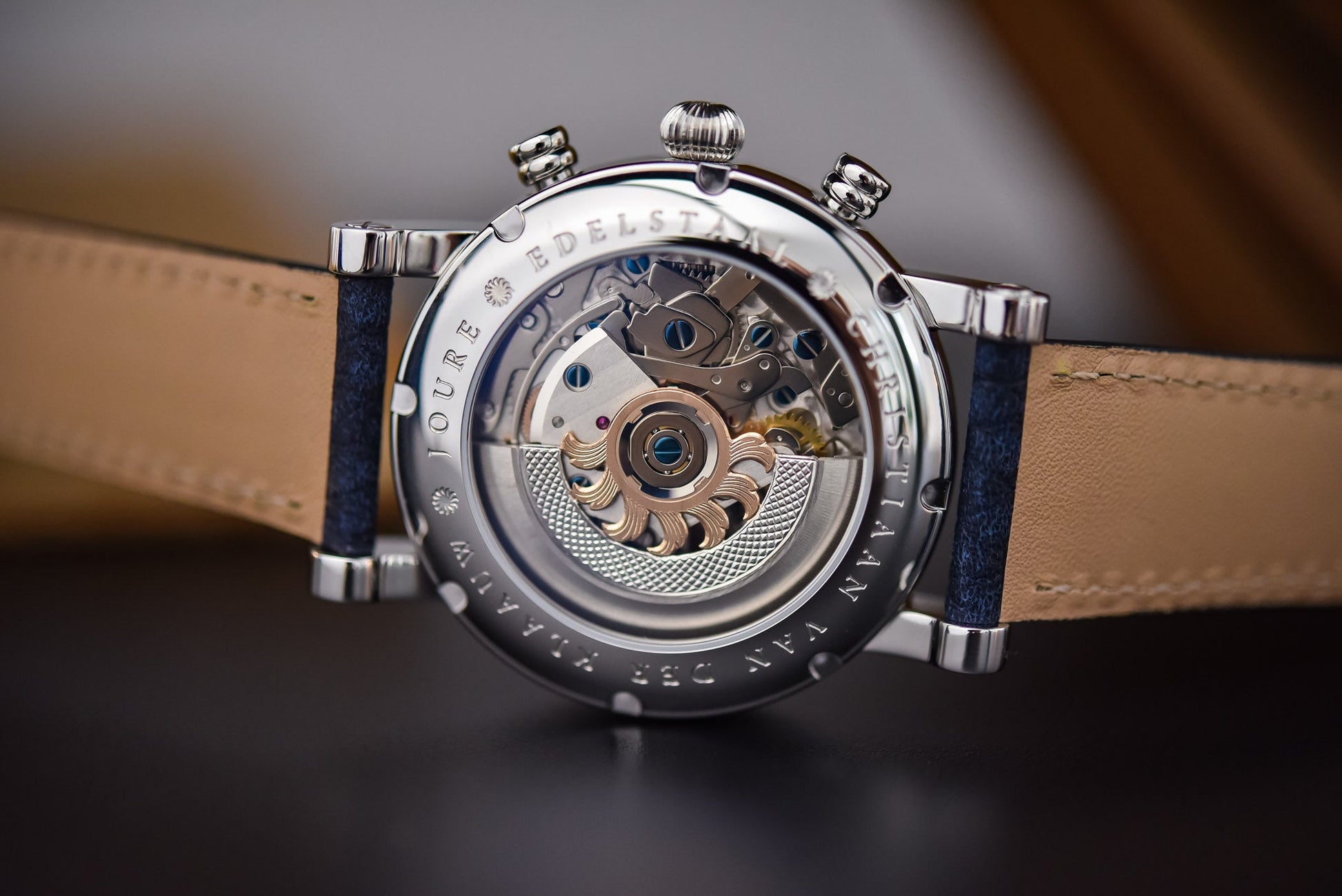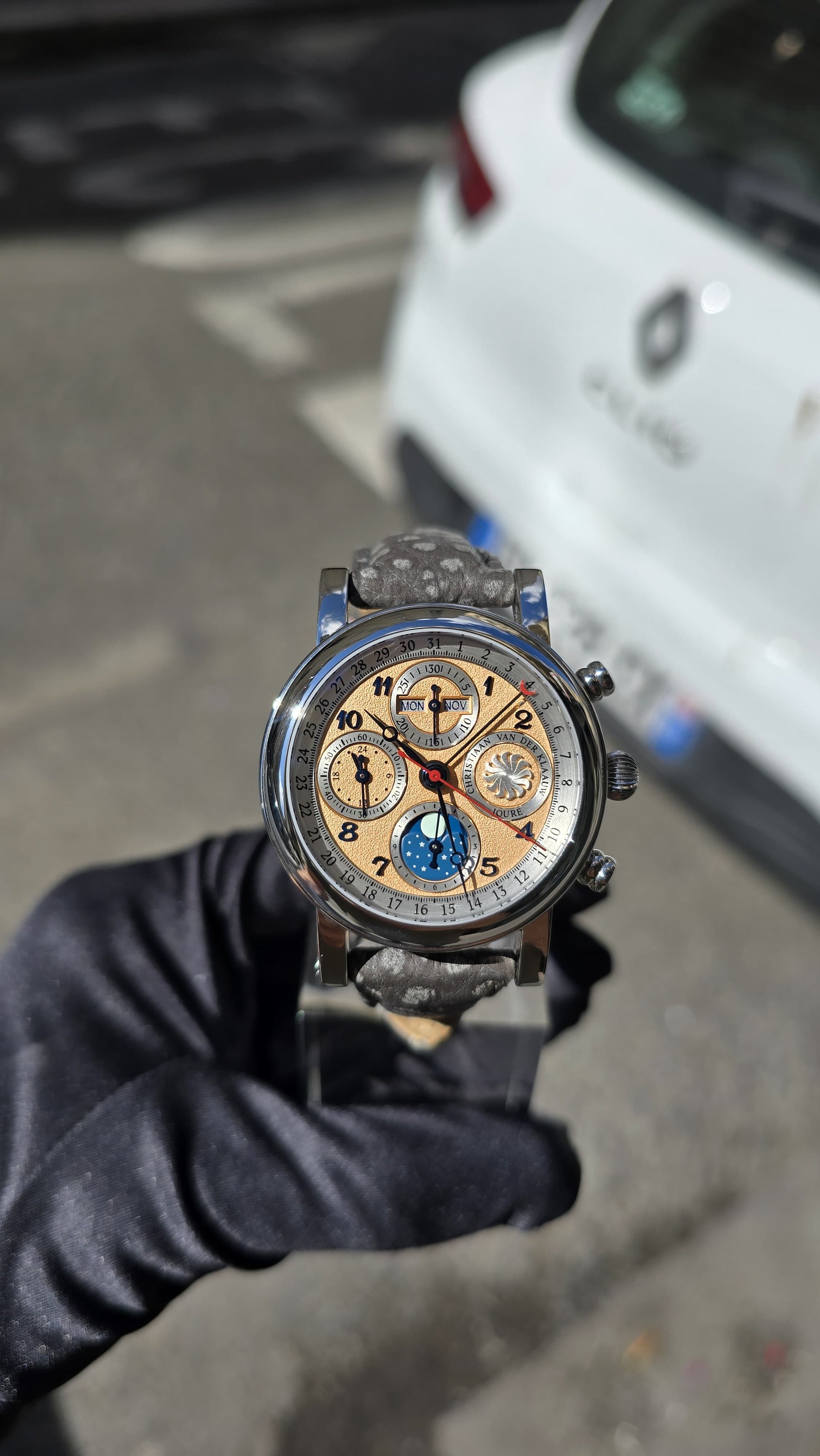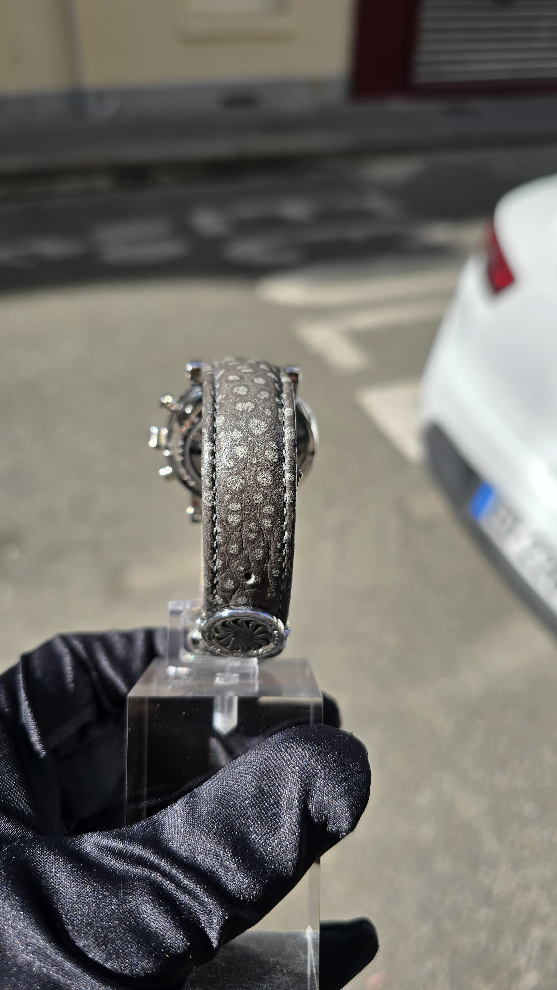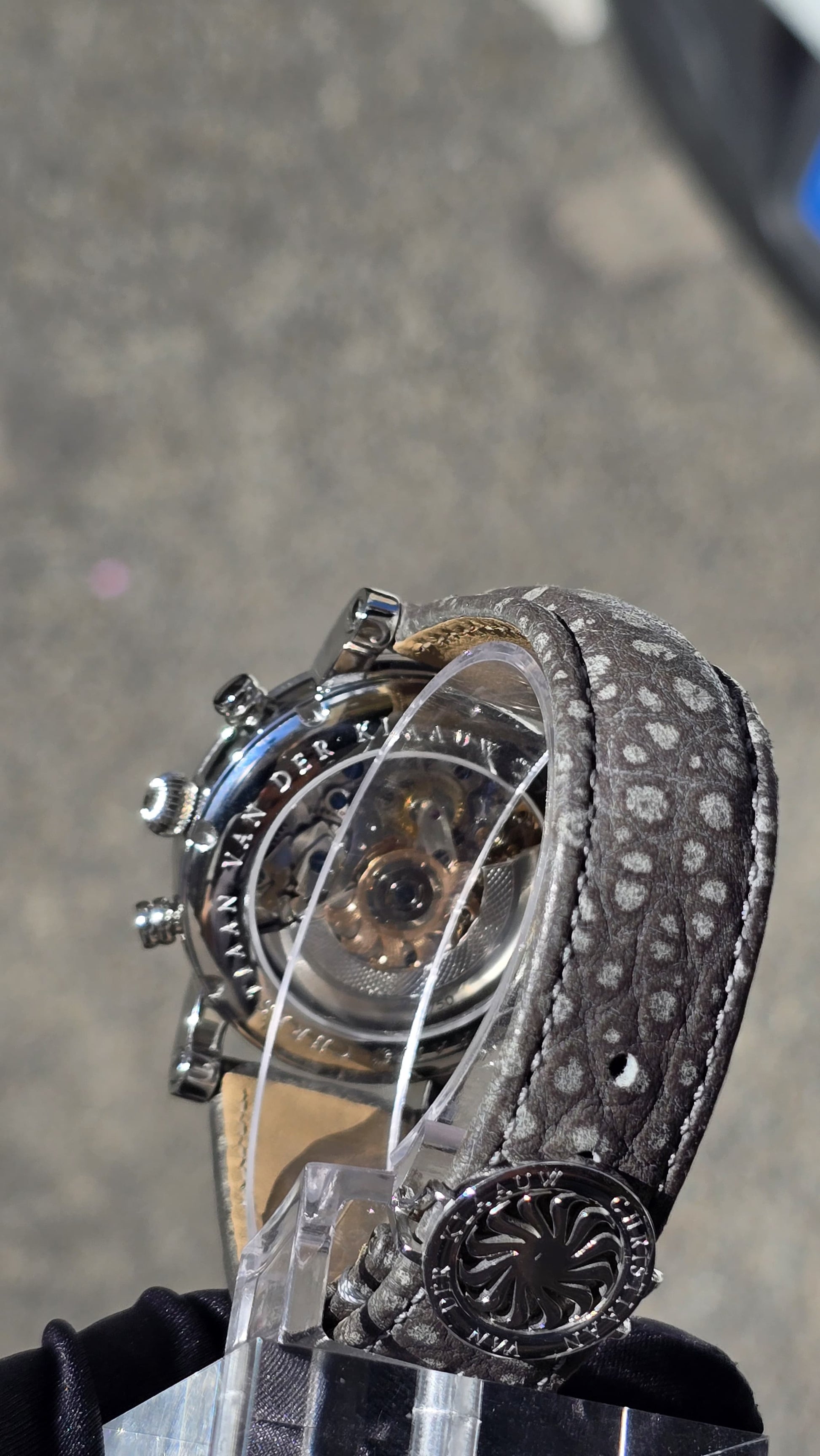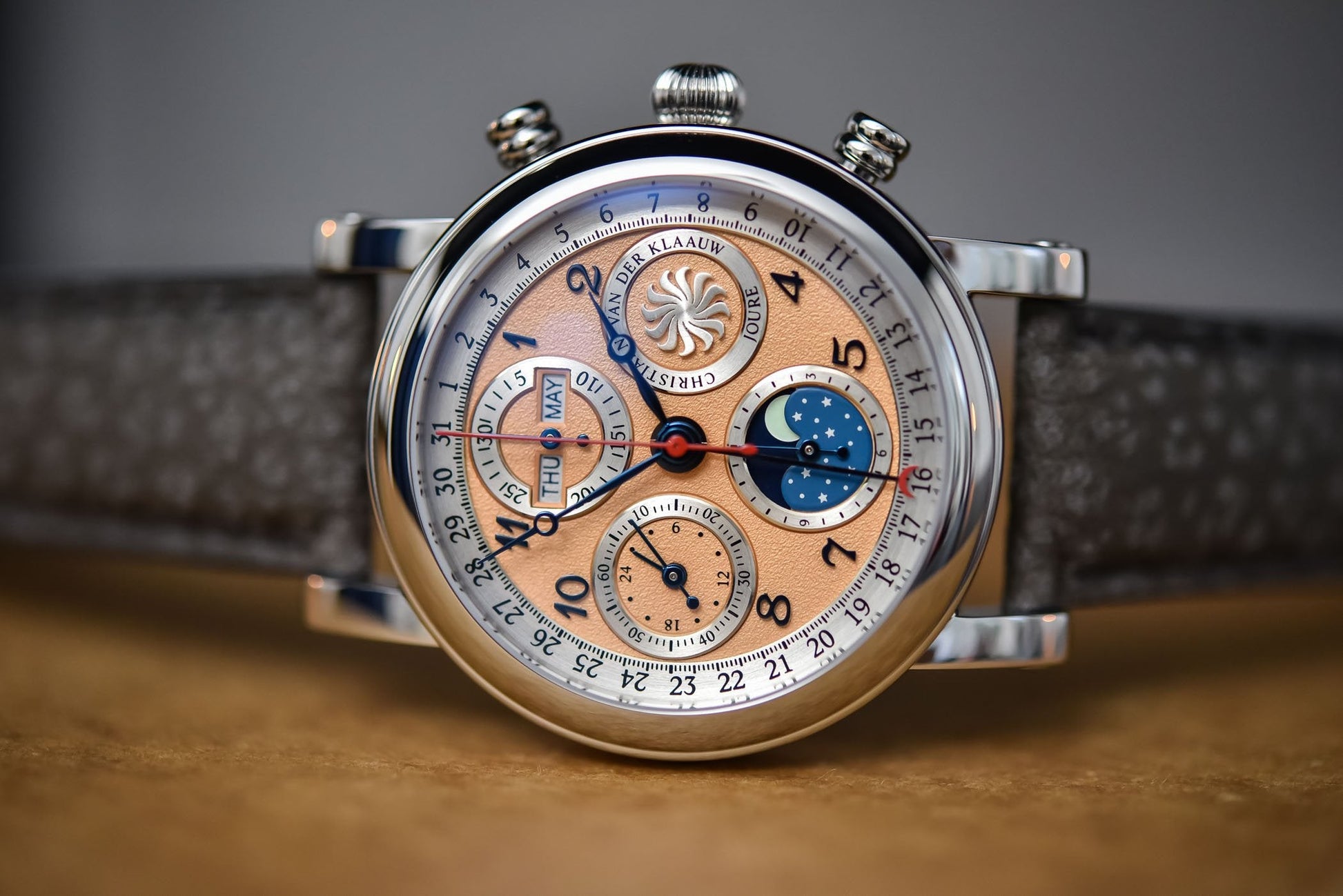 Uurwerk: kaliber CVDK7758 (Valjoux-basis) – automatische nokkenas-chronograaf met kalender en maanfasen – 25 juwelen – 28.800 trillingen/uur – gangreserve van 48 uur – rotor geguillocheerd en gegraveerd door Jochen Benzinger – functies: uren, minuten, kleine secondewijzer, volledige kalender met datum met de hand, dag van de week en maand, dag/nacht-indicator, maanfase, chronograaf met 30-minuten- en 12-uurstellers