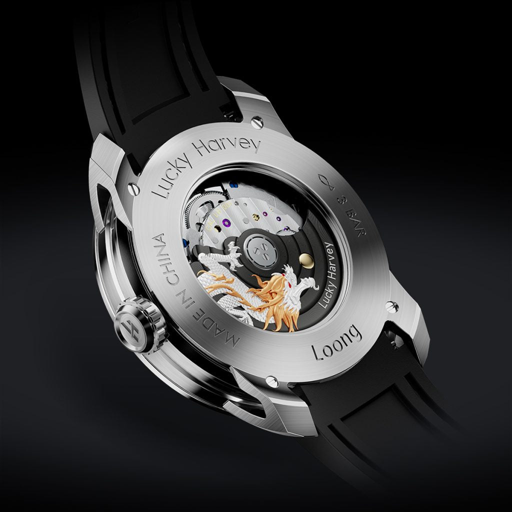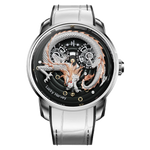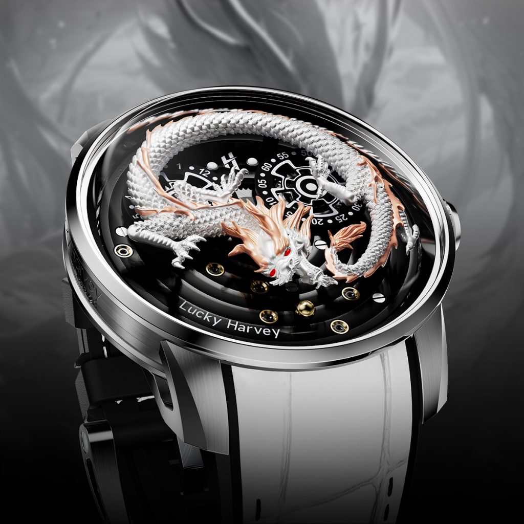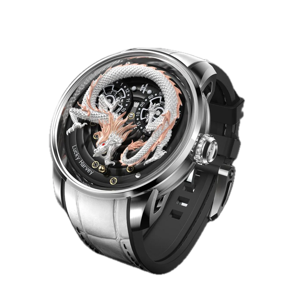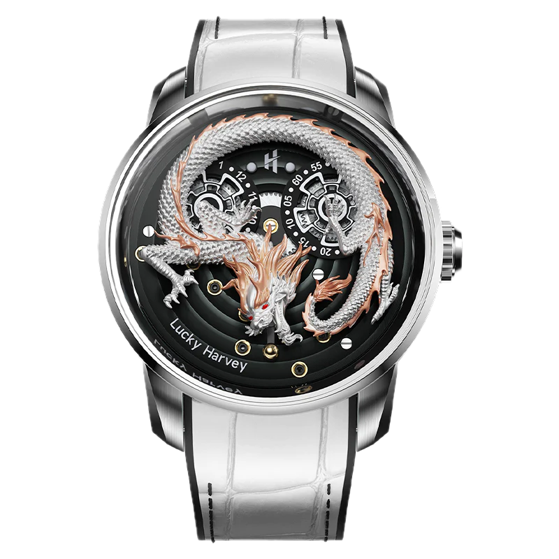 De Lucky Harvey Dragon White is een uniek horloge dat traditioneel vakmanschap combineert met een gedurfde stijl. De gedetailleerde wijzerplaat toont een majestueuze draak, een symbool van macht en geluk, tegen een diepzwarte wijzerplaat die direct de aandacht trekt. Het automatische uurwerk zorgt voor een feilloze precisie, terwijl de rubberen en leren band de luxe uitstraling versterkt. Dit horloge is ideaal voor liefhebbers van originele ontwerpen en combineert stijl en symboliek in een uniek horloge.
