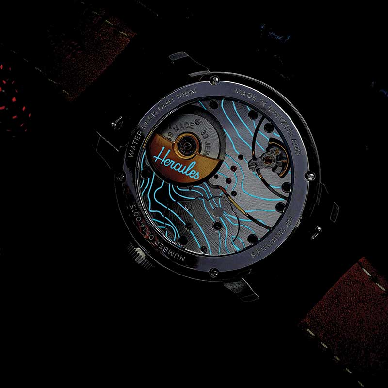 • Gravure : Lijnen die de hoogte van de bergen weergeven, gevuld met SuperLuminova BGW9.
