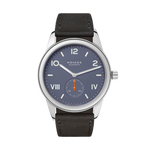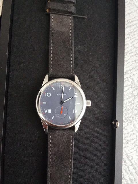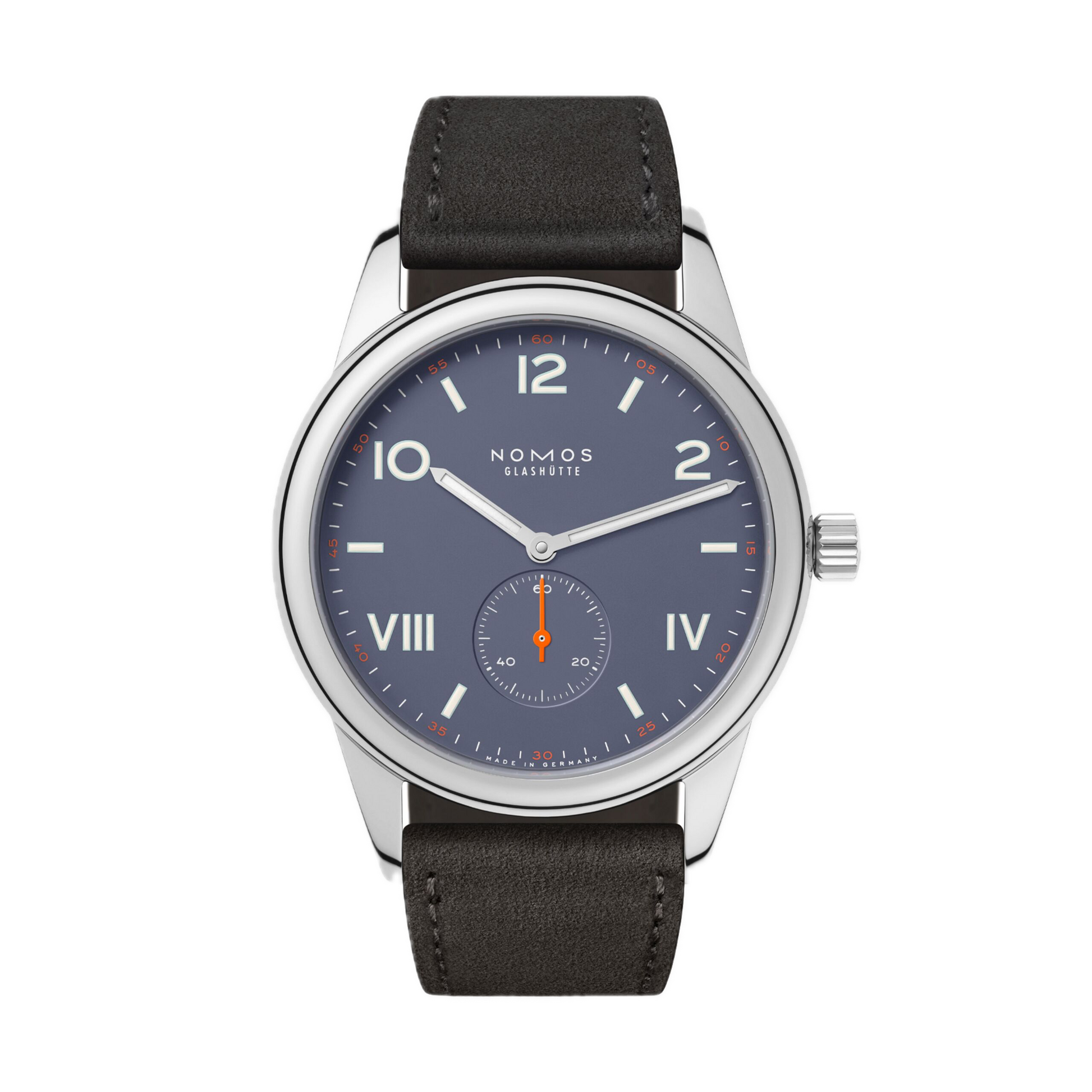 Een horloge voor elke gelegenheid. De Club Campus 38 blauwpaars heeft een solide gepolijste stalen kast met een brede bezel en is waterbestendig tot 100 meter. De cijfers, wijzers en indexen zijn gecoat met SuperLumiNova en lichten blauw op in het donker en onder water. De wijzerplaat is helder en contrastrijk. De elektrisch oranje minuten- en secondecijfers verbeteren de afleesbaarheid, terwijl de vloeiende secondewijzer ook in elektrisch oranje draait. Dit handopwindbare horloge van Glashütte wordt aangedreven door het betrouwbare NOMOS Alpha-kaliber.