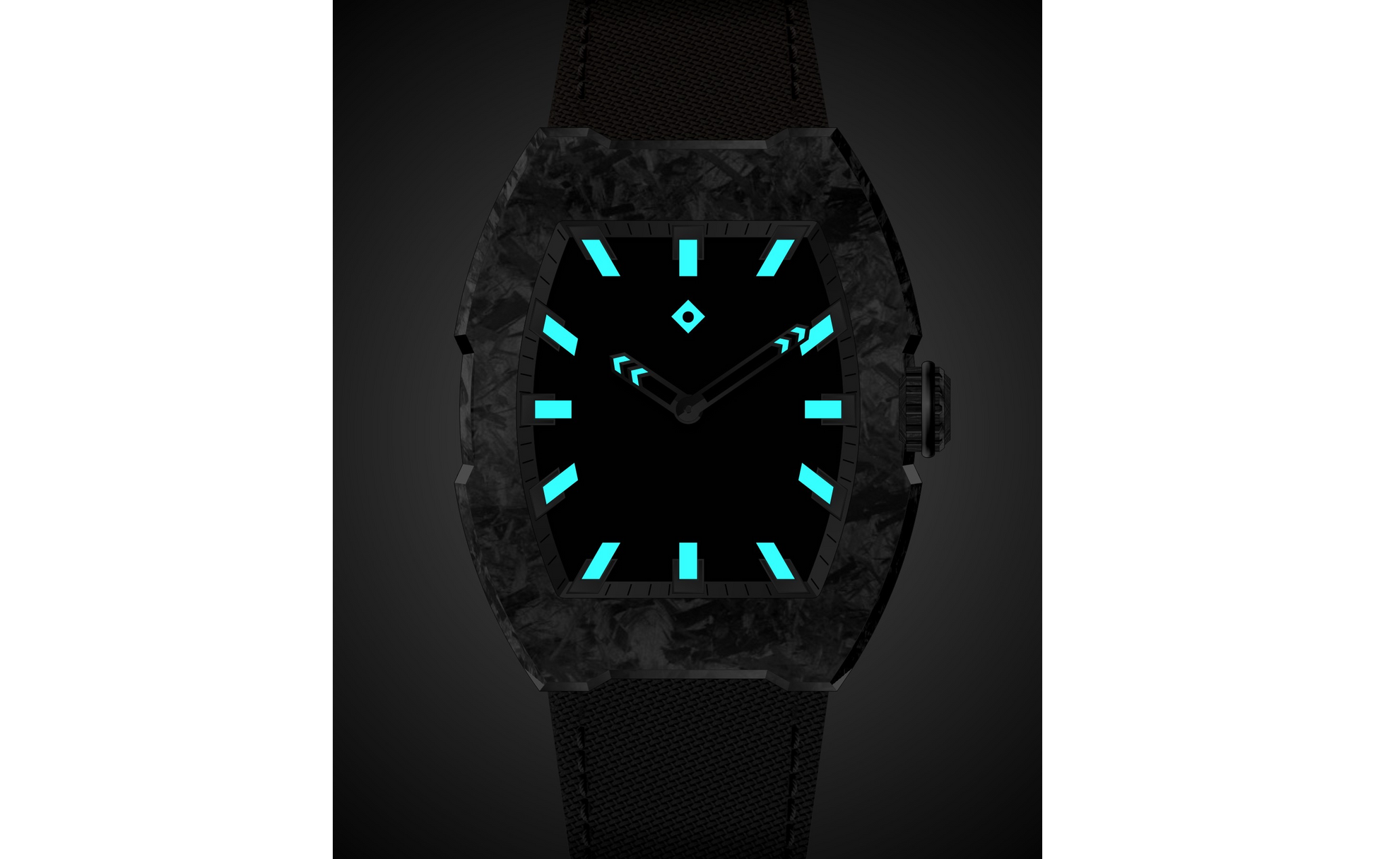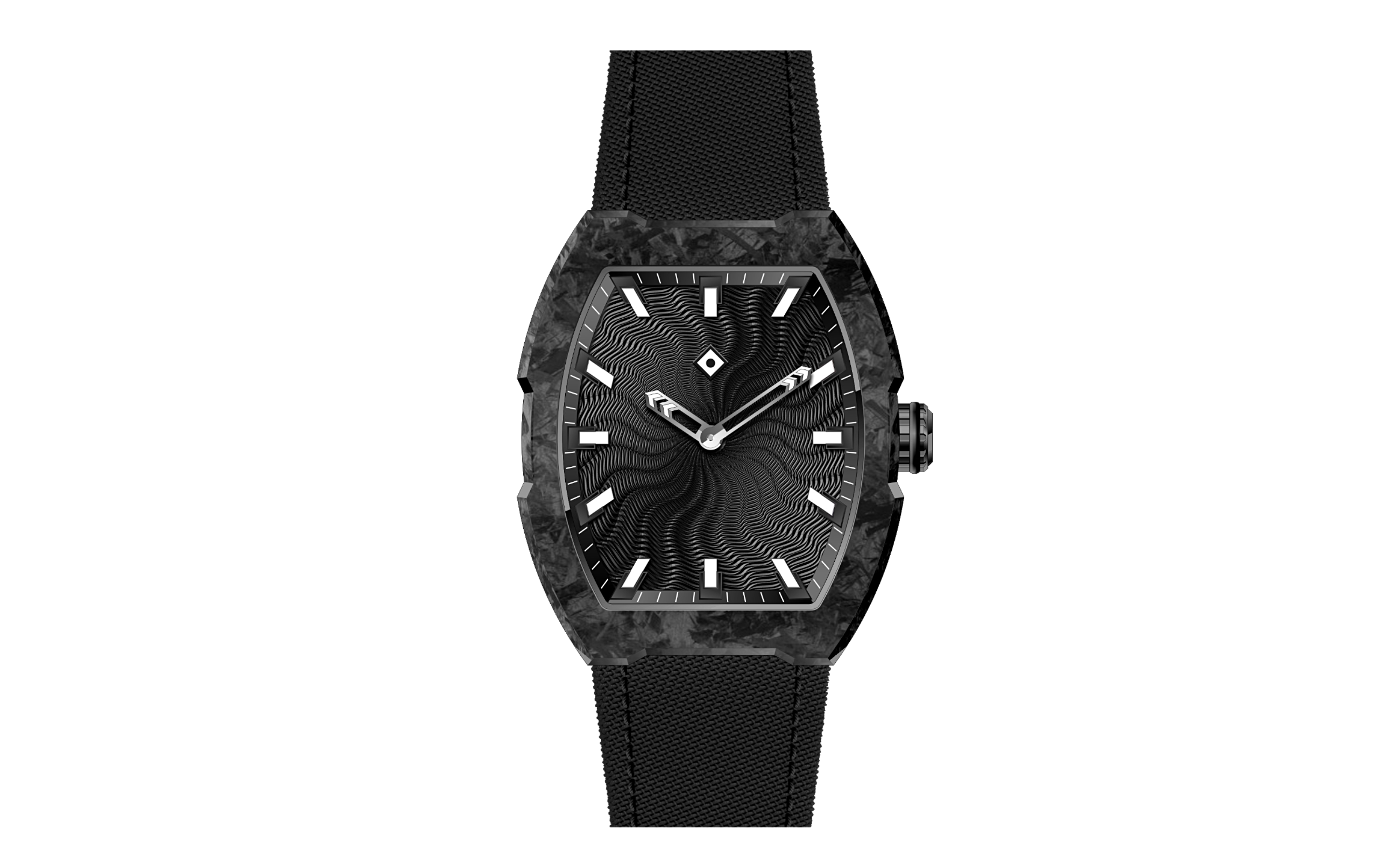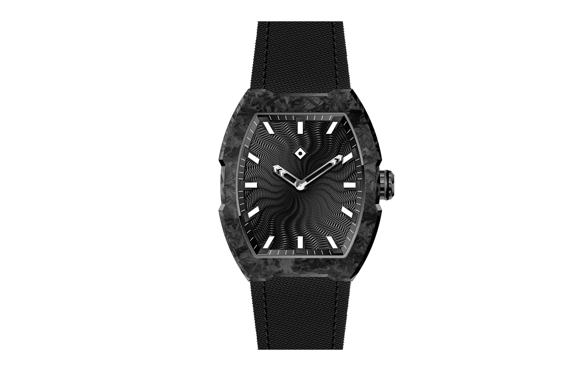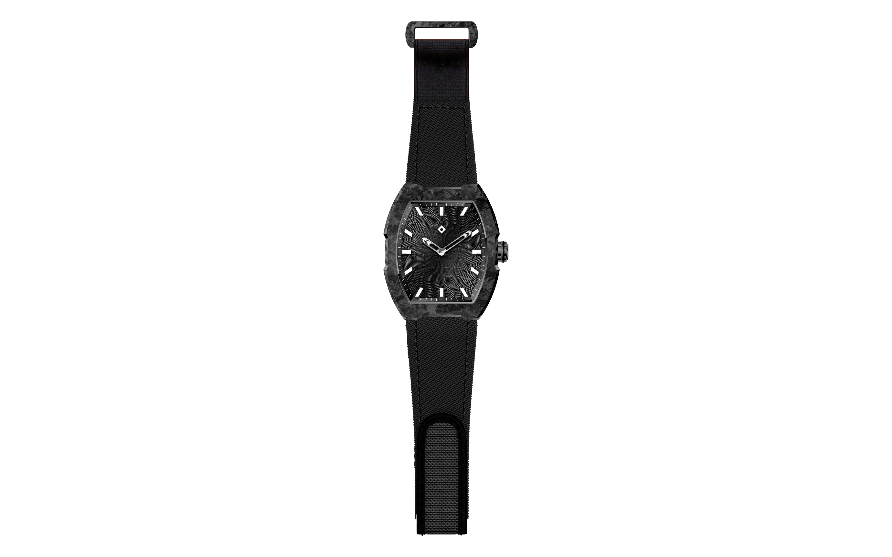 Het eerste sportmodel in de collectie, de NOVA Carbone, is een tonvormig horloge.