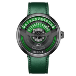 De vernieuwde INFINITY I verandert de manier waarop de tijd wordt weergegeven door gebruik te maken van de klassieke toerenteller van vintage motorfietsen. De index is gelijkmatig verdeeld over het bovenste gedeelte van de wijzerplaat (120 graden), waarbij de minuten-, uren- en secondenindex van buiten naar binnen zijn geplaatst. Naarmate de tijd verstrijkt, verschuiven de wijzers alsof ze het gaspedaal intrappen. Met dit ontwerp brengt de Infinity 1 de elegantie van vintage motorfietsen naar uw pols.