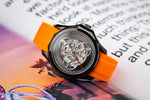 Dompel uzelf onder in tijdloze elegantie met het Eon Noir horloge, een juweel uit de Omnis Temporelle Collectie. Ontworpen om liefhebbers van avant-gardistisch design te bekoren, vertegenwoordigt de Eon Noir de perfecte mix van moderne innovatie en horlogemakerserfgoed. De opvallende, onopvallende wijzerplaat, behandeld met een zwarte PVD-coating, onthult complexe en fascinerende mechanieken, die op het ritme van dit functionele meesterwerk kloppen.