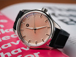 Koraalkleurige wijzerplaat met zwarte band, wat een opvallend en verfijnd contrast biedt.