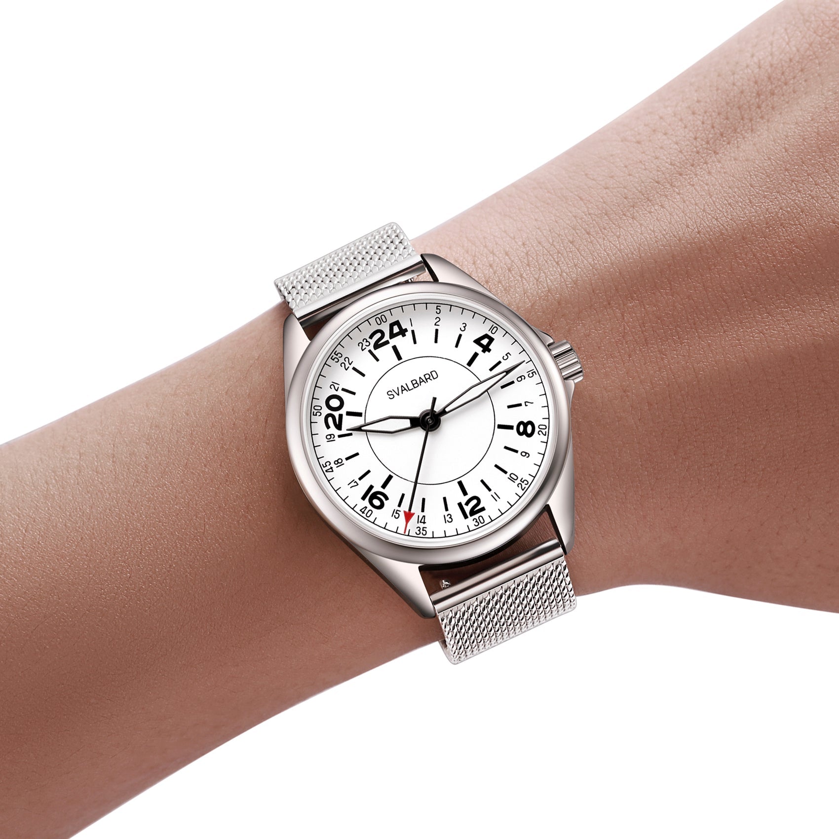 • Keuze uit band : Eenvoudige zwarte of bruine leren of stalen mesh band