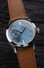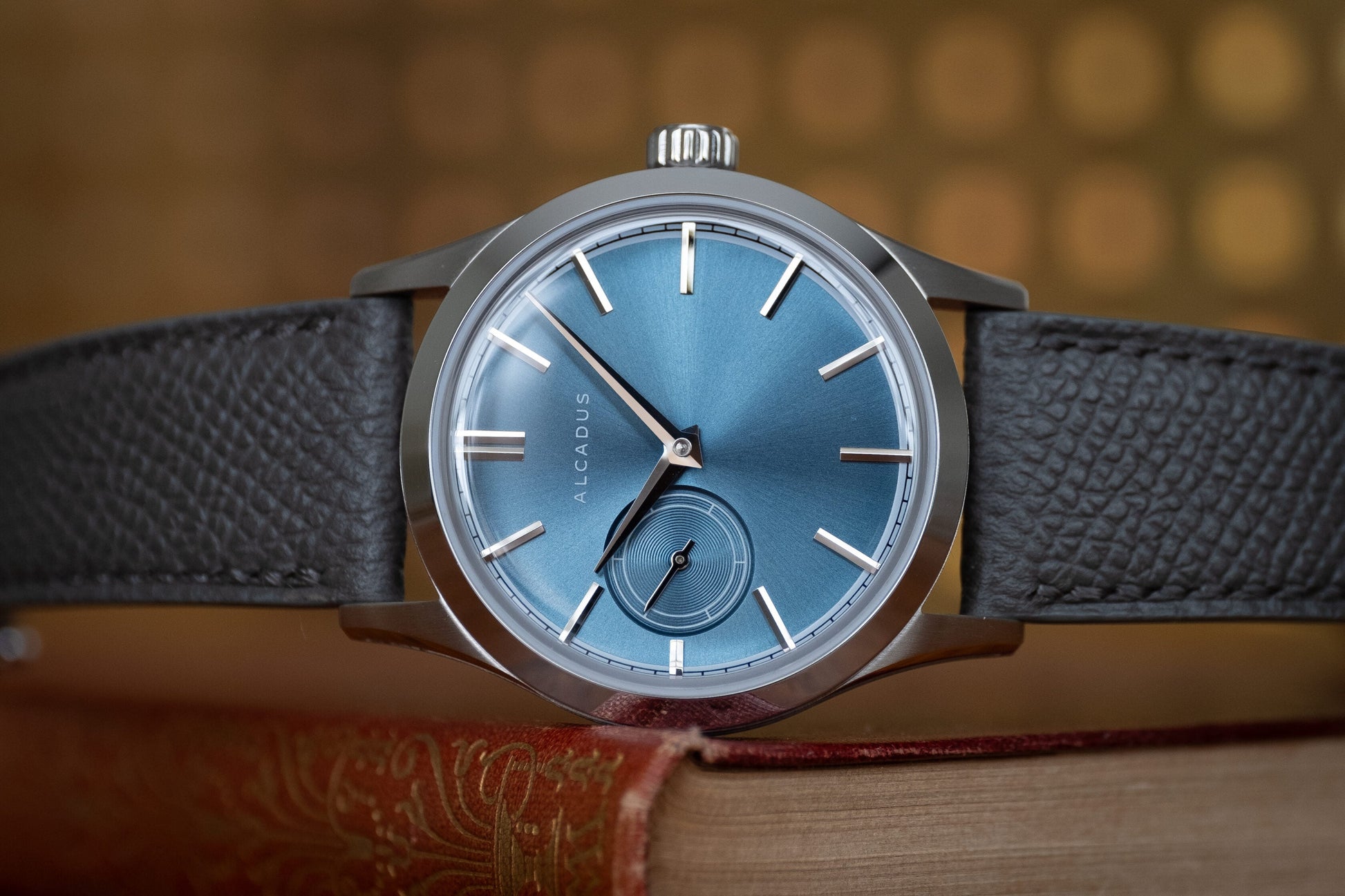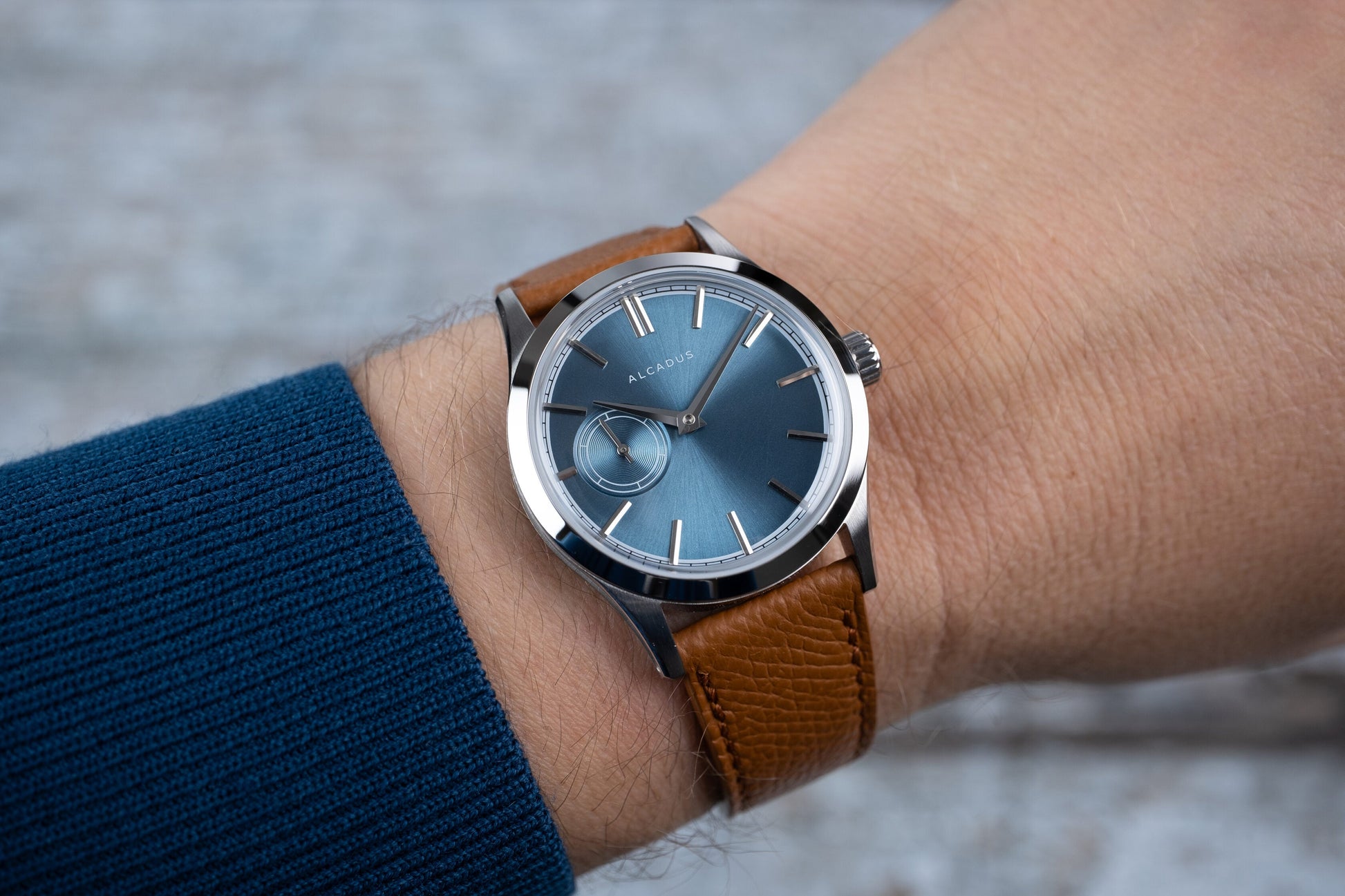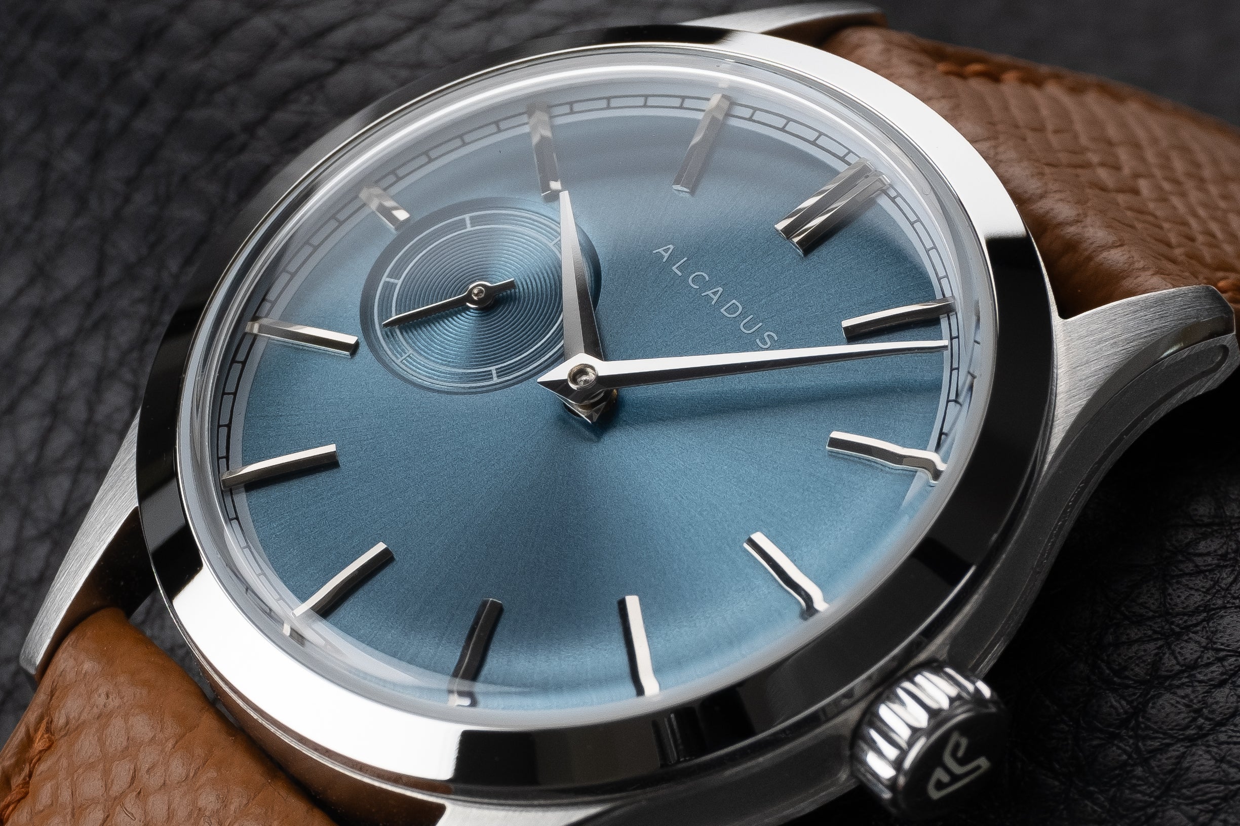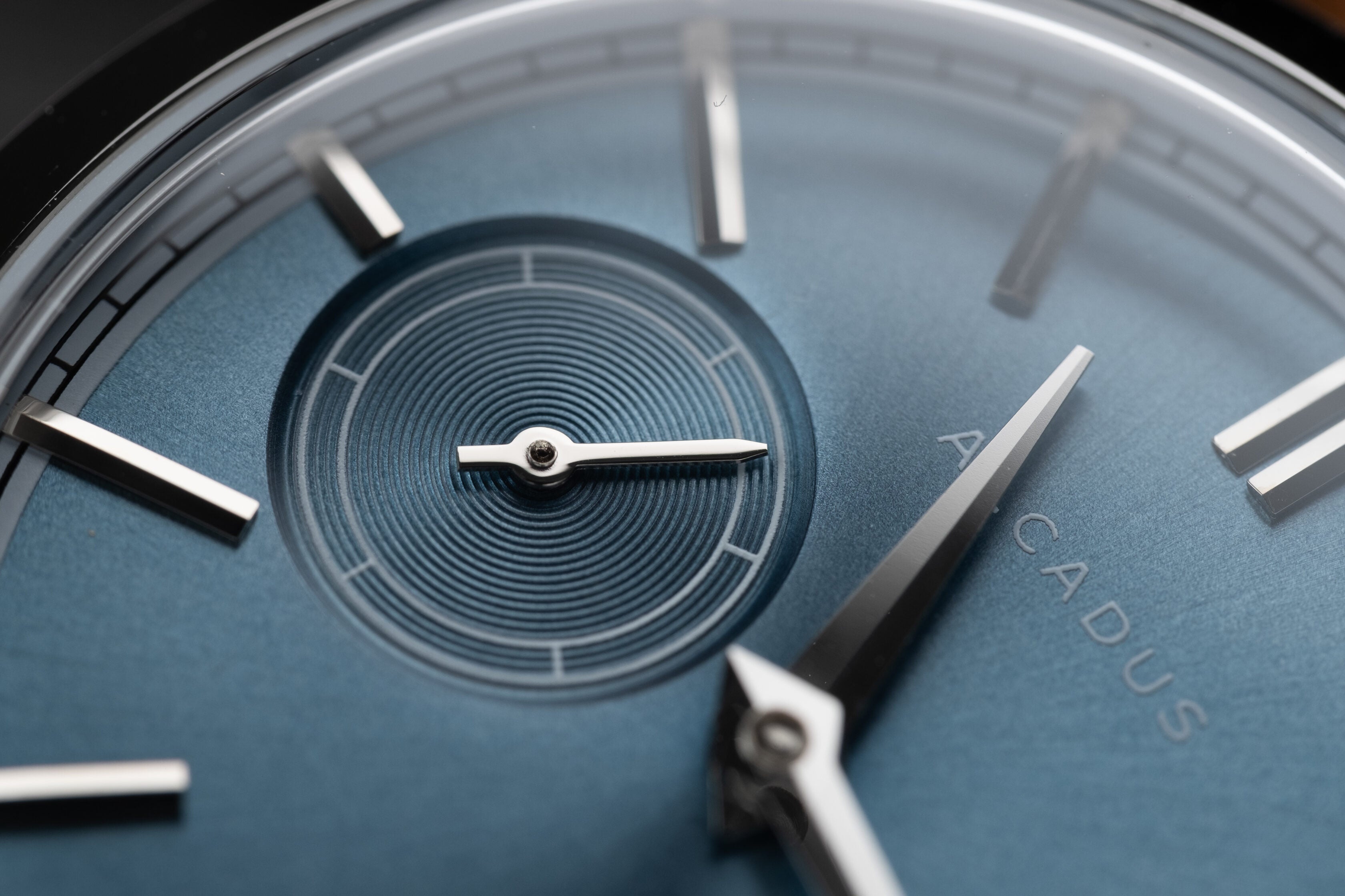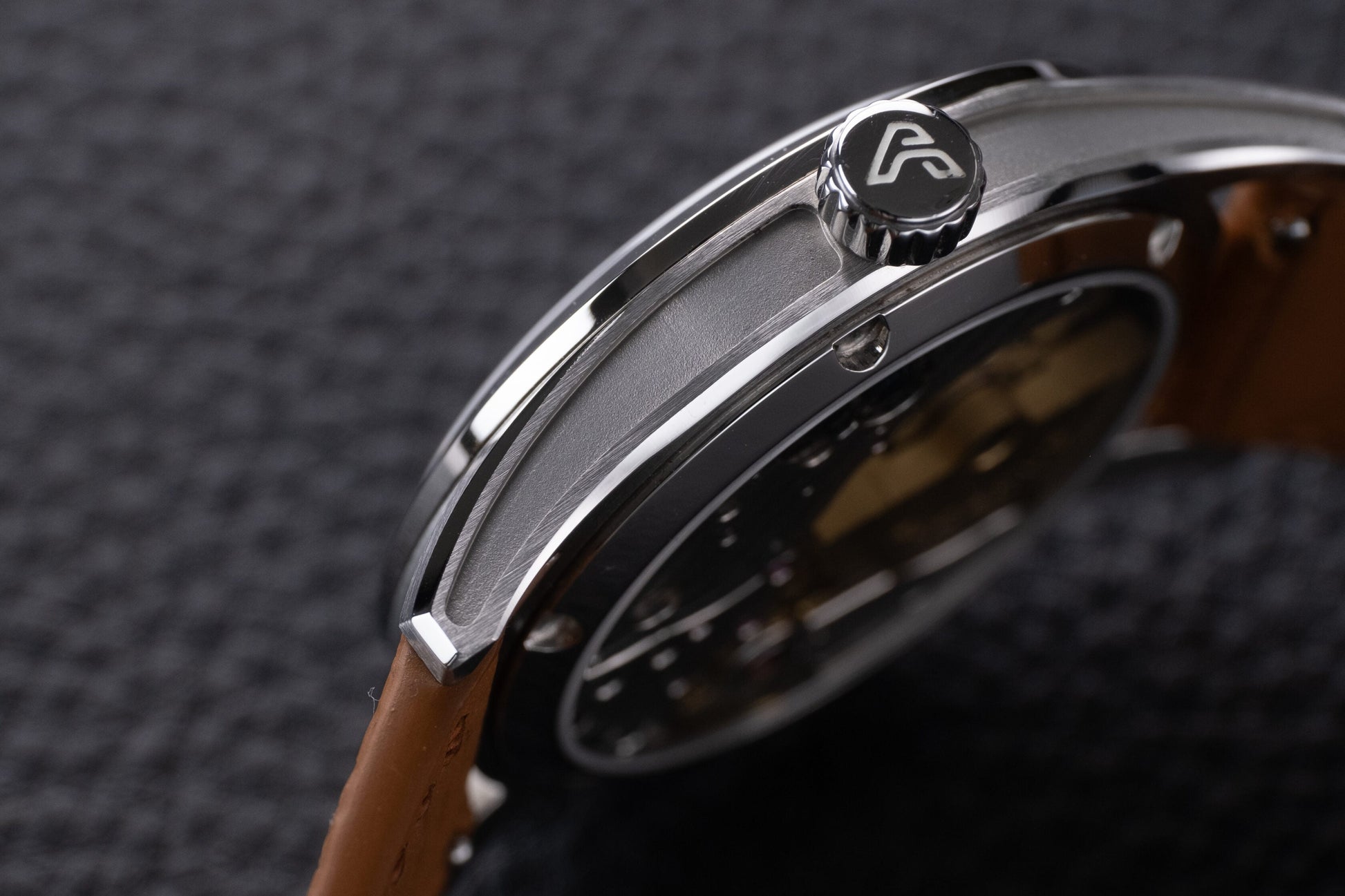 De 36 mm roestvrijstalen kast heeft een zeer gepolijste lunette, een verticaal geborstelde afwerking op de hoorns en een zandstraalafwerking op het CNC-gefreesde, verzonken centrale deel.