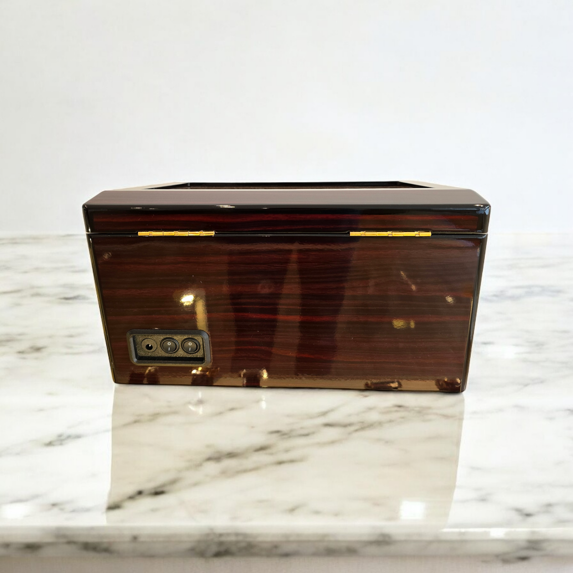 Een watchwinder is een apparaat dat is ontworpen om automatische horloges te laten lopen wanneer ze niet worden gedragen. Het simuleert polsbewegingen om ervoor te zorgen dat het horloge nauwkeurig de tijd aangeeft. Dit verfijnde model heeft een gepolijste houten afwerking met een beige binnenkant, wat optimale bescherming en een verfijnde stijl biedt. De kast kan tot vier horloges opwinden en biedt tevens opbergruimte voor andere sieraden. Functionaliteit wordt gecombineerd met elegante esthetiek, perfect voor verzamelaars en liefhebbers van luxe horloges.