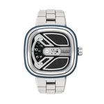 De M1B/01 belichaamt de relaxte maar verfijnde weekendstijl – een combinatie van kunstzinnig contrasterende materialen, geïnspireerd door industriële merken, maar met een uitgesproken futuristische twist, wat resulteert in een moderne klassieker. De interface met meerdere niveaus is voorzien van een iconisch schijftijdsysteem en twee diepe platen met reliëfpatroon. De gezandstraalde blauwe animatiering en het exclusieve denim bandje maken de passende toon compleet.