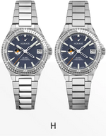 - Lokale wijzer met lichtgevende behandeling, uur-, minuut-, centrale secondewijzer, GMT- en gangreserve-indicator.