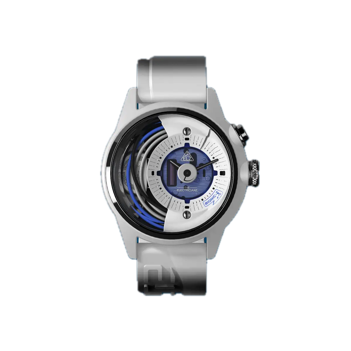 De gelaagde wijzerplaat, met zijn prachtige semi-transparante blauwe plaat en vijf levendig gekleurde elektrische kabels, is ontworpen om uw zintuigen te boeien